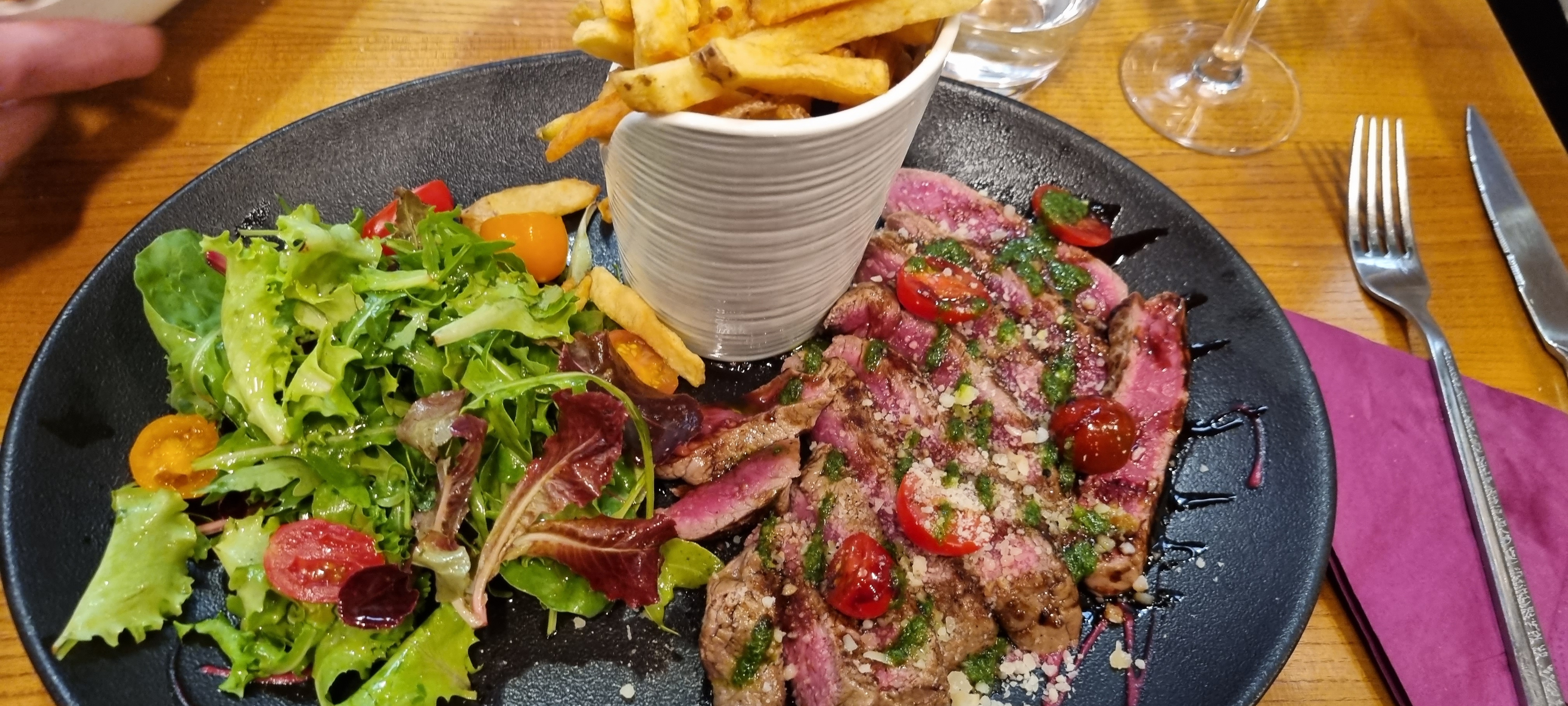 Première fois que je découvre l'établissement avec mes parents. La déco est simple et efficasse. Merci à Julien qui nous accueille et nous sert dans la bonne humeur. La carte est complète et tout le monde trouve son bonheur. Les quantités sont généreuses. Mon entrecôte était très tendre et tennait dans toute l'assiète ! La panacotta est servie avec des fruits frais. Bon courrage et bonne continuation à toute l'équipe et merci pour ce moment chaleureux Comme promis je reviendrai prochainement pour continuer de découvrir la carte