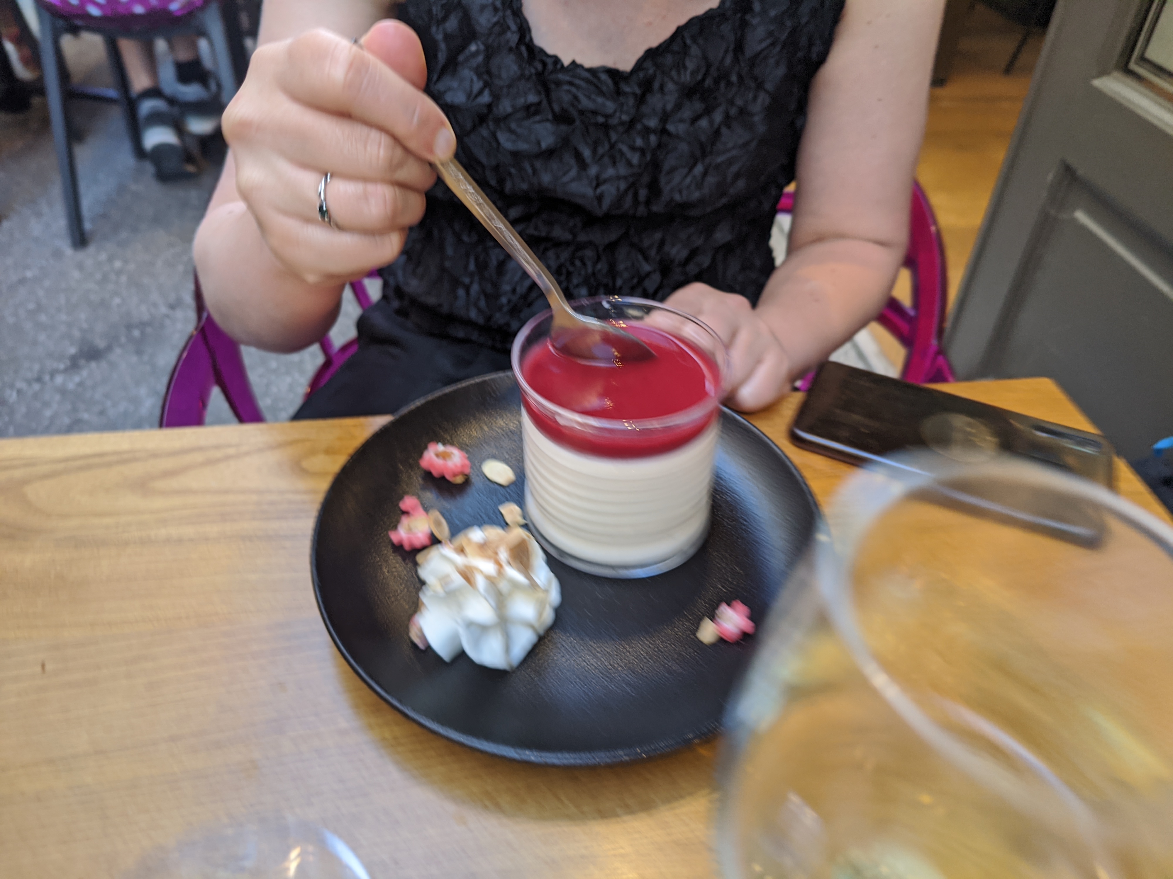 Le vin était bon… Pour le reste, j’étais venu pour les couteaux en entrée, il n’y en avait pas… bon, ça peut arriver. Le tartare de veau (23€) coupé trop gros est dur à mâcher, son accompagnement, un écrasé de pdt, est vraiment insipide. Où est la moelle ? Le cacao amer ? On ne sent rien de tout ça. Le pire: le dessert. Un millefeuille vanille marron au descriptif alléchant là encore. (9€) Traduction: trois rectangles de pâte feuilletée séparés par de la chantilly… où est la crème de marron ? Le marron grillé ? 44€ le tout. Tellement déçu 😢