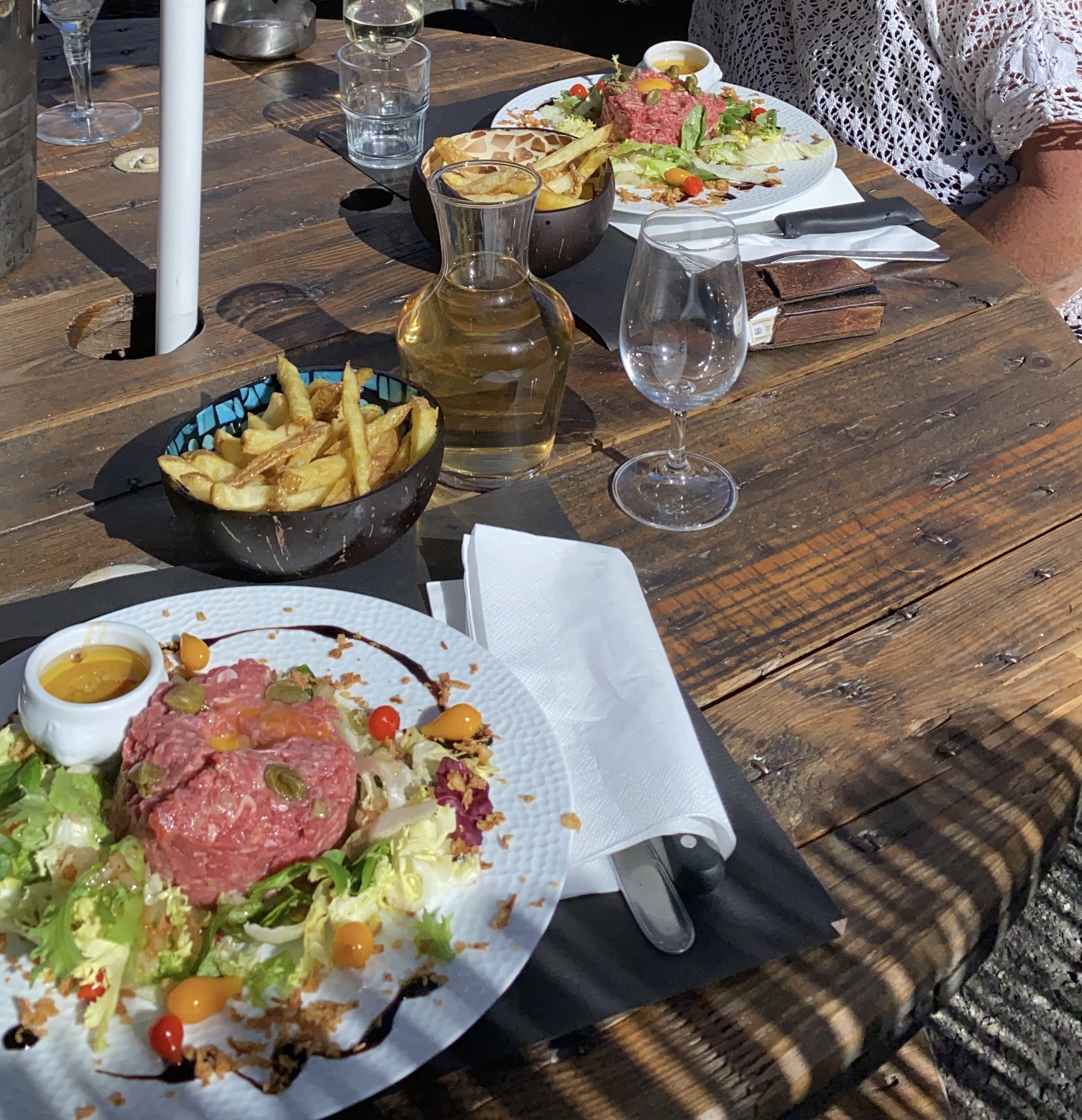 En terrasse, bon morceau de boeuf.frites maison.