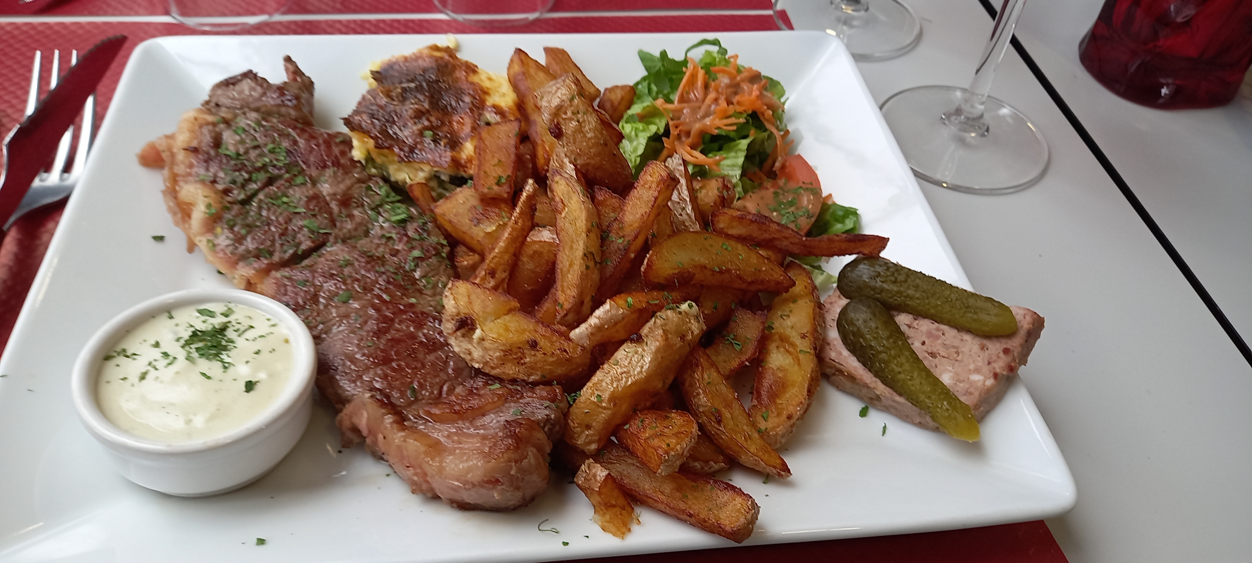 Le repas était très bon, le faux filet était vraiment excellent et très tendre, le dessert au caramel beurre salé fait maison était un régal. Les assiettes sont copieuses. Le patron et son fils sont très sympathiques. Si nous revenons dans la région, nous n'hésiterons pas à y revenir.