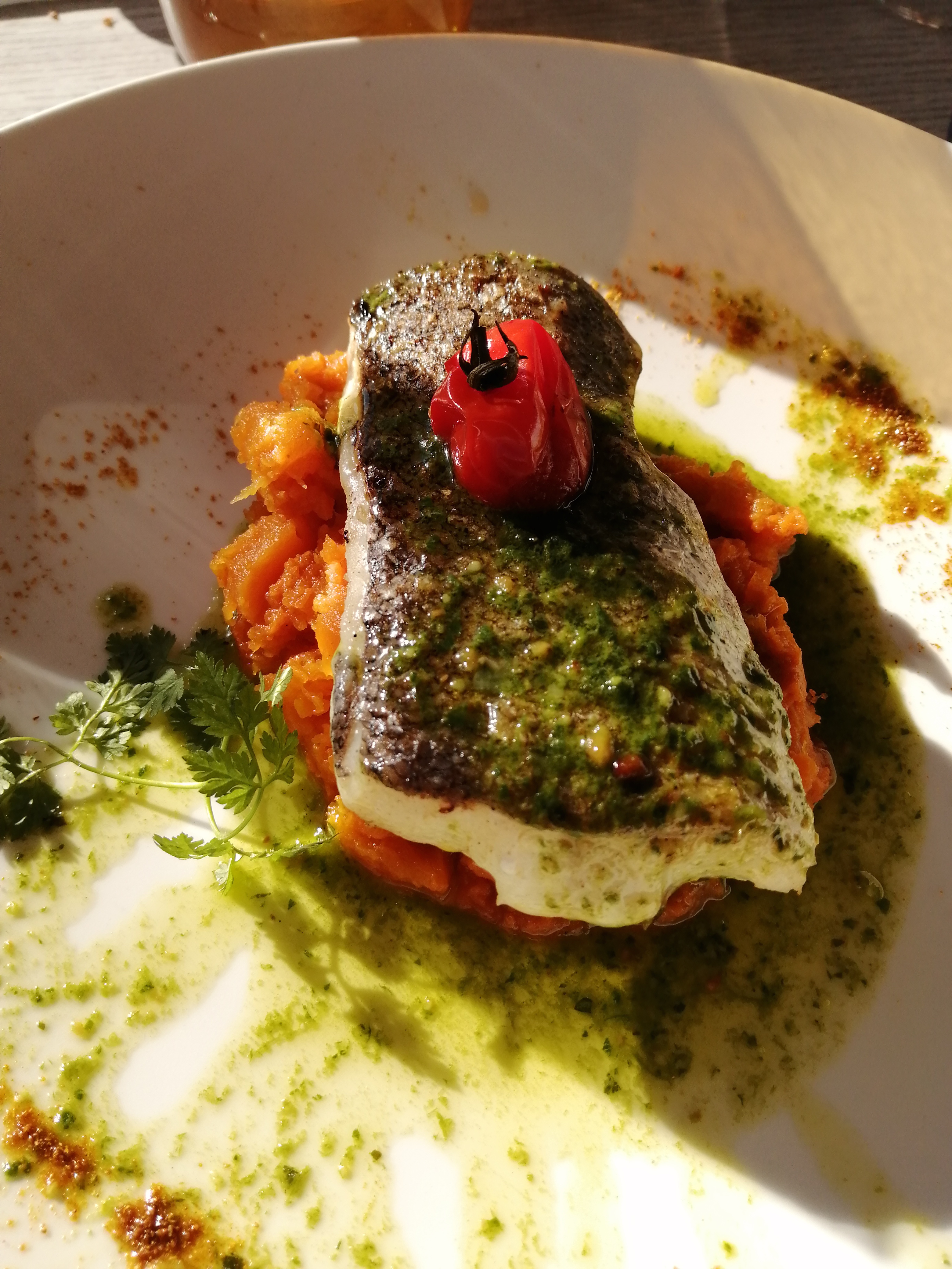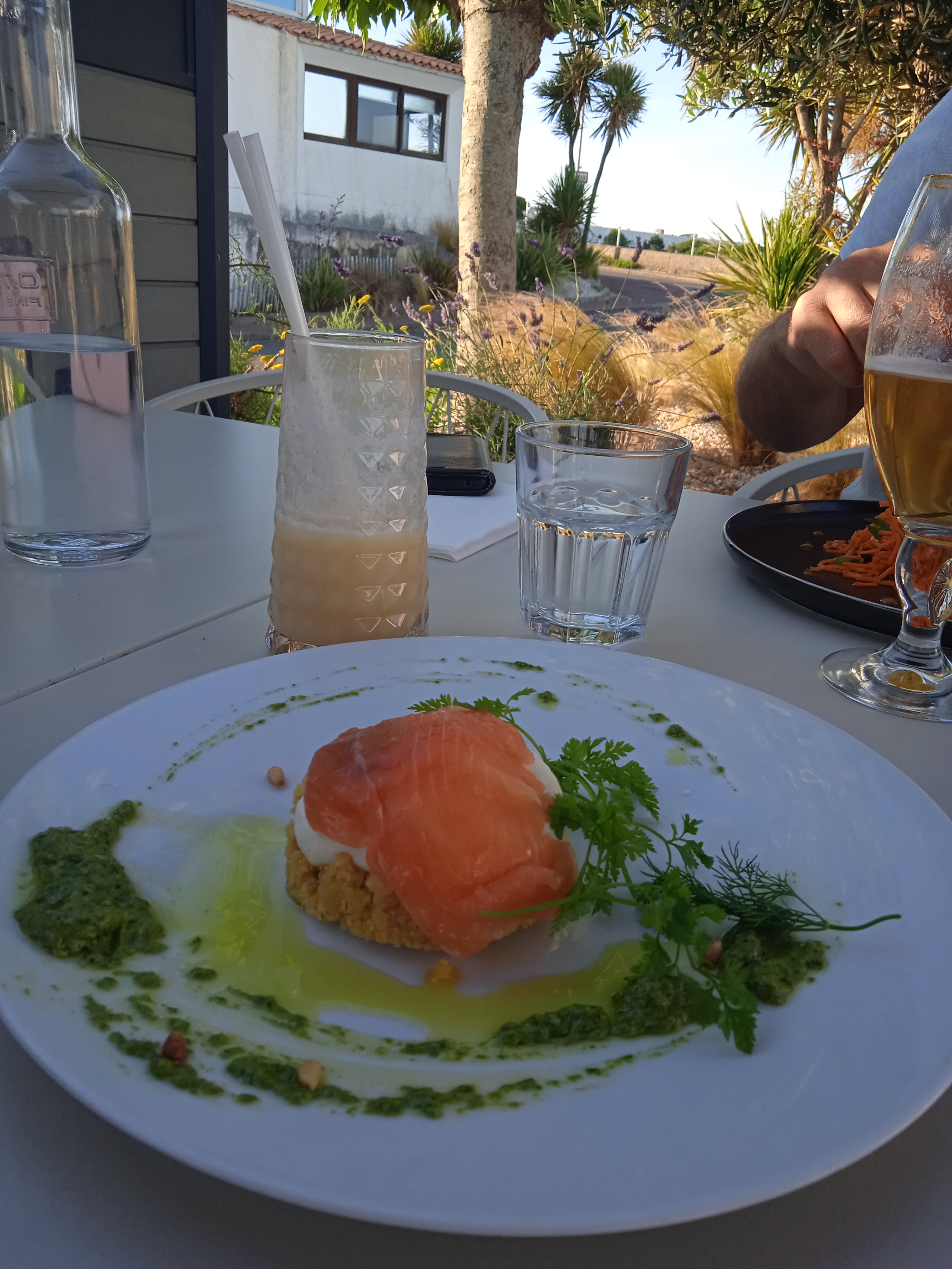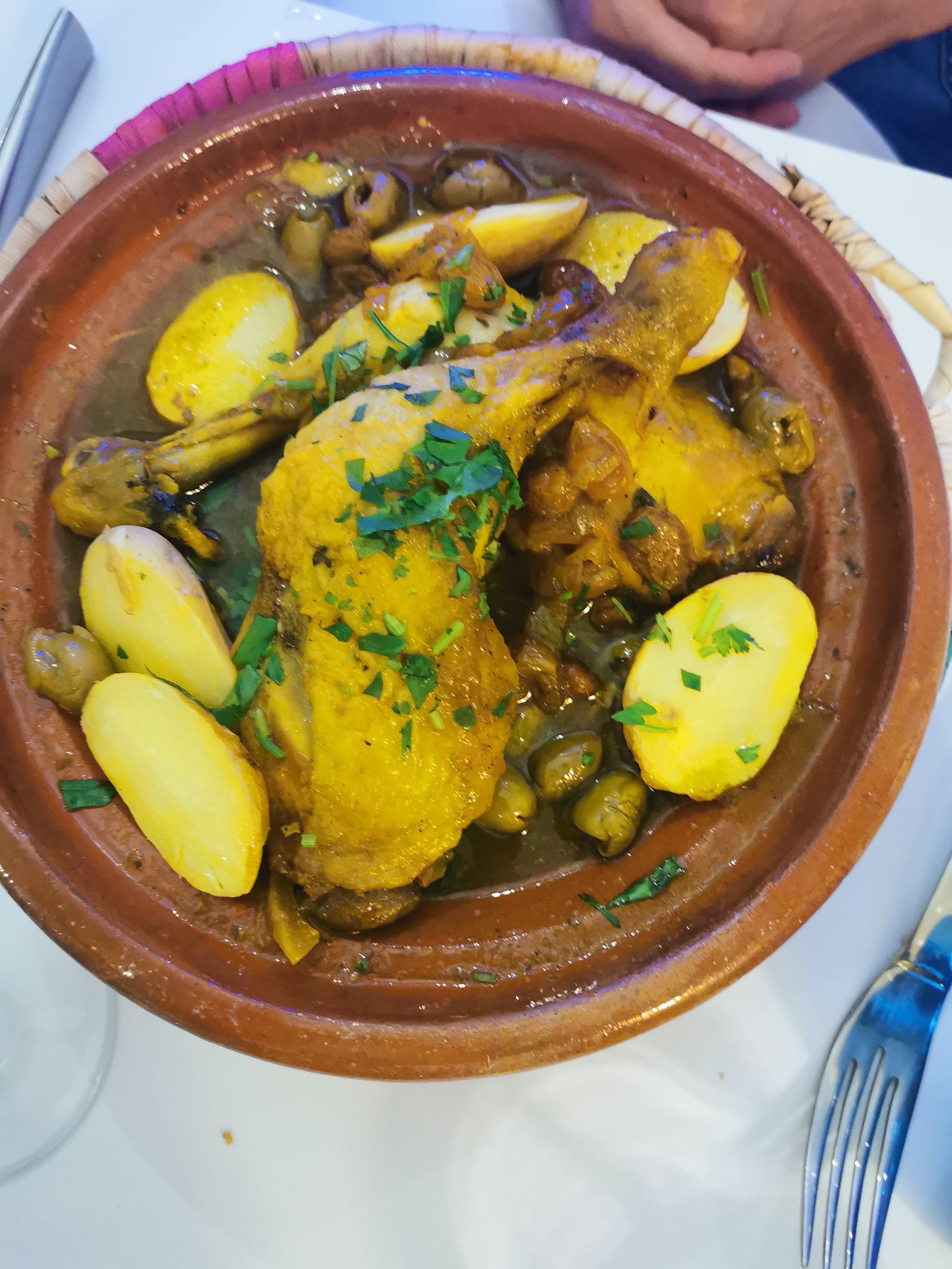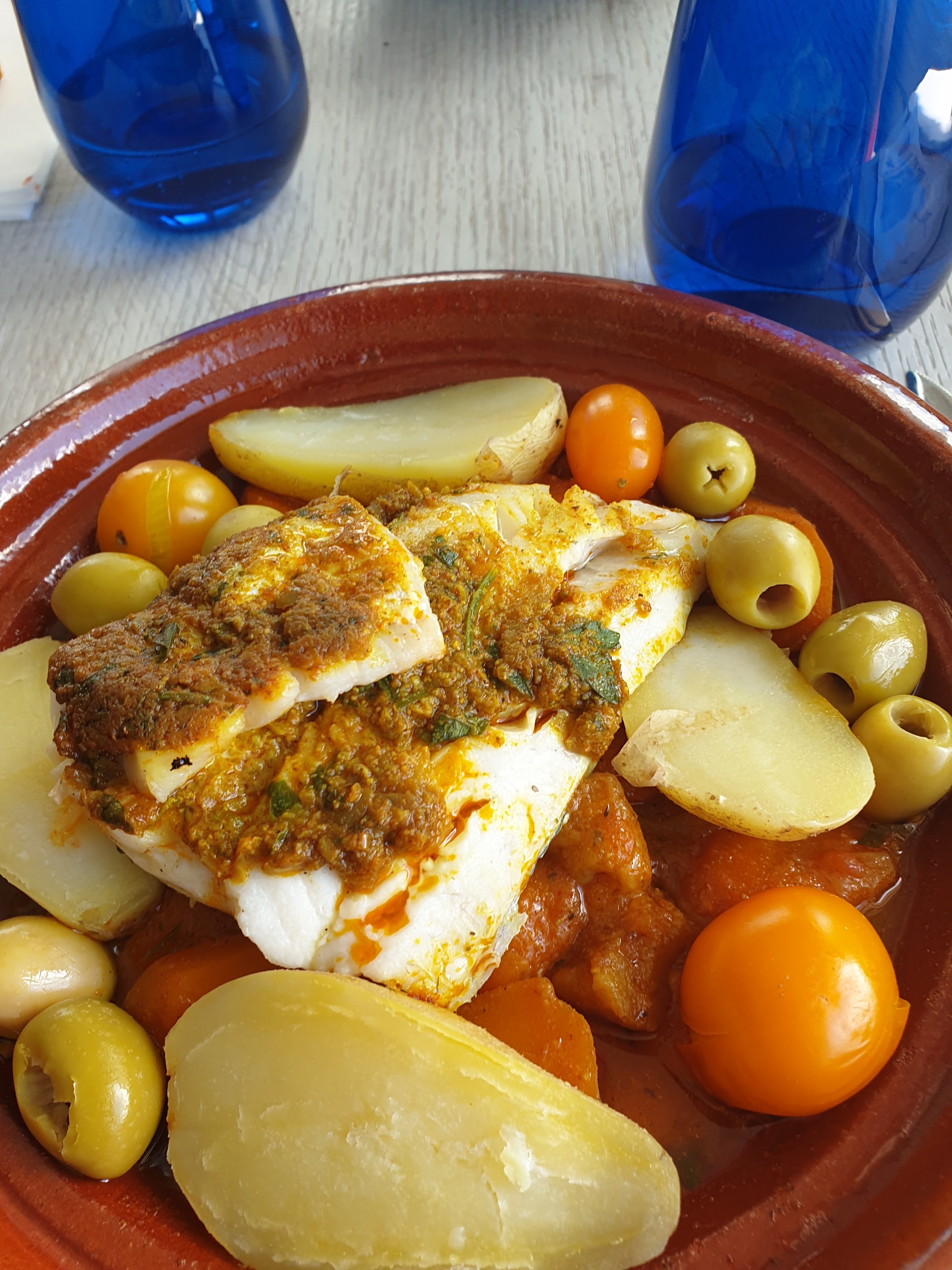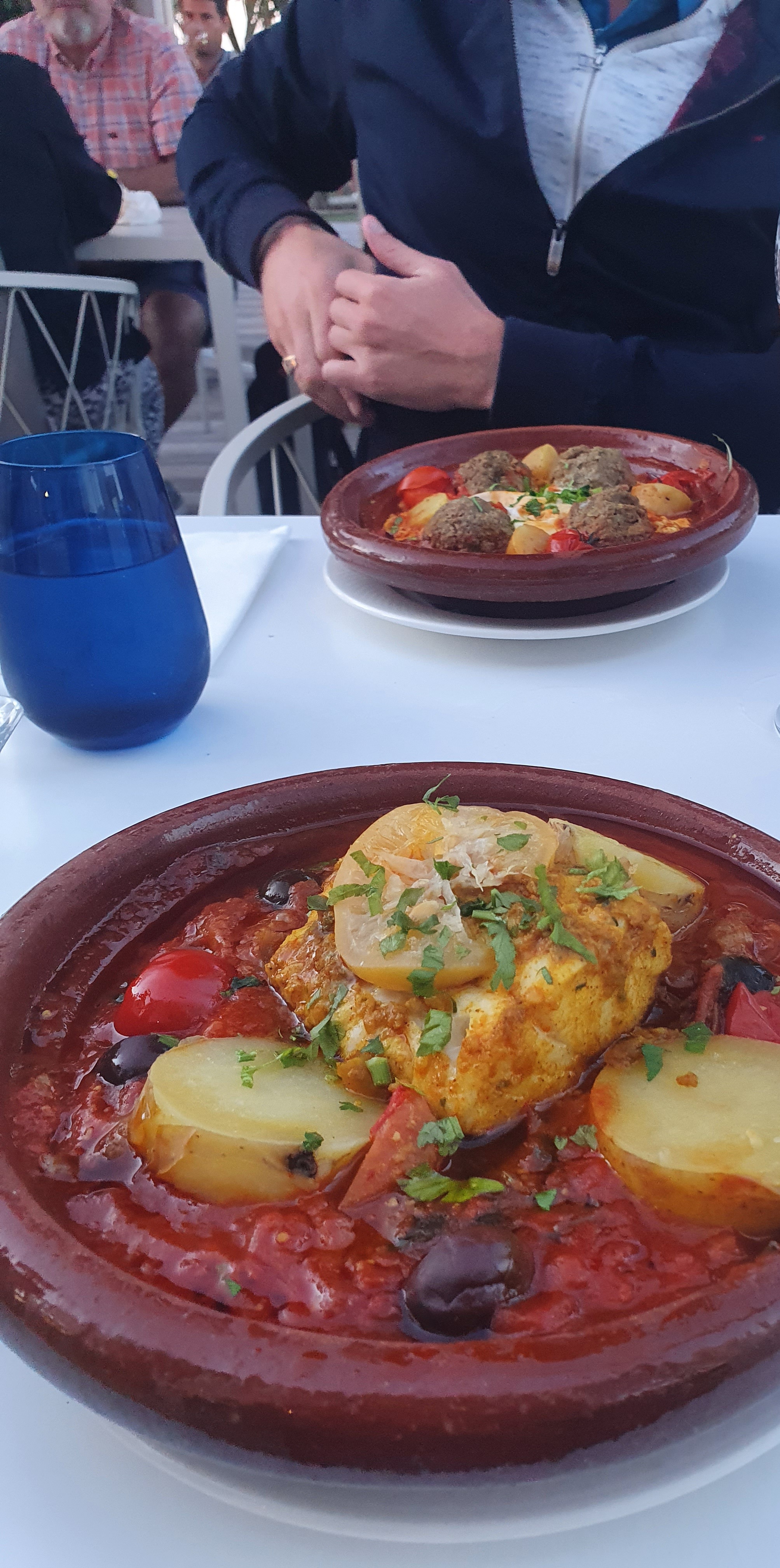 Restaurant très bien situé, décoration soigné et ce bel olivier qui vous annonce les prémisses d une soirée tout en saveurs. Le patron très présent et une équipe en salle dynamique et à l écoute.Un tajine de poisson parfait. L entrée une gourmandise avec sucre et sel subtilement accommoder.Le dessert avec ce sorbet aux herbes...Bel surprise pour nos yeux, notre odorat et notre palais. Que dire de plus, c était parfait et nous reviendrons c est sûr.