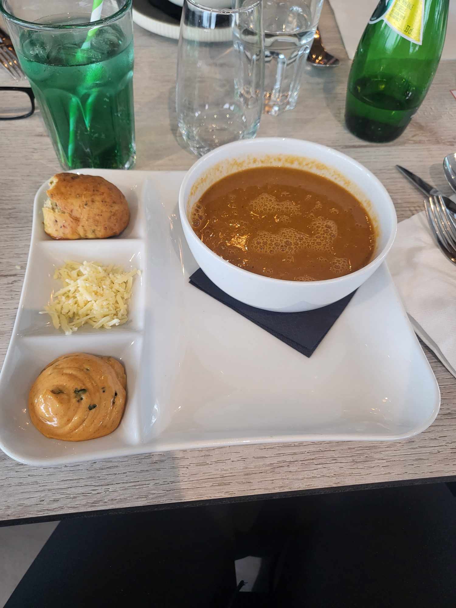 Soupe de poissons bonne accompagné de pain à l'origan, je n'ai pas aimé cette épice, peu de fromage râpé, la rouille était bonne. Assiette de bulots correcte, présence d'une épice qui surprend et qui ne plaît à tous (du piment je crois). Le restaurant est grand il y a 2 salles mais une était complète et nous avons été mis dans l'autre salle où il n'y avait que 2 autres personnes, du coup ambiance tres calme, nous nous sommes sentis un peu seul. Le restaurateur convient qu'il aurait mieux valu refuser ces 2 dernières réservations puisque sa première salle était complète.