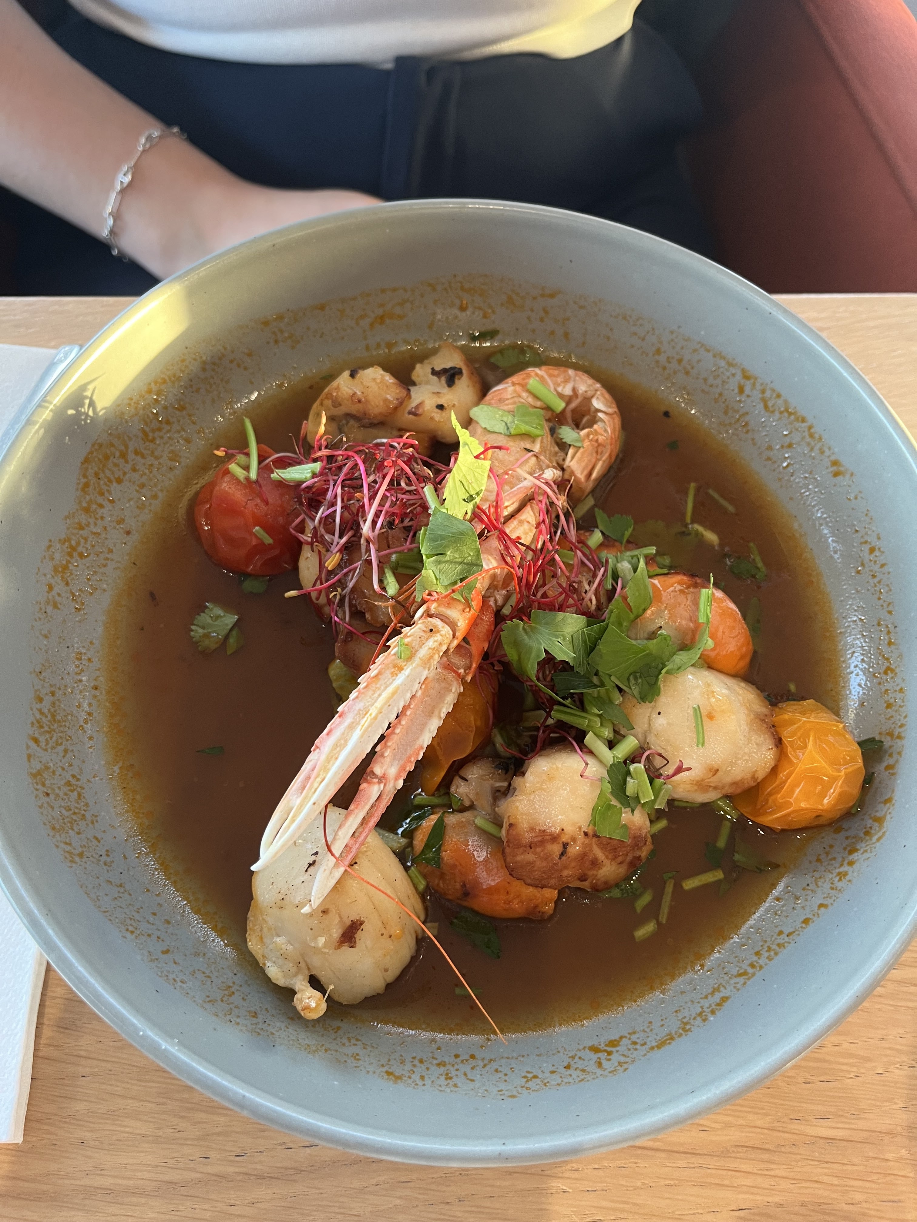 En arrivant un monsieur a l'entrée lève à peine les yeux de son téléphone pour me demander de m'adresser au serveurs près du bar afin de trouver ma réservation. Mauvais départ. Cependant les serveurs sont agréables. Le cadre est chouette avec une belle vue sur le port. Concernant les plats, c'est très bons, bien présenté et consistant. La soupe de poisson est copieuse. Le poisson est frais et savoureux. Gros bémol pour la crème brûlée, j'étais un peu déçue qu'elle soit servie froide (crème et caramel) et non tiède avec la croûte chaude. Une bonne surprise pour la tajine du poulet. En résumé ce restaurant est une bonne découverte, les serveurs sont attentifs et avenants, les plats sont gourmands et jolies. Je reviendrai avec plaisir.