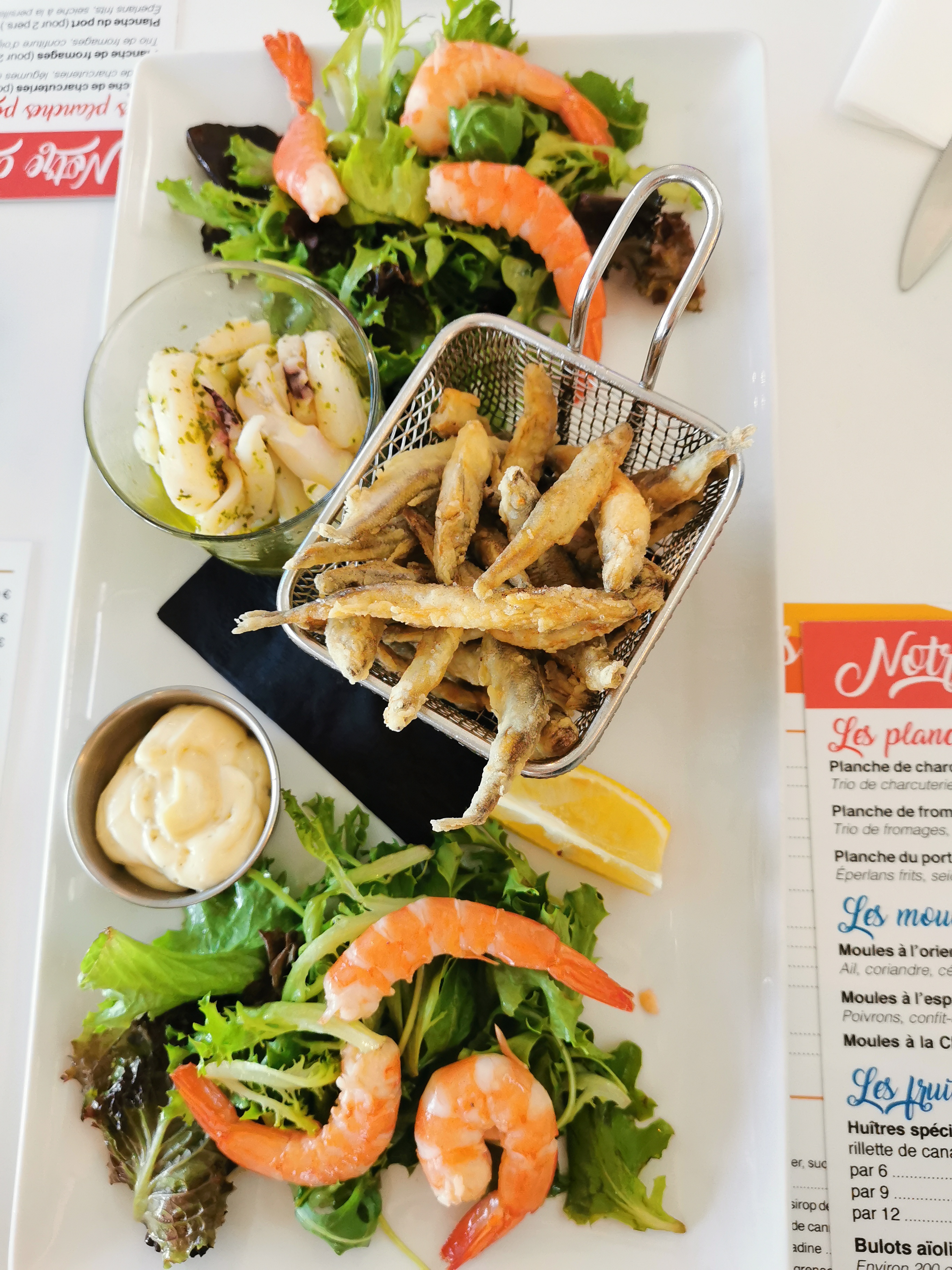 Très bonne expérience. Pour les adultes notre choix fut couscous 3 viandes et tajine poissons (selon arrivage) Pour les enfants, beaucoup de choix. Fish and chips ou suprême de volaille ou couscous. Les enfants ont choisi couscous, très copieux et joliment présenté. En dessert ils ont pris mousse au chocolat pour l'un, fromage blanc pour l'autre, copieux! En annexes: Sanitaire très propres Personnel souriant Vue sur le port ou la grande roue