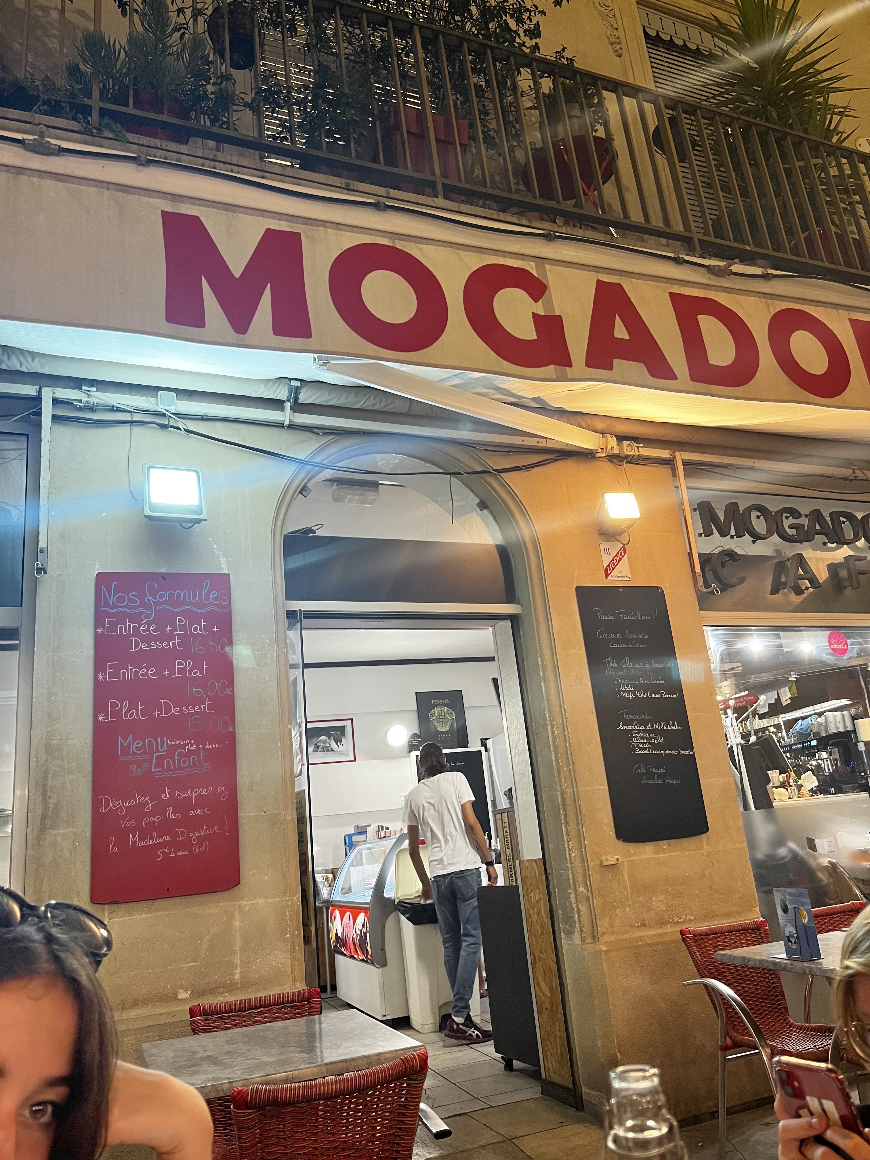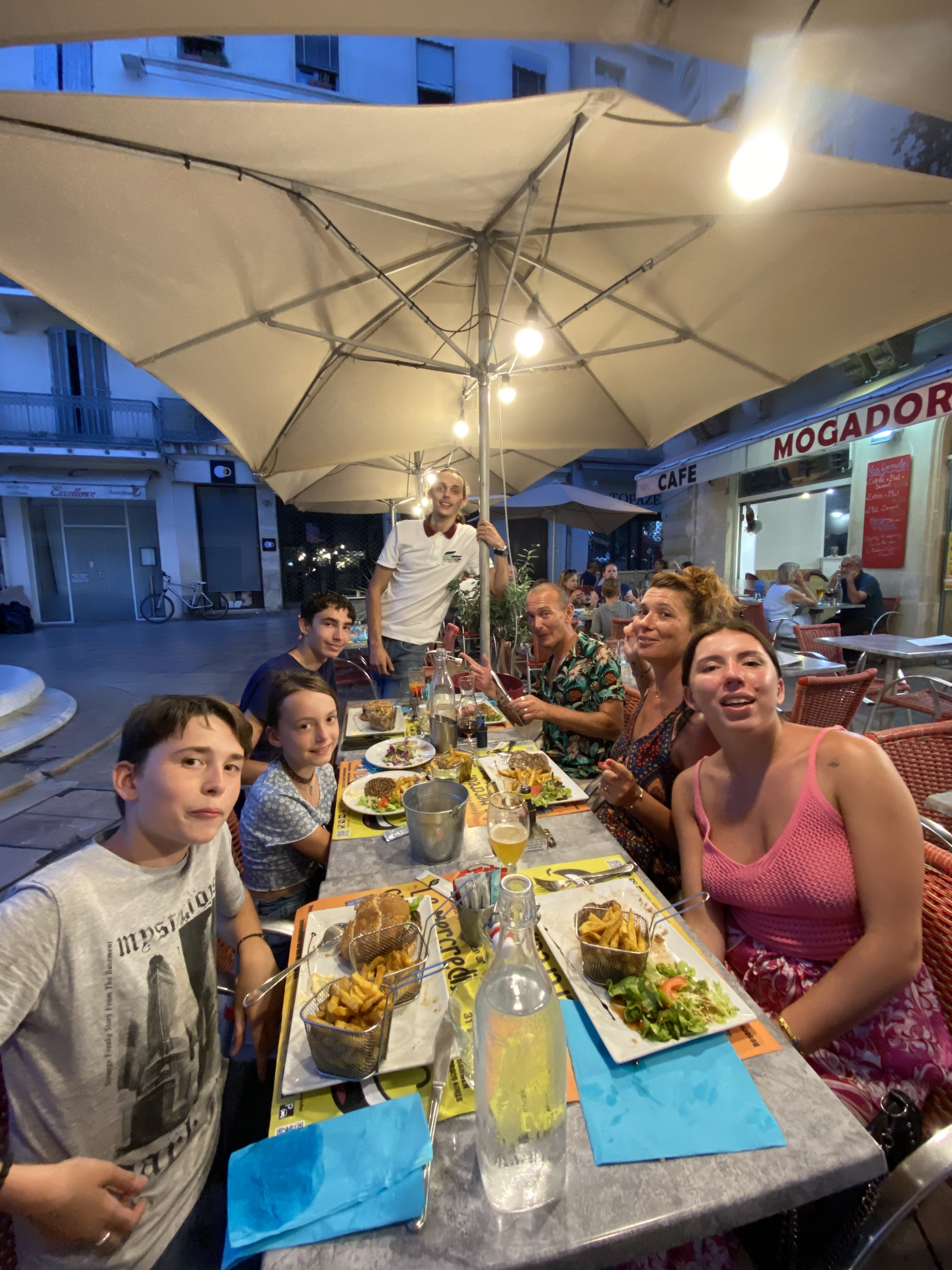 repas en famille ce jeudi 8 août après la visite des arènes de Nime ,on a trouvé ce resto le mogador café par hasard et on a pas regretté ce choix !!! accueil sympathique ,service impeccable ,3 formules avec entrée, plat, dessert. tout est bon le burger,les frites maison,la viande avec le gratin et courgette, très bien . le service agreable, un patron très sympa ,des prix corrects . je conseille fortement et à refaire si on est à nouveau de passage à Nimes. bravo et un grand merci .
