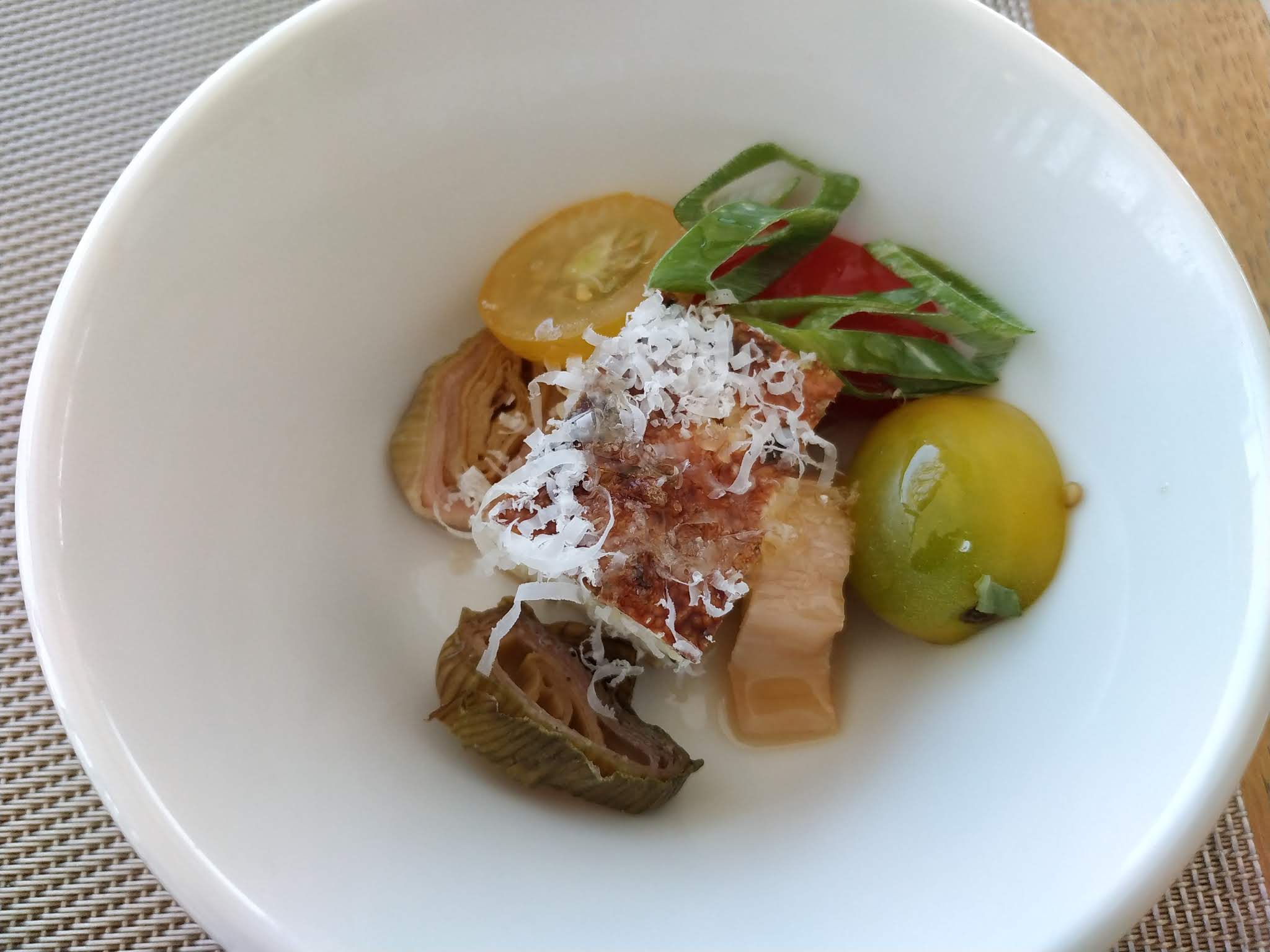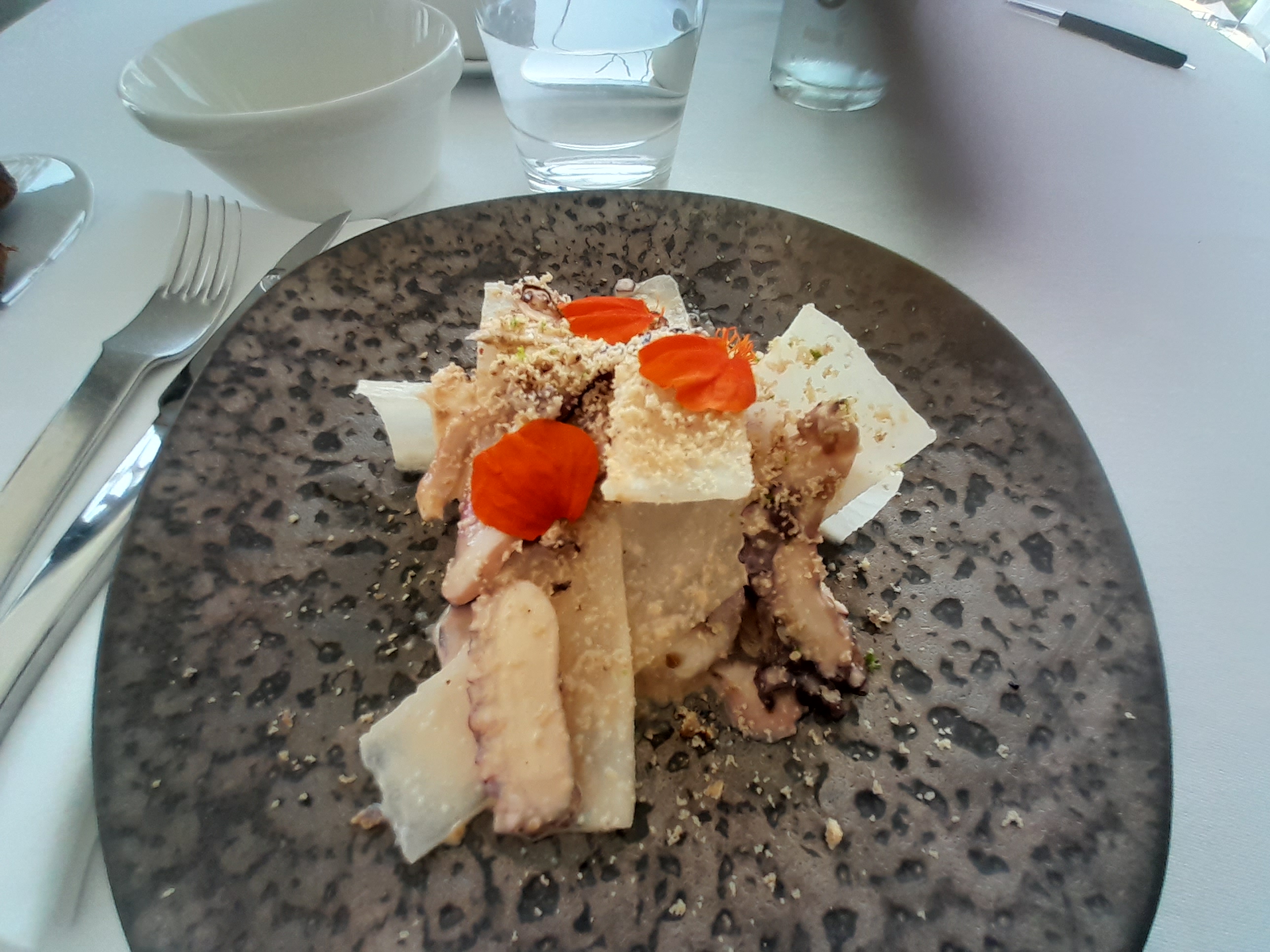 Nul ! Abstraction faite de l’ambiance lugubre - 2 tables de 2 personnes un vendredi soir à 20h ( ça peut arriver) - un rizzo et poulpe grillé, présenté par le serveur comme un rissoto, nul et sans saveur. Pour faire un rissoto avec un riz vénéré, il faut se lever de bonne heure! Je connaissais l’arborio, le carnaroli et le vialone nano… Mais faire un risotto avec un riz vénéré, je ne l’avais encore jamais vu…. Quant au dessert - poire avec sauce suzette - qui semblait sorti tout droit du frigo, j’ai vaguement reconnu un très léger goût de Cointreau…. Un verre de rosé Gavoty ( 10€, avec une robe digne d’un champlure et cramoisey) qui n’avait aucun goût….