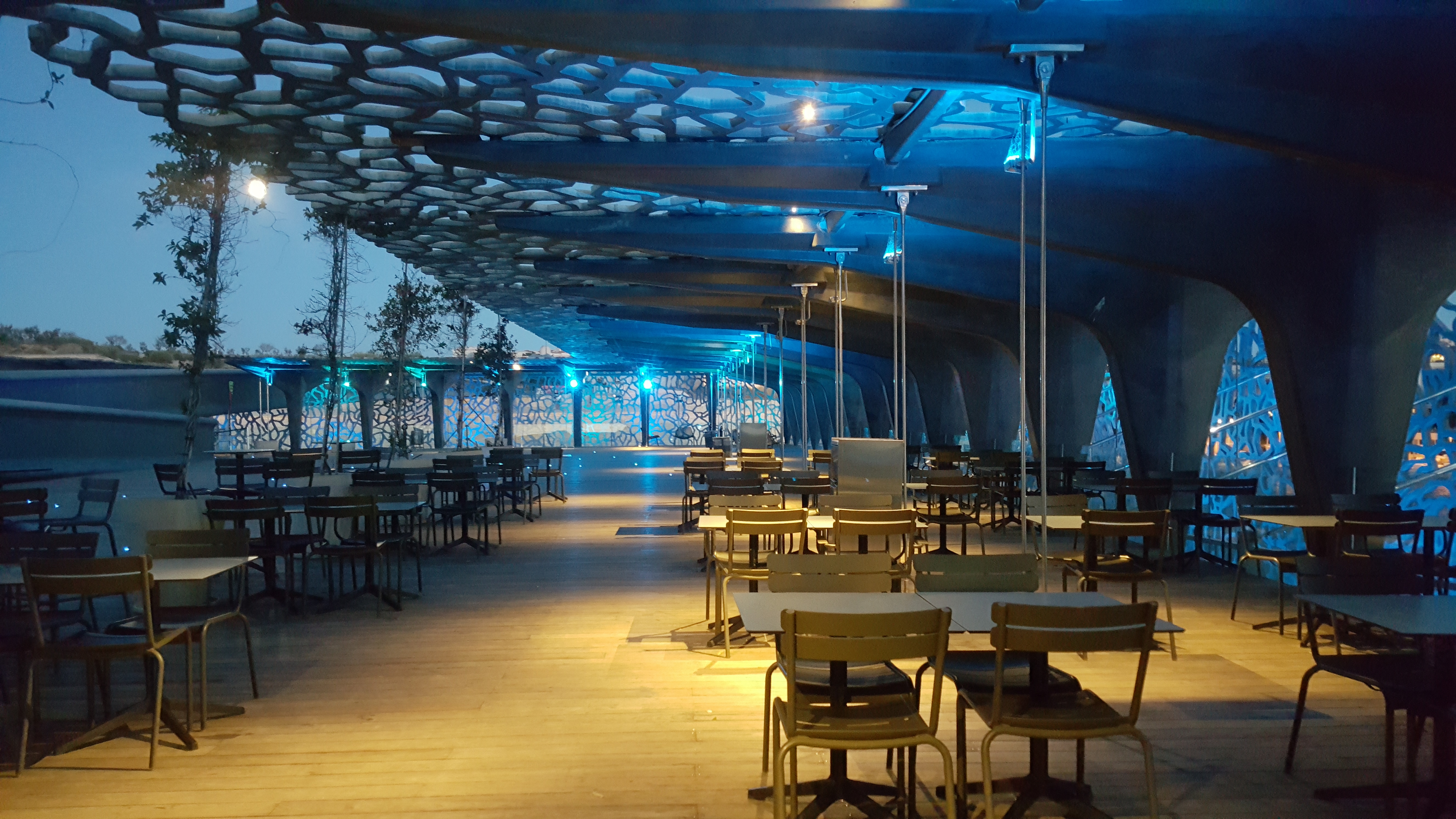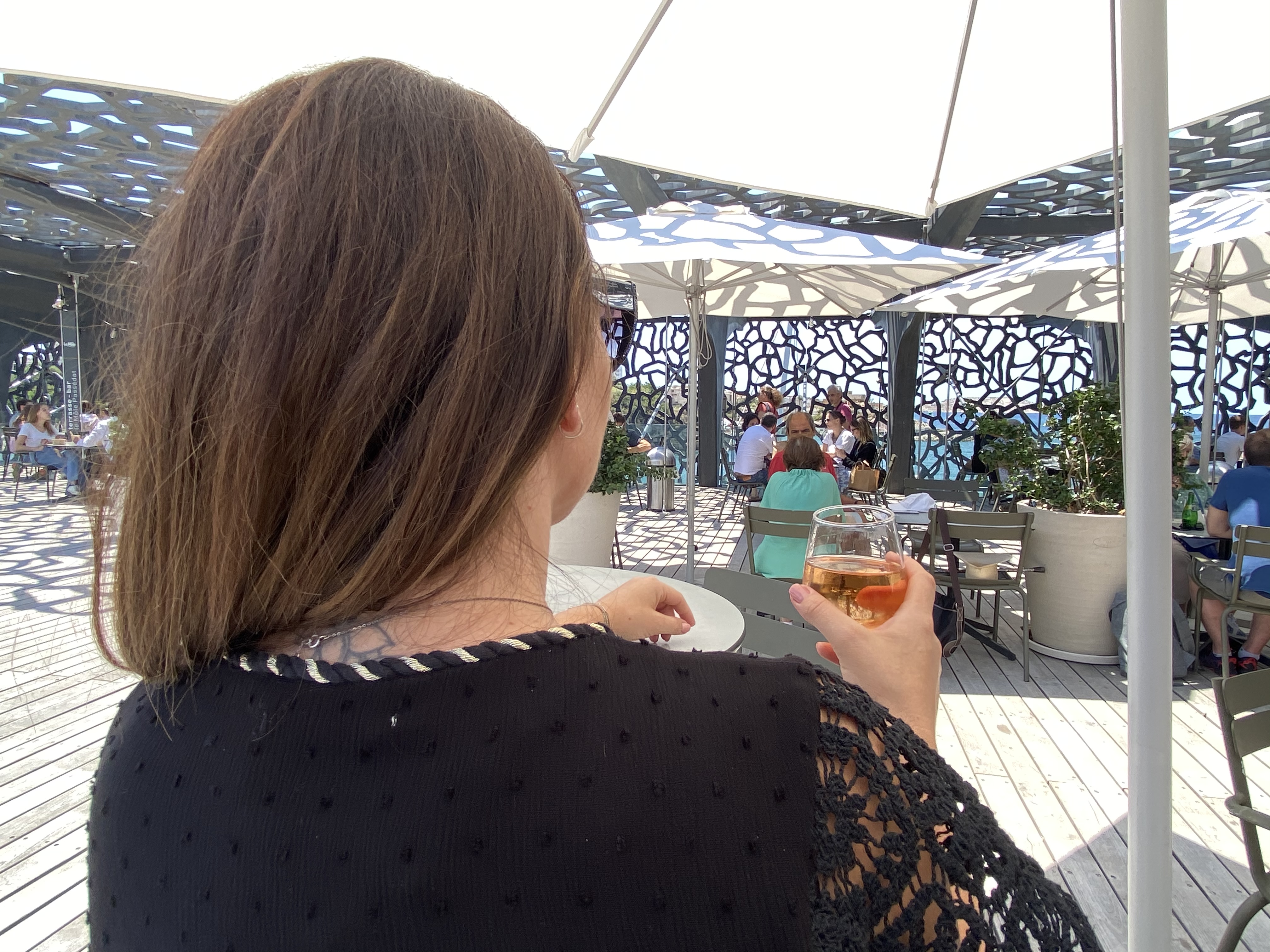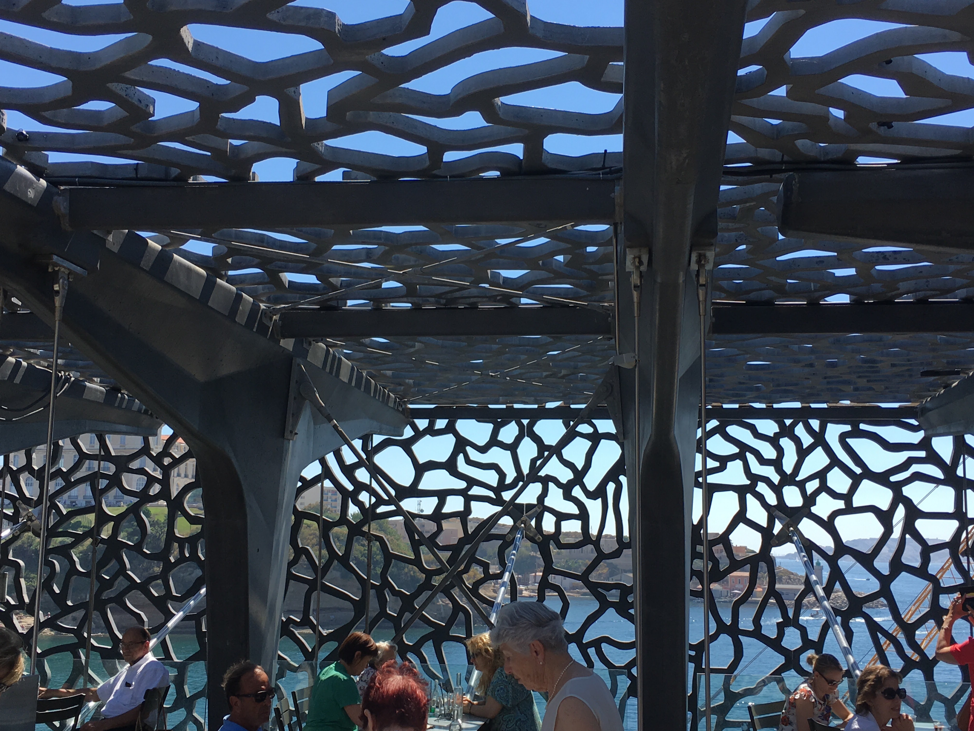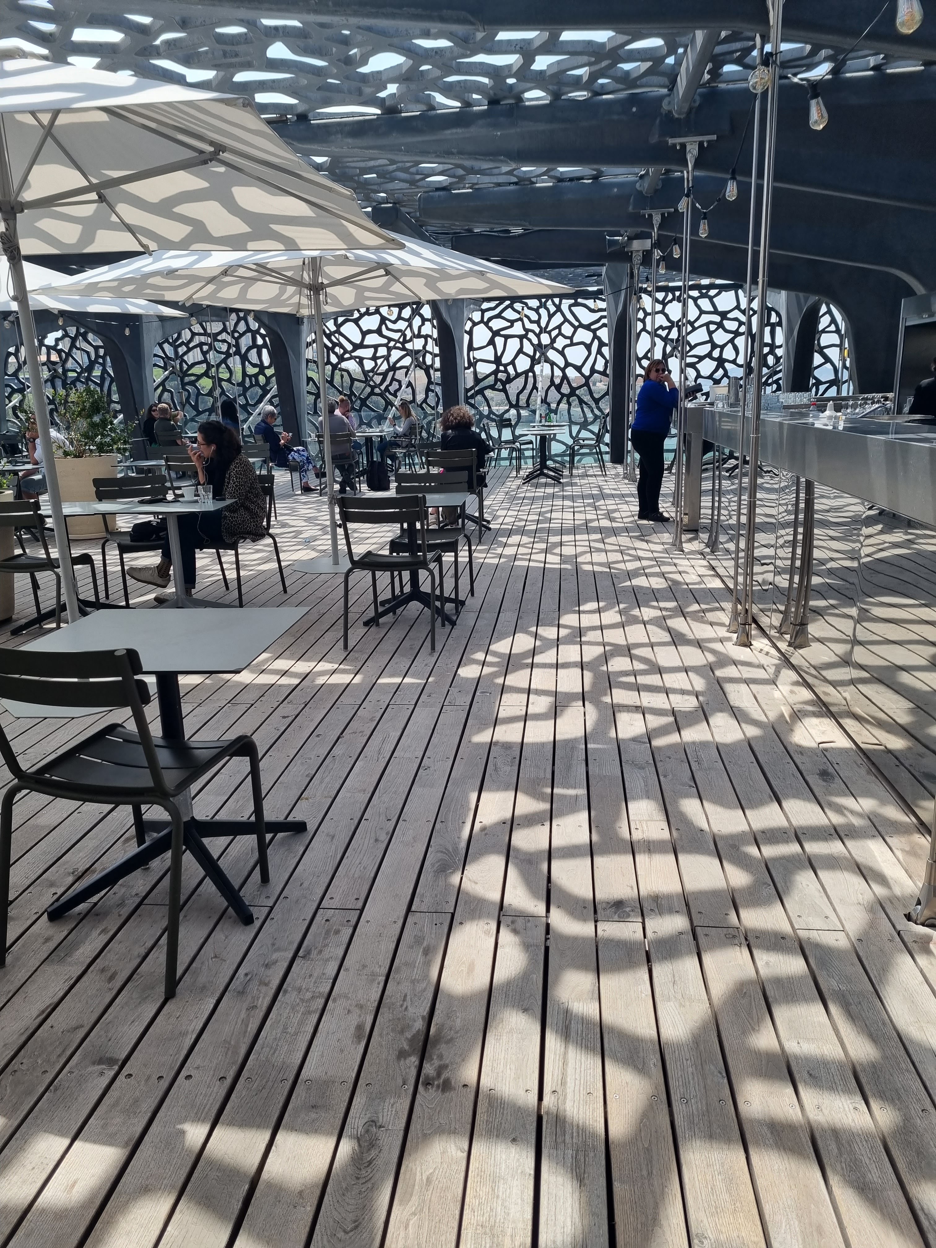Nous sommes venus boire un verre sur la partie « café » du restaurant. Le cadre est agréable et le tarif correct. Belle lumière sous les motifs du Mucem ! Environnement plutôt calme et aéré. Je recommande pour une pause fraîcheur.
