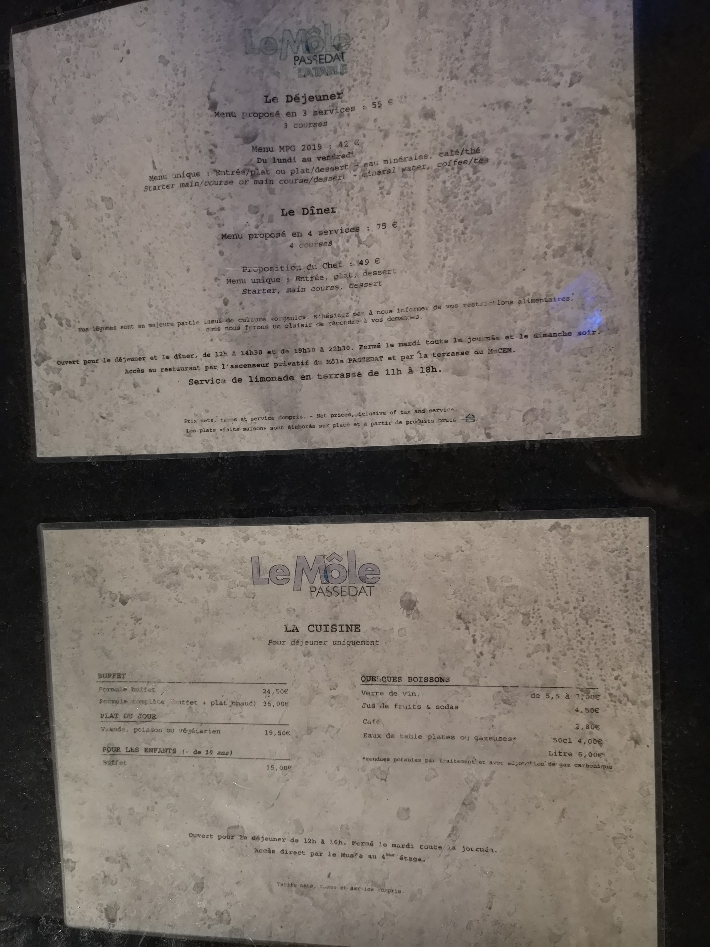 Lors d'une visite au Mucem nous souhaitions prendre un repas simple sur la magnifique terrasse. Malheureusement nous avons appris que l'on y servait que des boissons.(première déception )...Du coup nous sommes rentrés au restaurant Le Mole et avons été tout de suite dirigés vers une table au milieu d'une grande salle mais sans aucune vue (le restaurant n'était pas du tout rempli)..(deuxième déception.) Commande du plat du jour ( plat de poisson) et là ce fût la bonne surprise, cuisine d'un grand raffinement et des goûts excellents pour des prix très abordables.