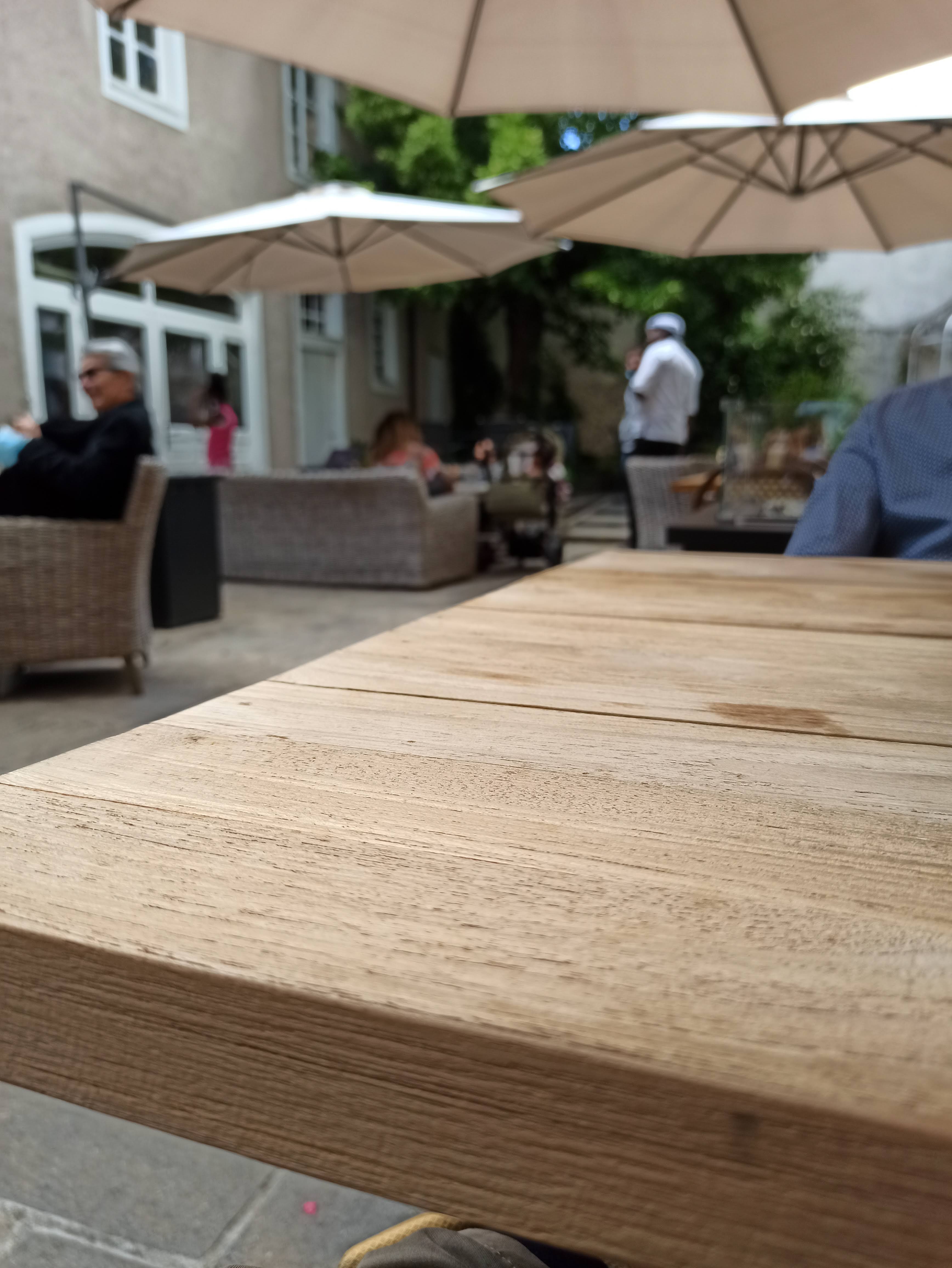 Tres agréable la cour , bravo le chef , et le service . Un problème..il manque sûrement du produit pour le lavage de la verrerie car ceux ci sont ternes .....a verifier, Idem pour les couverts. Cordialement