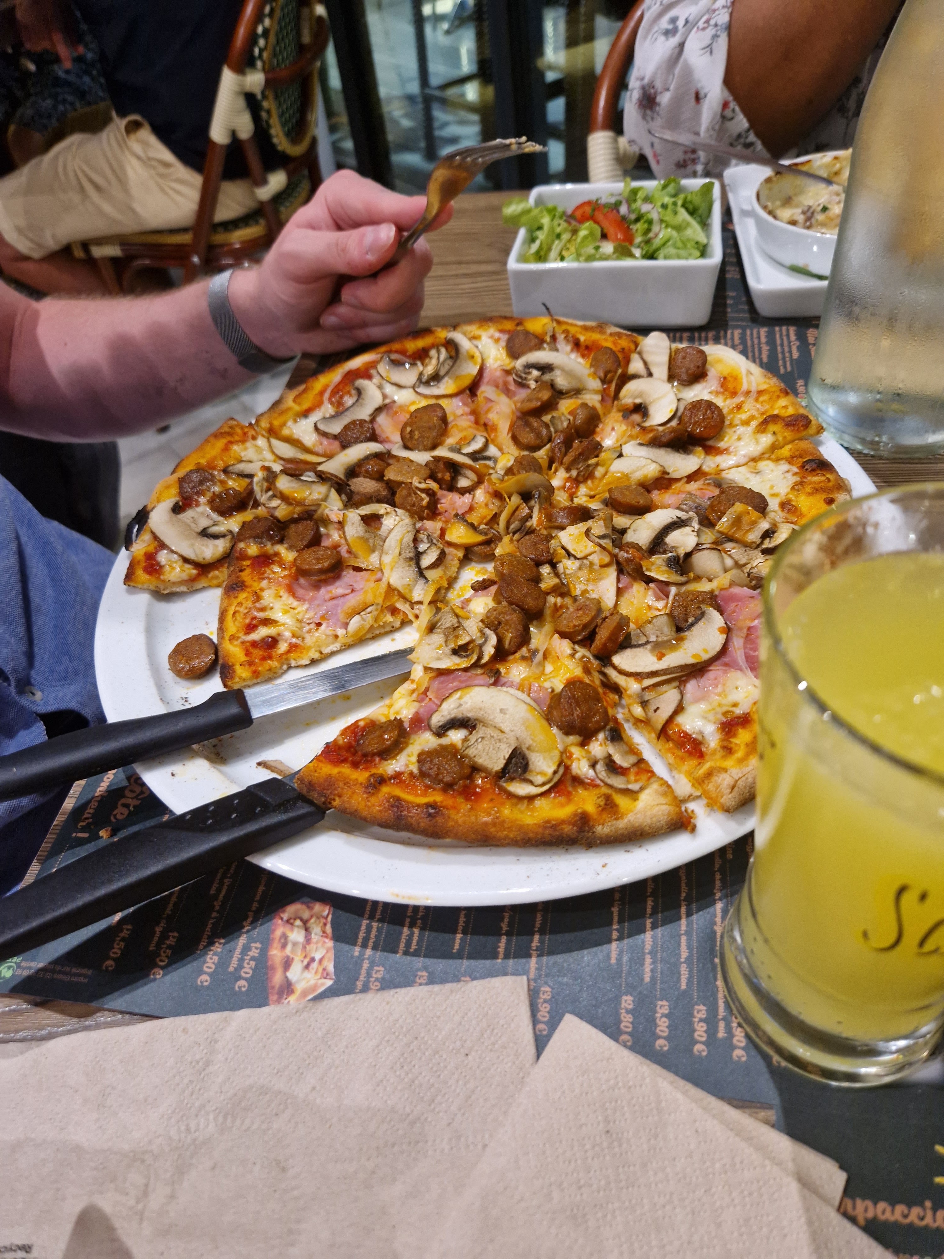 Très bon accueil. Table de neuf. Nous avons tous été servi en même temps ( pizzas, pâtes et viandes). Repas délicieux.
