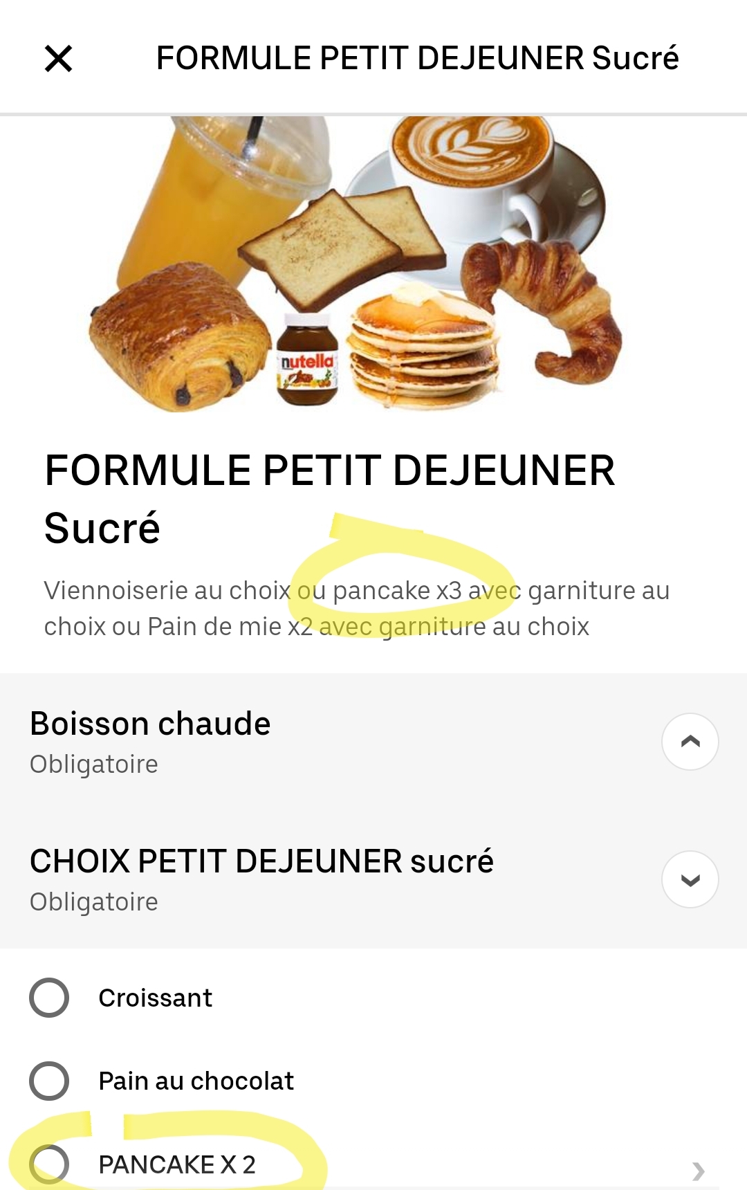 1ere commande effectuée chez LE MONDE BY MARSEILLE. *Commande #7E26D *aujourd’hui à 07:30 CES / montant total €20.13 Le croissant au beurre et le chocolat viennois savoureux. Le ENGLISH MUFFIN: OEUF BACON CHEDDAR et Le ENGLISH MUFFIN: OEUF EMMENTAL sont copieux. Commande effectuée via UBEREAT, livreur courtois et livraison rapide. ⚠️ Bémol, il manque 1 pain au chocolat à 1€50 et les accompagnements des pancakes (miel + nutella) vendu à l'unité si je ne me trompe pas à 1€ de base sont également manquant. La quantité des pancakes dans la formule : PETIT DEJEUNER Sucré à 8€50 indique 3 pancakes mais lorsque que l'on souhaite les sélectionner il n'apparaît que 2 pancakes. Est ce normal ? Il y a contradiction !!! ⚠️ la formule PETIT-DÉJEUNER sucré à 8€50 est plus chère que le fait de commander séparément, soit une différence de1€ Chocolat chaud ou chocolat viennois 3€50 Pancakes 4€ Total 7€50 Les formules ne sont elles pas prévues pour être à l'avantage du client ? @Angy_photographe