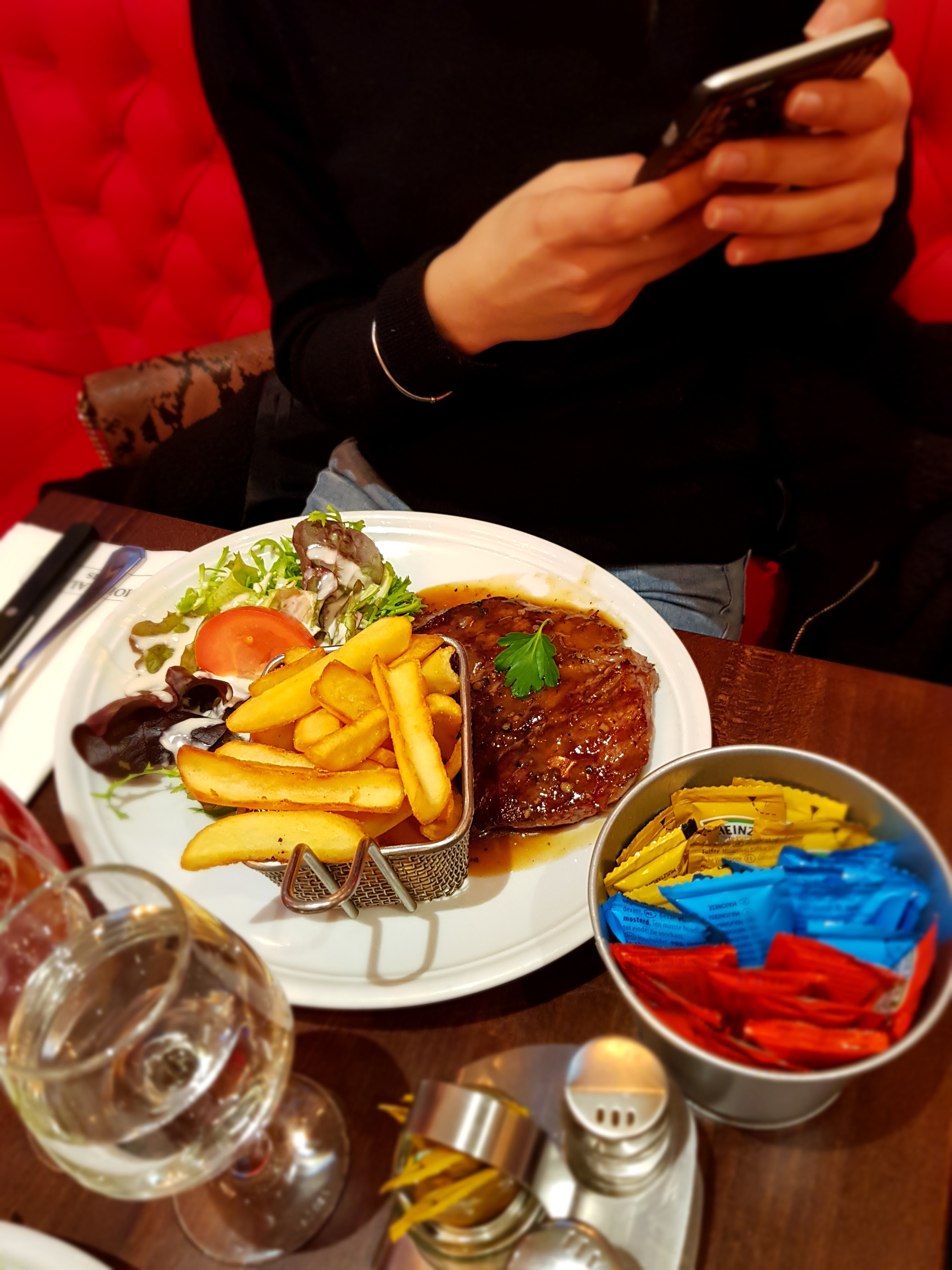 Je ne recommande pas : serveurs qui manquent d’amabilité, steaks cramés, toilettes sales … en allant aux toilettes vous pouvez entrevoir les cuisines lorsque la porte est ouverte et semblent également manquer d’hygiène … très déçue