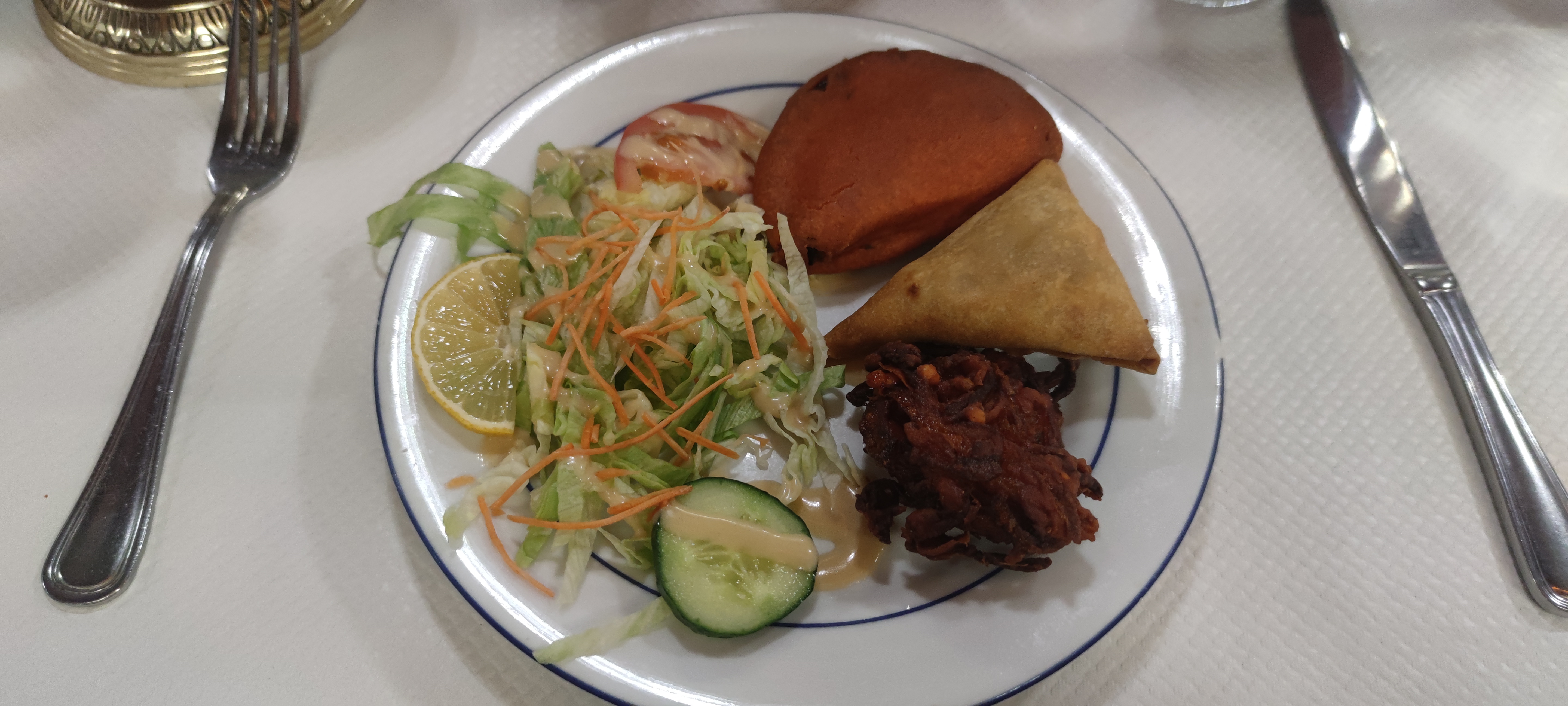 Notre premier restaurant indien. 3 menus Monica ( 13,90 € le menu): Entrée: Samosa Légumes ( pas mal ) + oignon Tandoori ( un délice) + Beignet d'aubergines ( pas mal) accompagnées de trois sauces: sucré salé, menthe et épicée. Plat principal: Poulet Kurma ( très bon, si vous aimez le sucré salé, beaucoup de riz...). Poulet Tandoori cuit au four ( croustillant, très bon) oui j'y retournerai avec mes parents pour gouter autre chose. Service impeccable, R.a.s.