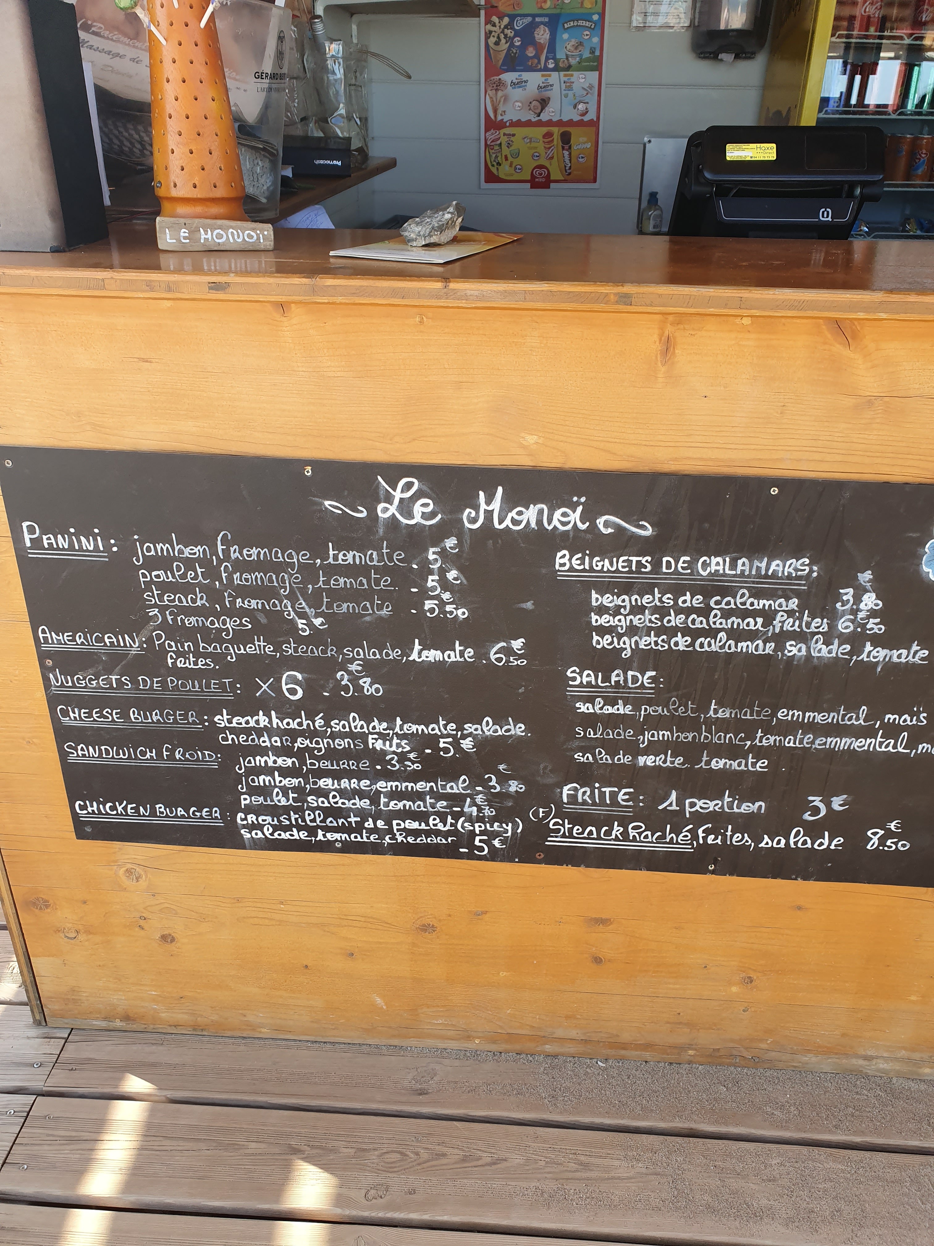 Bonjour à tous Parlons du Monoi Je sors du Monoi pour acheter des glaces et boisson à emporté pour 8 personnes et la le désastre complet La personne au bar nous regarde des pieds à la tête et souffle ( cheveux blond )en nous voyant arriver je précise que nous avions pas louer de transat car complet . Elle fait passer d’autres clients avant nous , nous sommes parti de suite après. Cela fait deux fois que nous souhaitons nous restaurer dans l’après-midi et cela fait deux fois qu’on nous reçoit très mal Pas du tout souriant à croire que ces personnes ne veulent pas travailler mis à par les gens qui loue les transats. Pour moi le pire restaurateur de plage de Saint Pierre la Mer . Celui proche de l’Hotel le Neptune est top Désolé pour eux , je dépenserai mon argent ailleurs