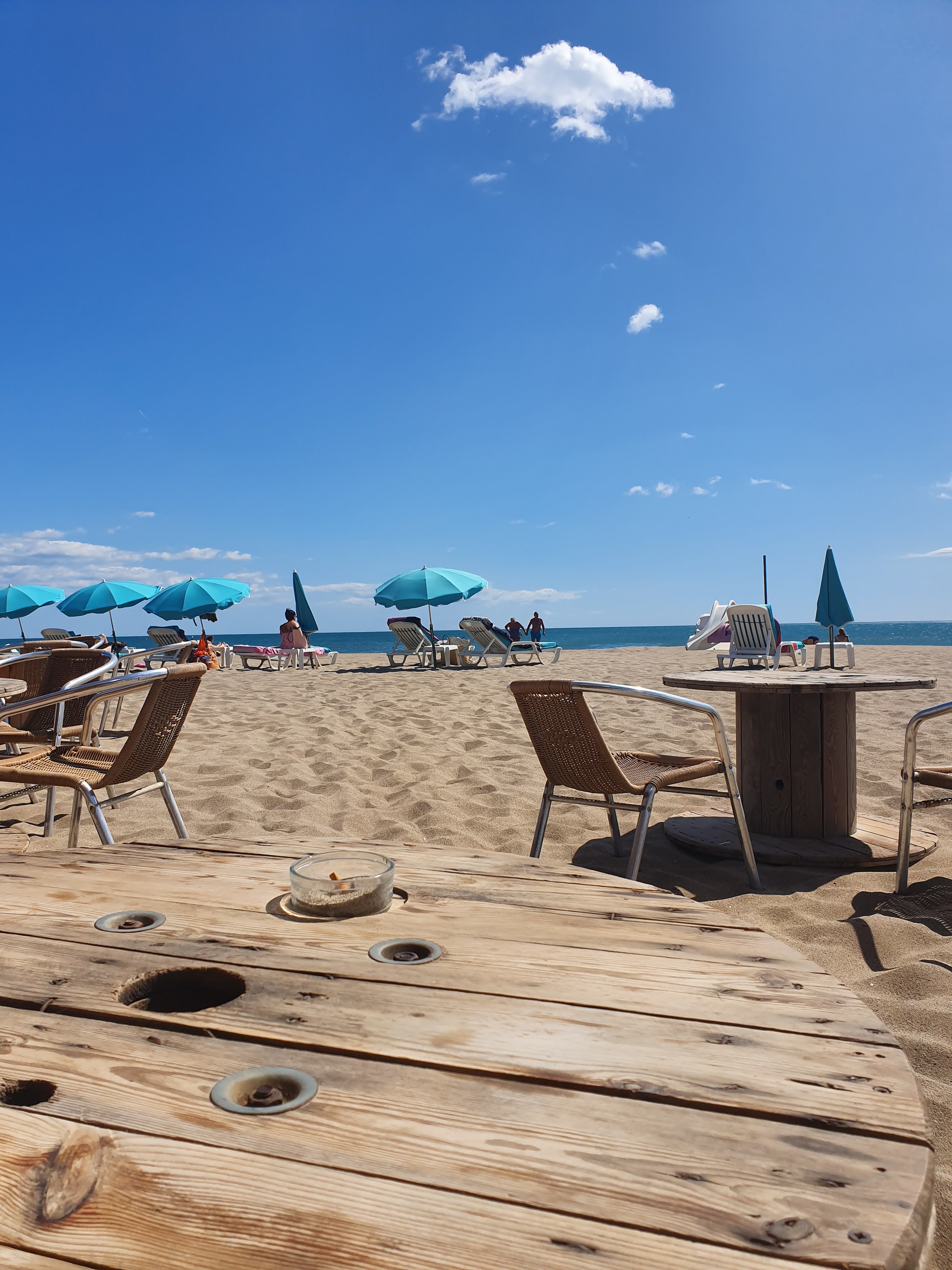 Idéalement placé sur la plage, le lieu est très sympathique. Très bien pour profiter de la mer. Par contre, cette après-midi, entre 17h et 18h, la musique est beaucoup beaucoup trop forte.