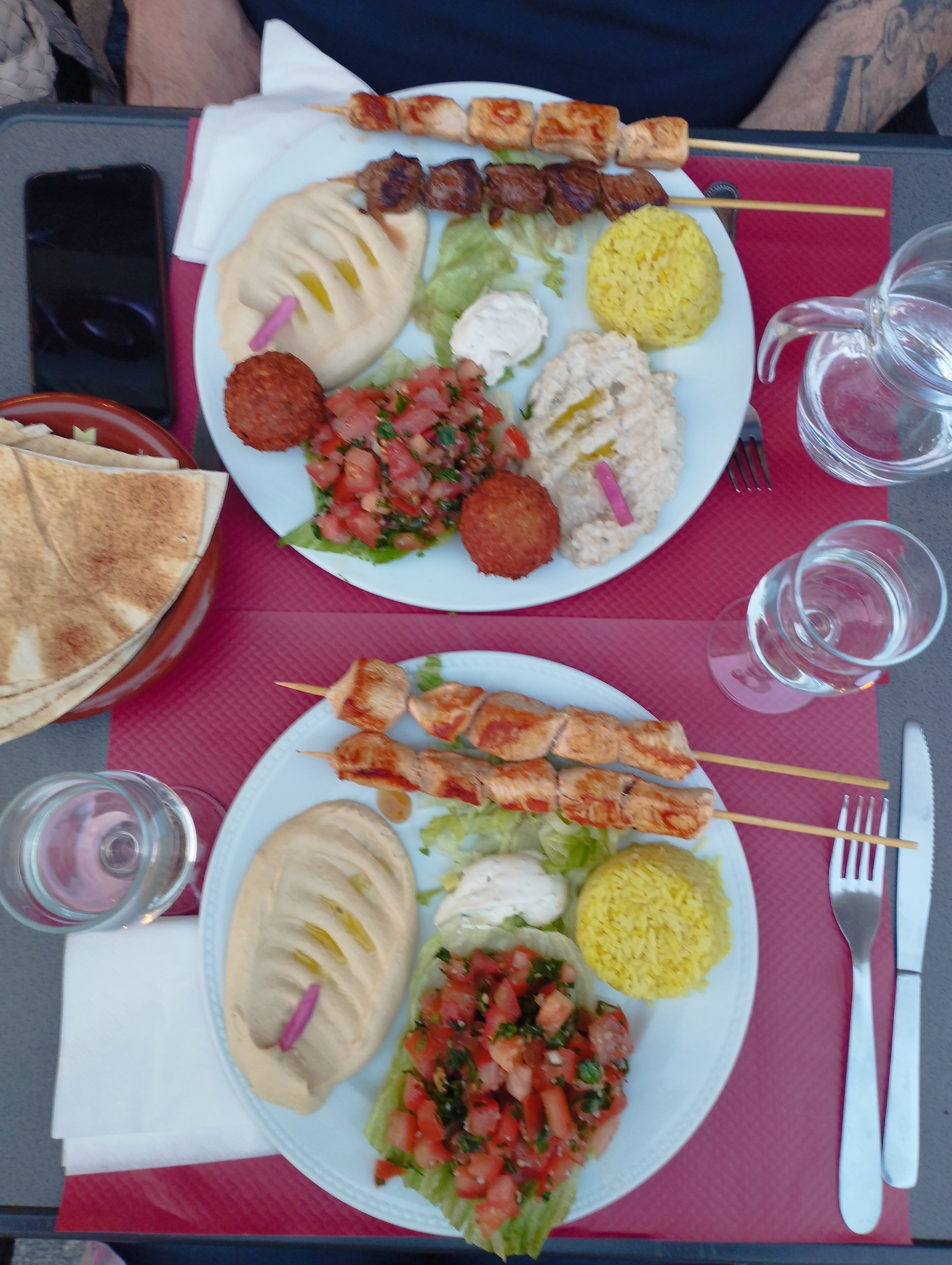 Les falafels sont bons. J'ai un doute sur le houmous qui ressemble fortement à celui des grandes surfaces. Le pain c'est du carton. Les brochettes sont petites, elles ont du goût mais sont trop cuites. Le riz était collant... Quantité astronomique et qualité décevante. Digestion compliquée!