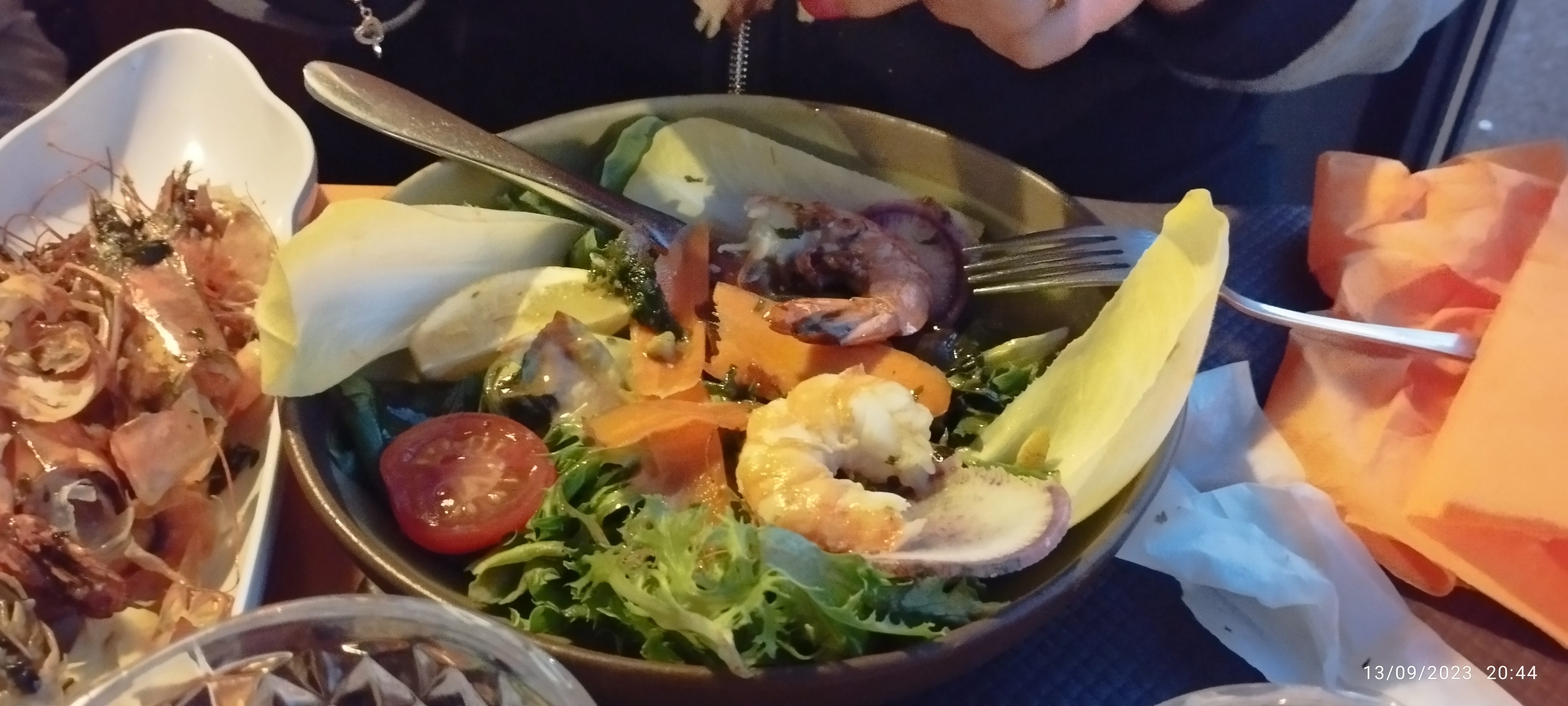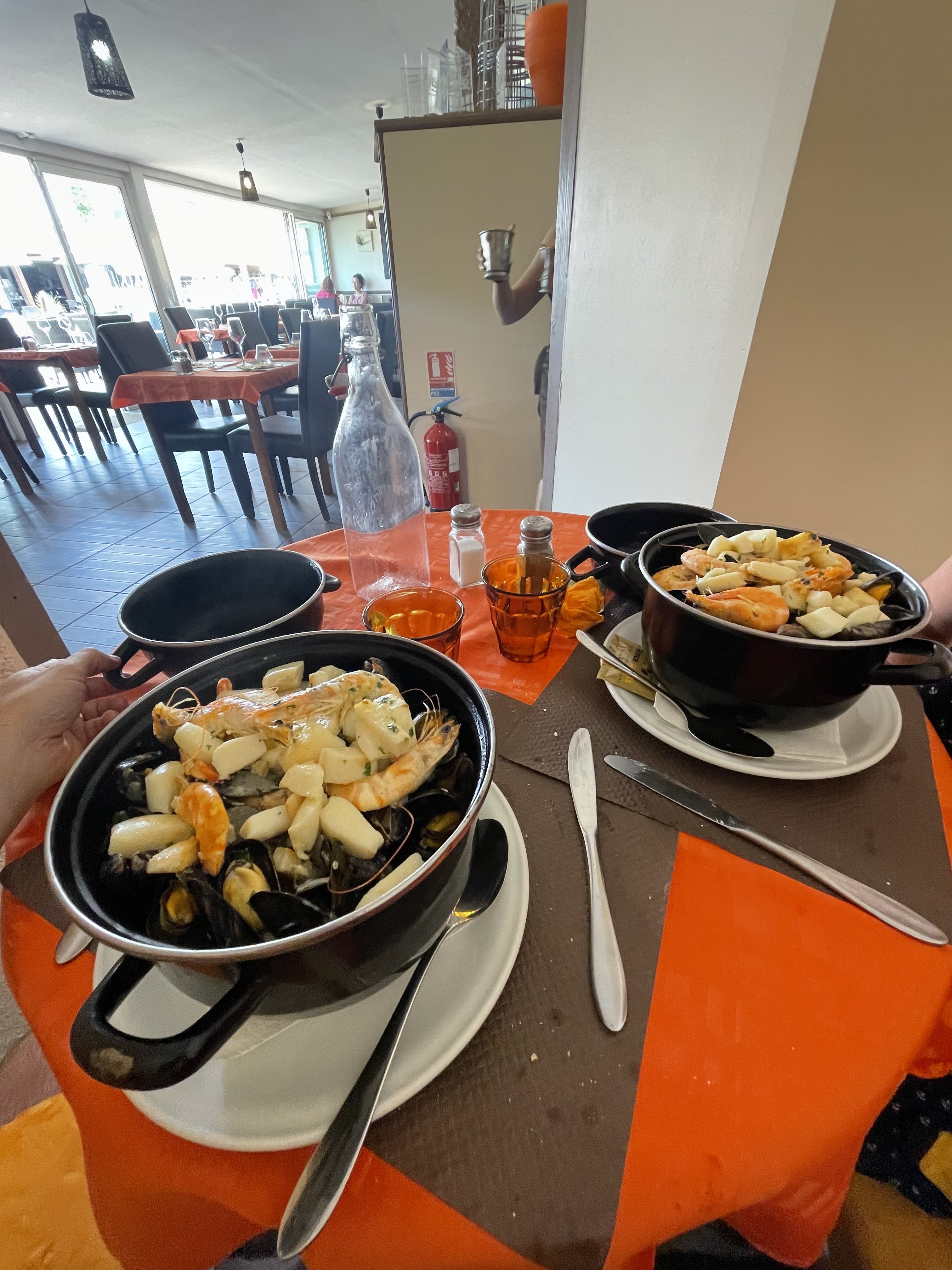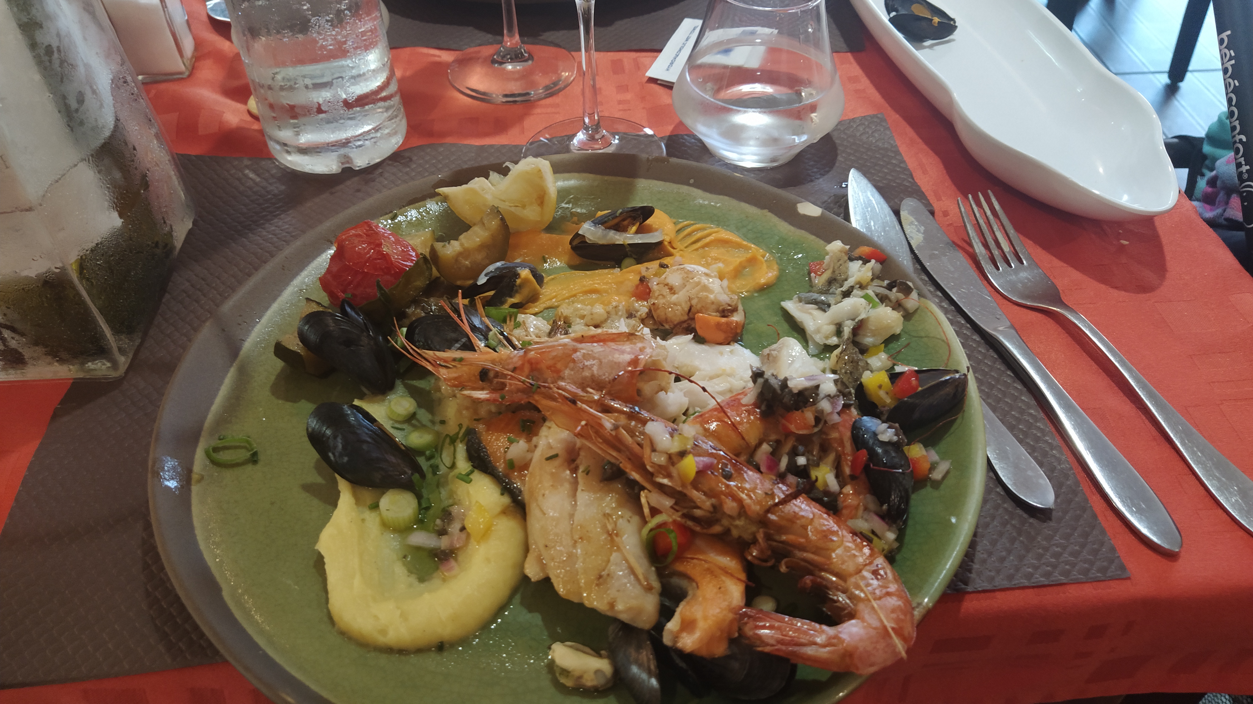Ça démarre mal avec des moules marinières sans jus, ensuite on goutte chacun nos plats, chaque aliment paraît avarié, crevettes, gambas, encornet.... On attend de voir comment la nuit va se passer, sûrement avec difficulté !!!! On craint l'intoxication alimentaire