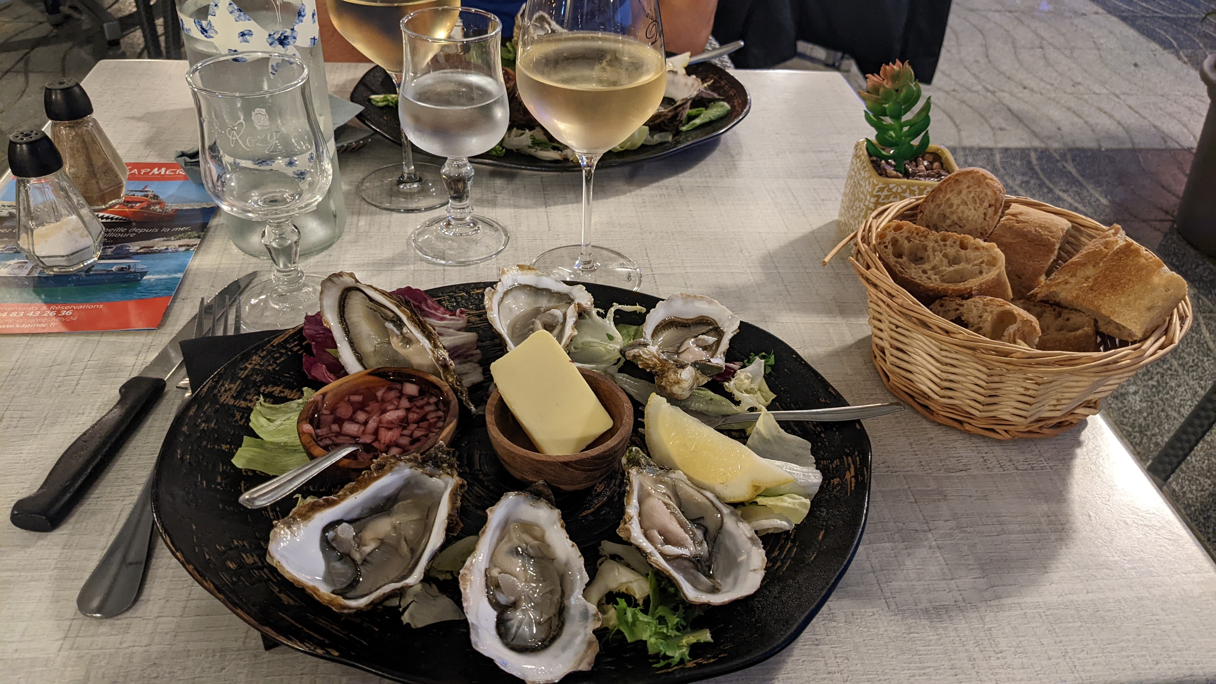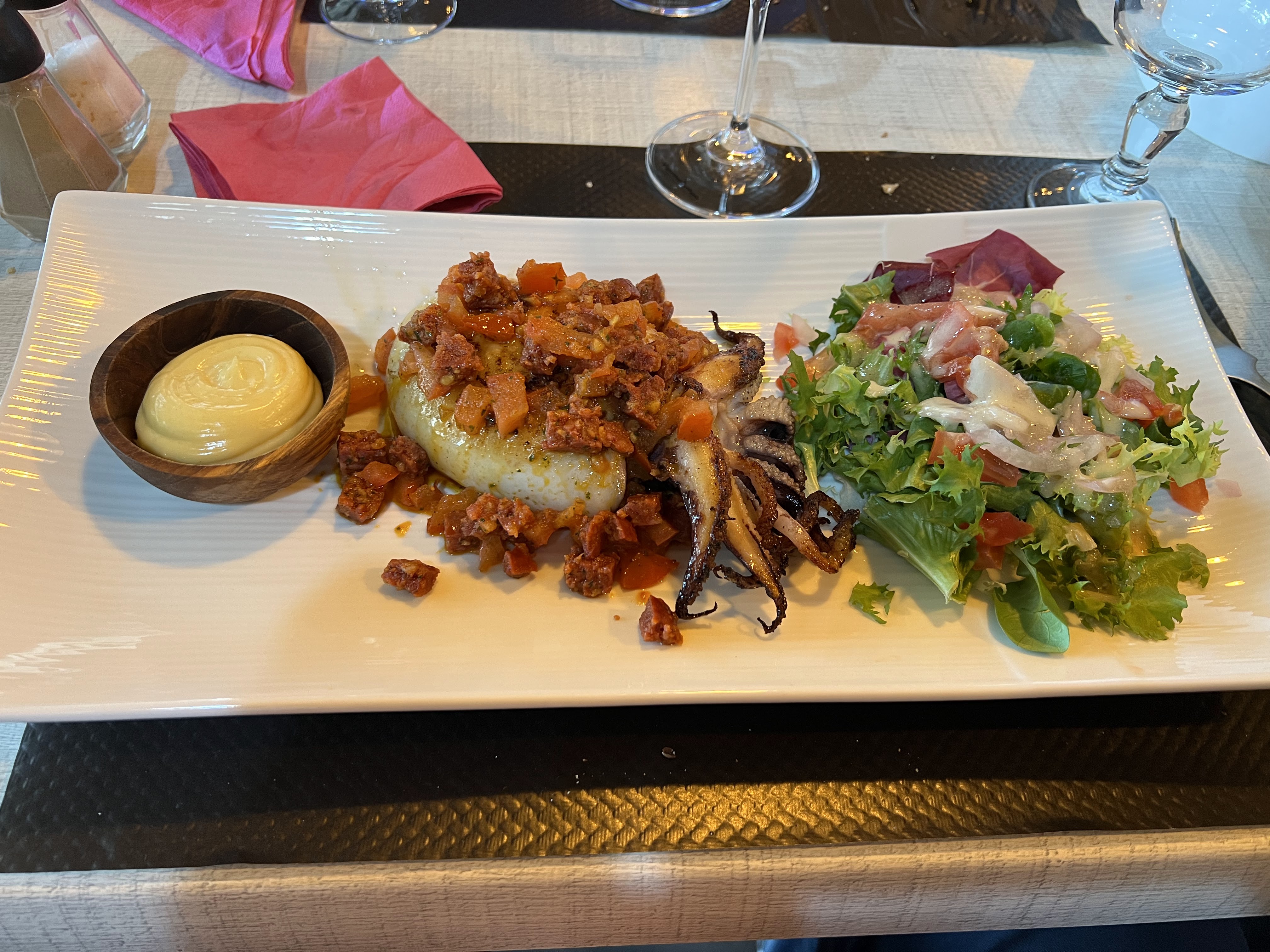 NEGATIF : Le Monsieur nous sert sans masque. Attente vraiment très longue avant d'être servies. D'autres personnes arrivées après ont été servies avant nous. Pas de sel, de poivre, de carafe d'eau, pas de citron avec les huitres, pas de serviettes sur la table (obligées de demander), 1 erreur dans la commande et oubli de l'aioli. POSITIF : Emplacement sympa au port d'Argelès. Monsieur qui sert : très gentil Bonne musique. Jolis services (belles assiettes, belles tasses à café, belles pailles). Plats délicieux et cuisine de qualité !!! Nous nous sommes régalées (le pan con tomate manchego serrano : une tuerie, belle presentation), bonne huitres, Plats que l'on ne voit pas partout (poulpes à la catalane : exquis) Nous reviendrons volontiers.
