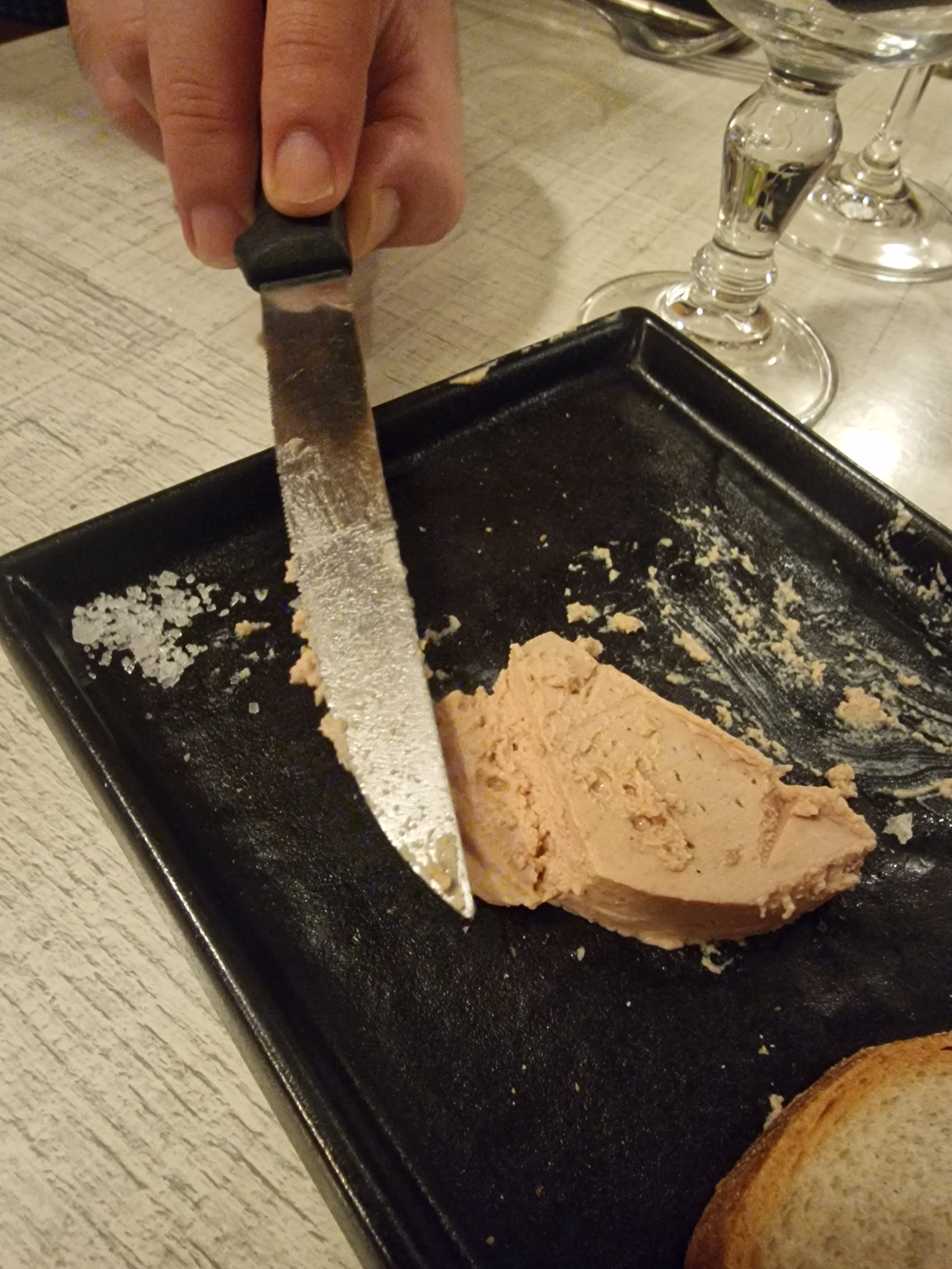 Foie gras maison et son poivre timut = une tranche de mousse de foie et deux tartines = 14€90 Waw On nous a expliqué que le foie était tellement travaillé en cuisine qu'il avait une texture mousseuse, c'est un foie gras mousseux. Et ben... non, c'est de la mousse, nuance. L'entrecôte était bonne. Le vin rouge est arrivé chaud, mais chaud chaud chaud, genre plus chaud que l'air ambiant. C'est la première fois que je dois attendre qu'un vin rouge rafraichisse. J'espère la dernière.