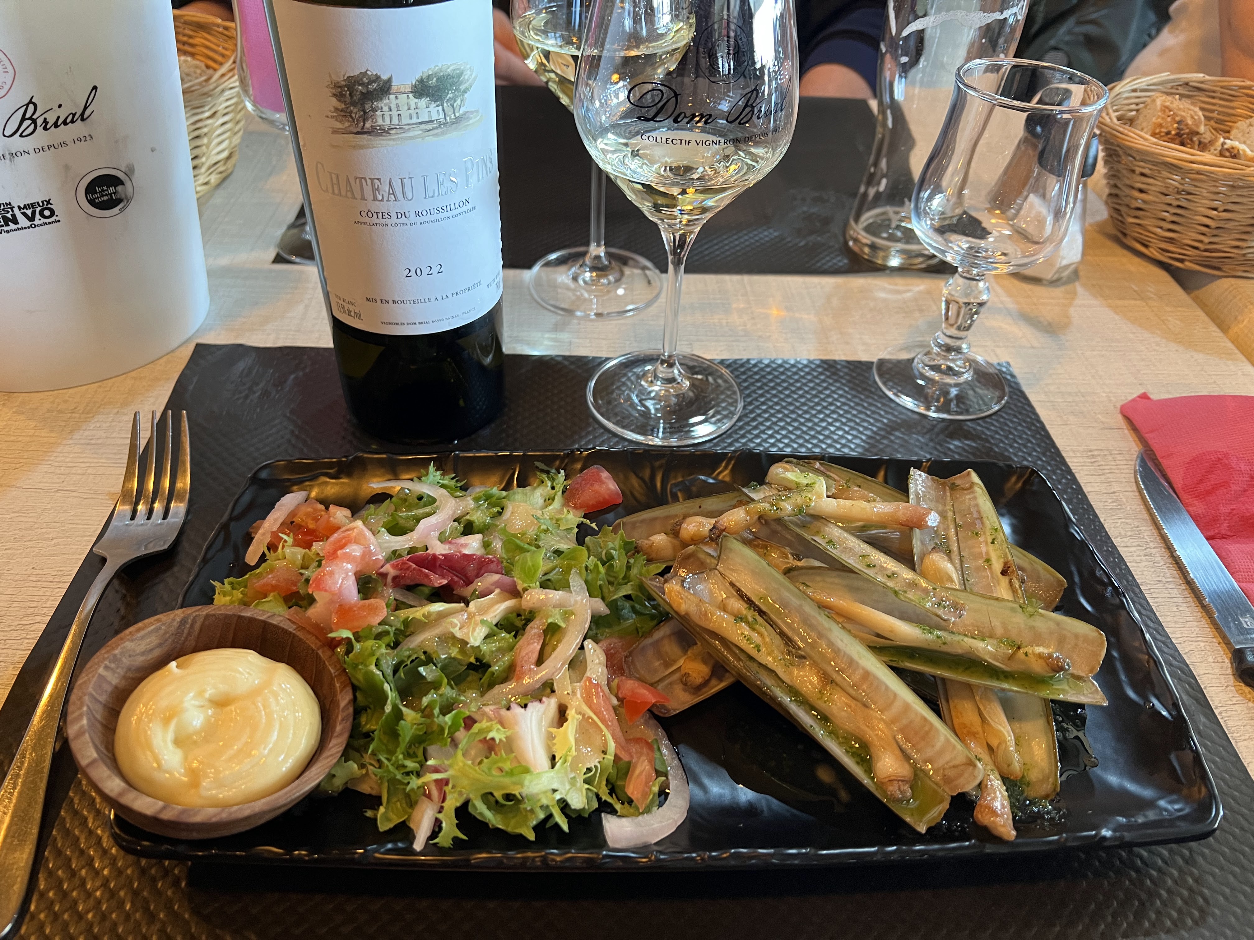 Mangé une parrillade lotte bonite rougets de la pêche locale avec riz et legumes pour 2 accompagné d´un vin banc Les Petits Pins Dom Brial tout était très bon ainsi que les desserts tarte tatin et crème catalane. Service rapide. Et en plus vue sur mer et plage Racou et Collioure. Parfait. A recommander.