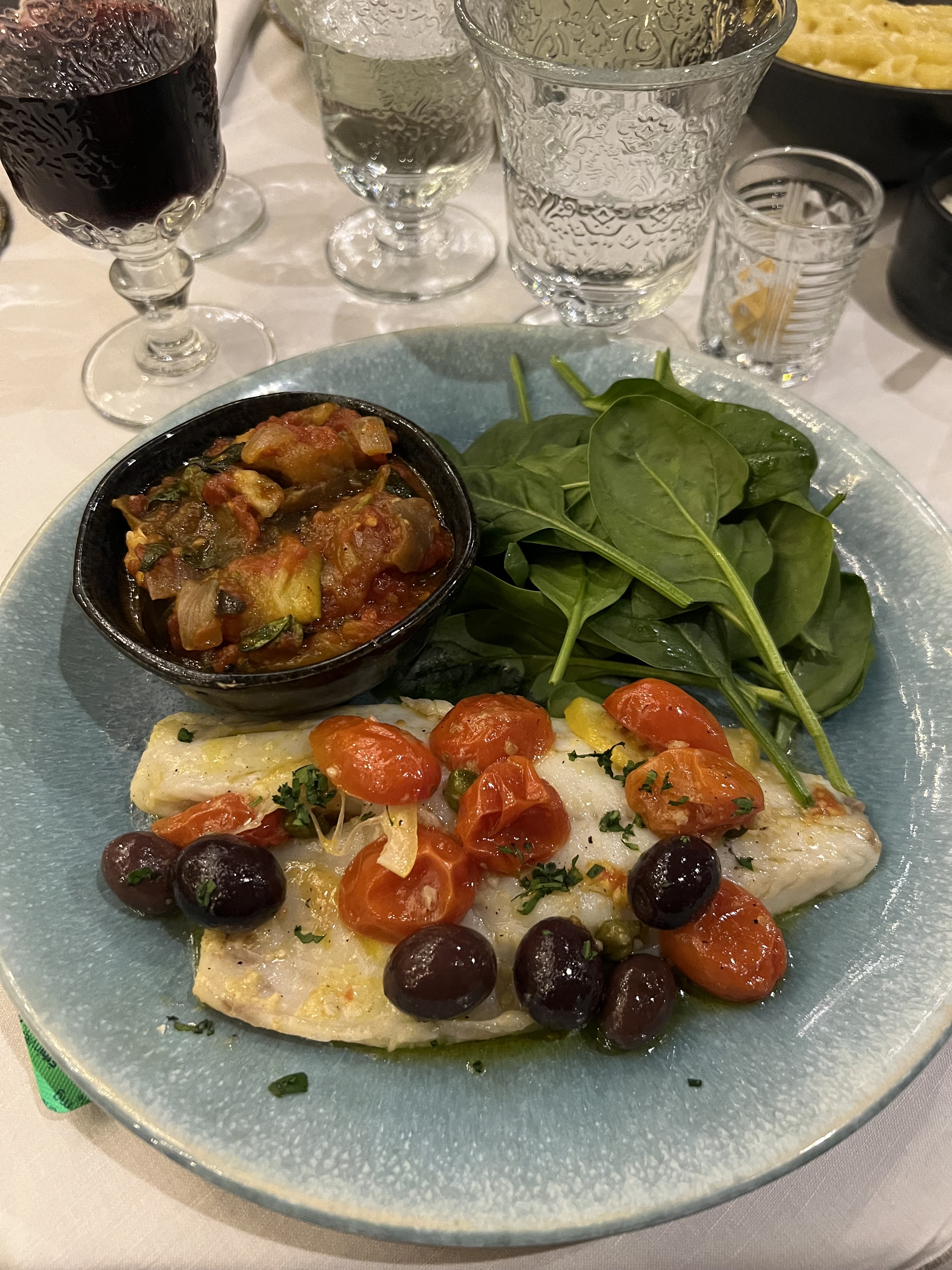 Le cadre est tres beau. Le plat était délicieux mais malheureusement un peu froid. ( Je pense que c'est normal vu que nous étions un groupe de 20 personnes). Le serveur était très sympa et souriant ☺️
