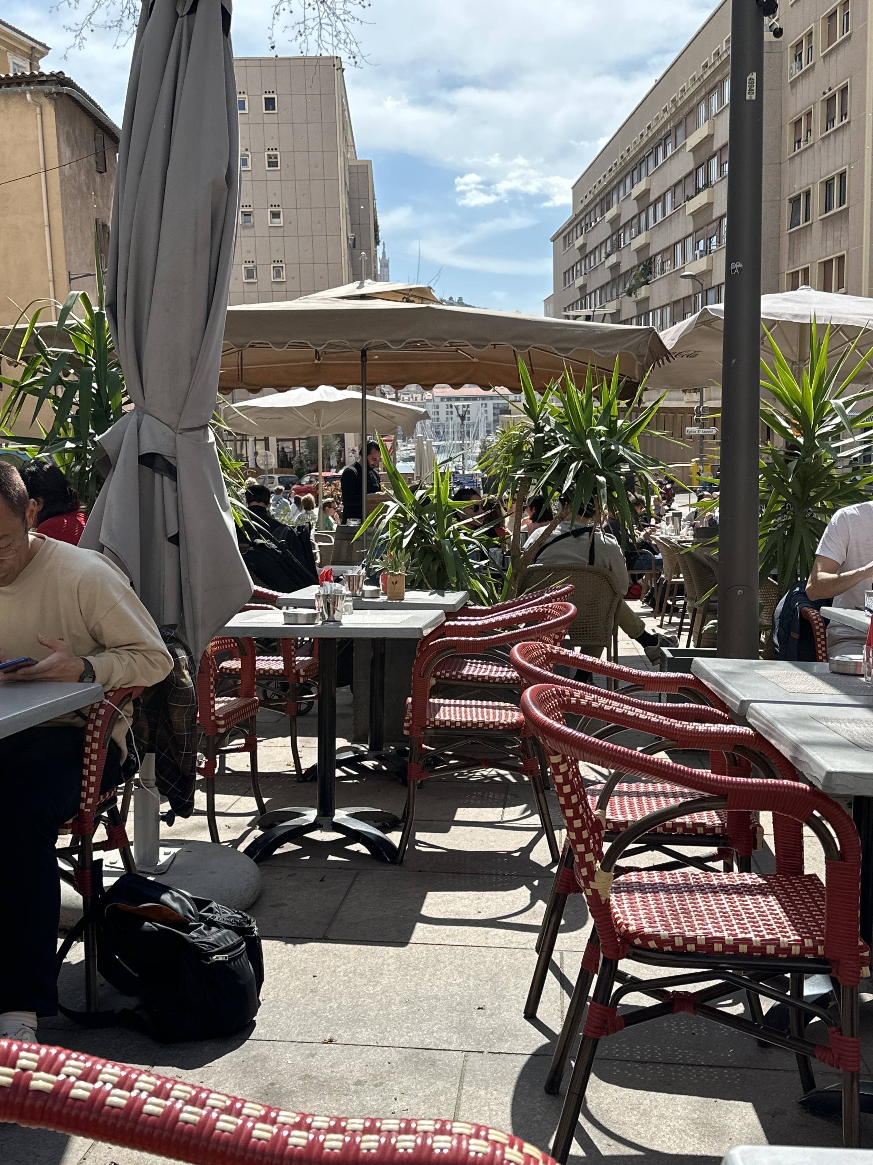 Place sympa à l'ombre, plats copieux et très bons, on s'y est arrêtés en venant du mucem et on regrette vraiment pas, tranche de gigot accompagnée de ratatouille et d'un écrasé de pommes de terre, et seiches à la provençale copieux aussi et pour finir énorme baba au rhum... Personnel sympa, rapide et très compétent... Allez y sans problème