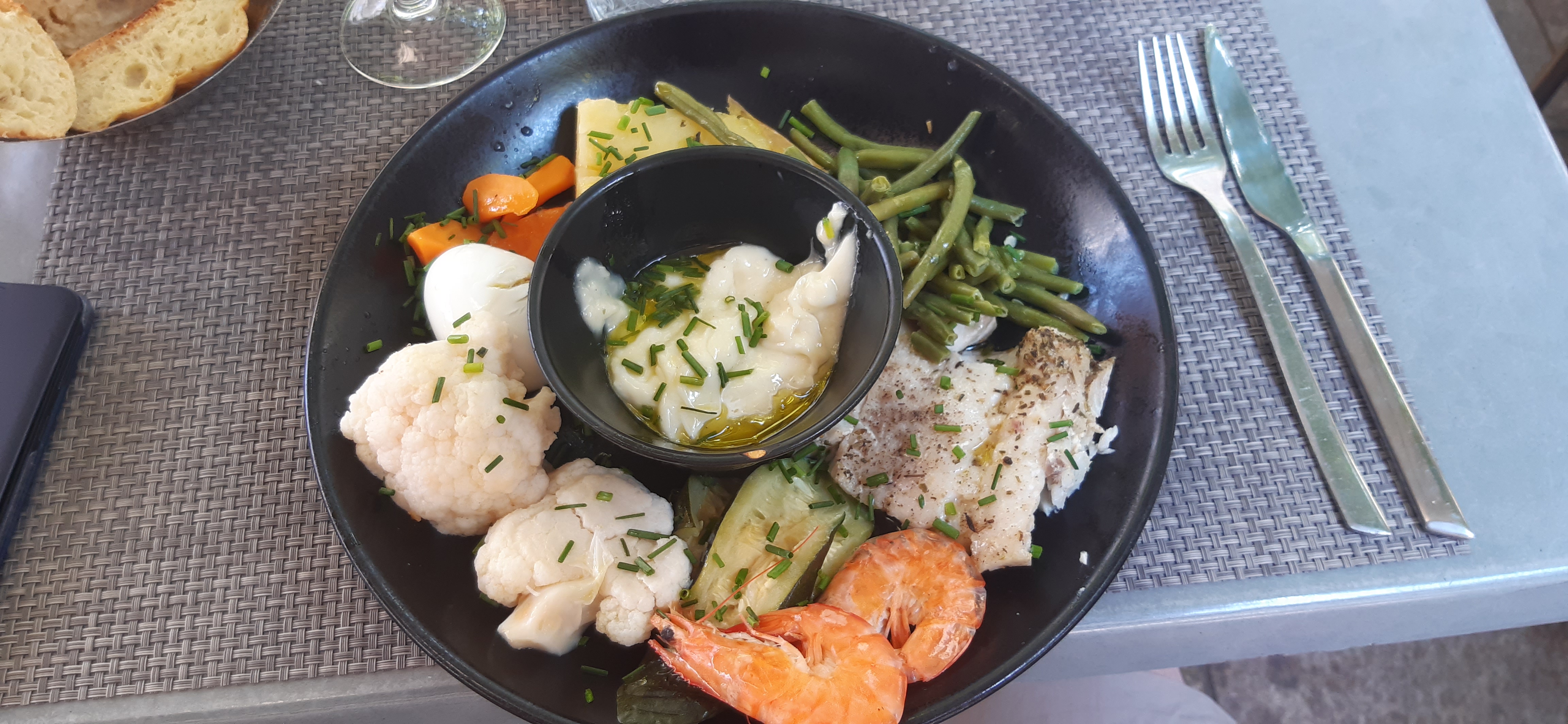 Très bonnes Salade. Bon aïoli. Terrasse ombragée, malgré la canicule, il fait bon grâce au petit vent.