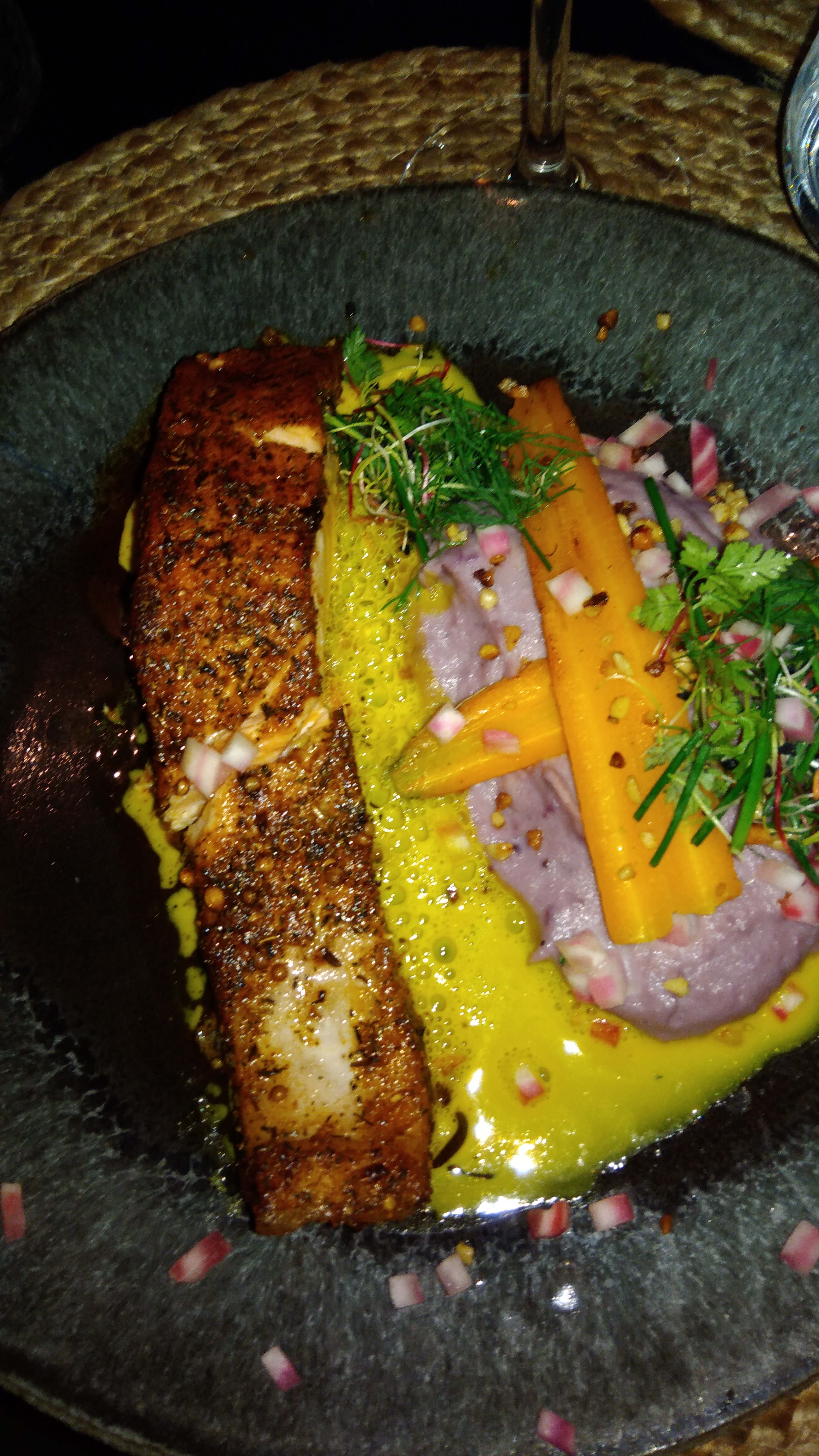 Gravlax de saumon, saumon rôti en croûte d'épices et crémeux de topinambours tout était très bon, endroit très stylé comme dit ma fille, moi je dit ,oui , vraiment un espace cosy au centre de Rennes. En prime le fauteuil d'Émmanuelle a eu beaucoup de succès. Merci au gens qui on choisi ce resto pour le repas de fin d'année de l'entreprise.