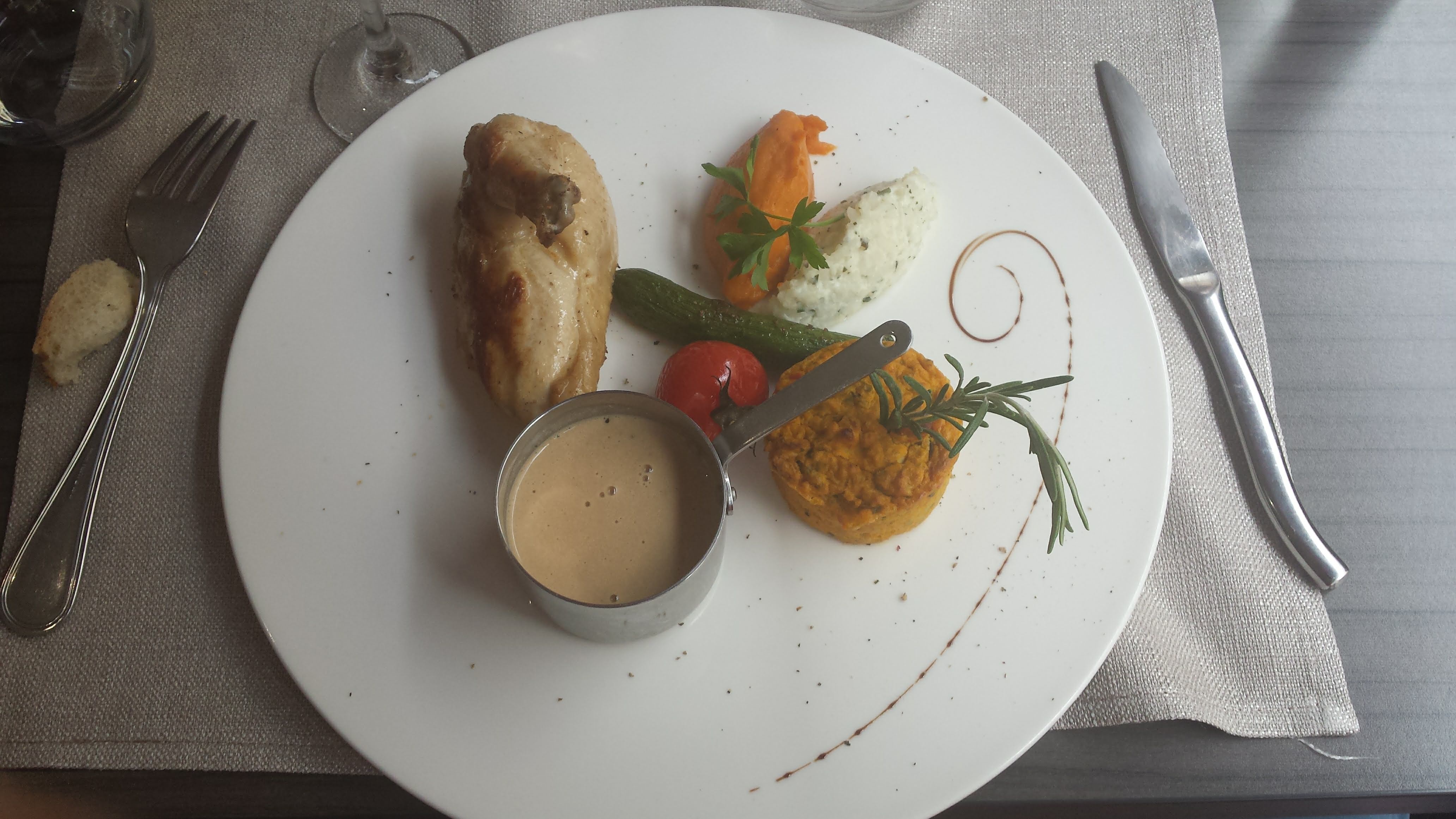 Restaurant absolument parfait. Service attentionné et de bons conseils prodigués par l’hôtesse extrêmement gentille et souriante. Cuisine au top digne d’un restaurant étoilé. Nous salivons encore du ris de veau et du filet de poulet.Les desserts sont formidables aussi. Nous recommandons à 1000% et nous y retournerons dès que nous serons dans cette belle région.