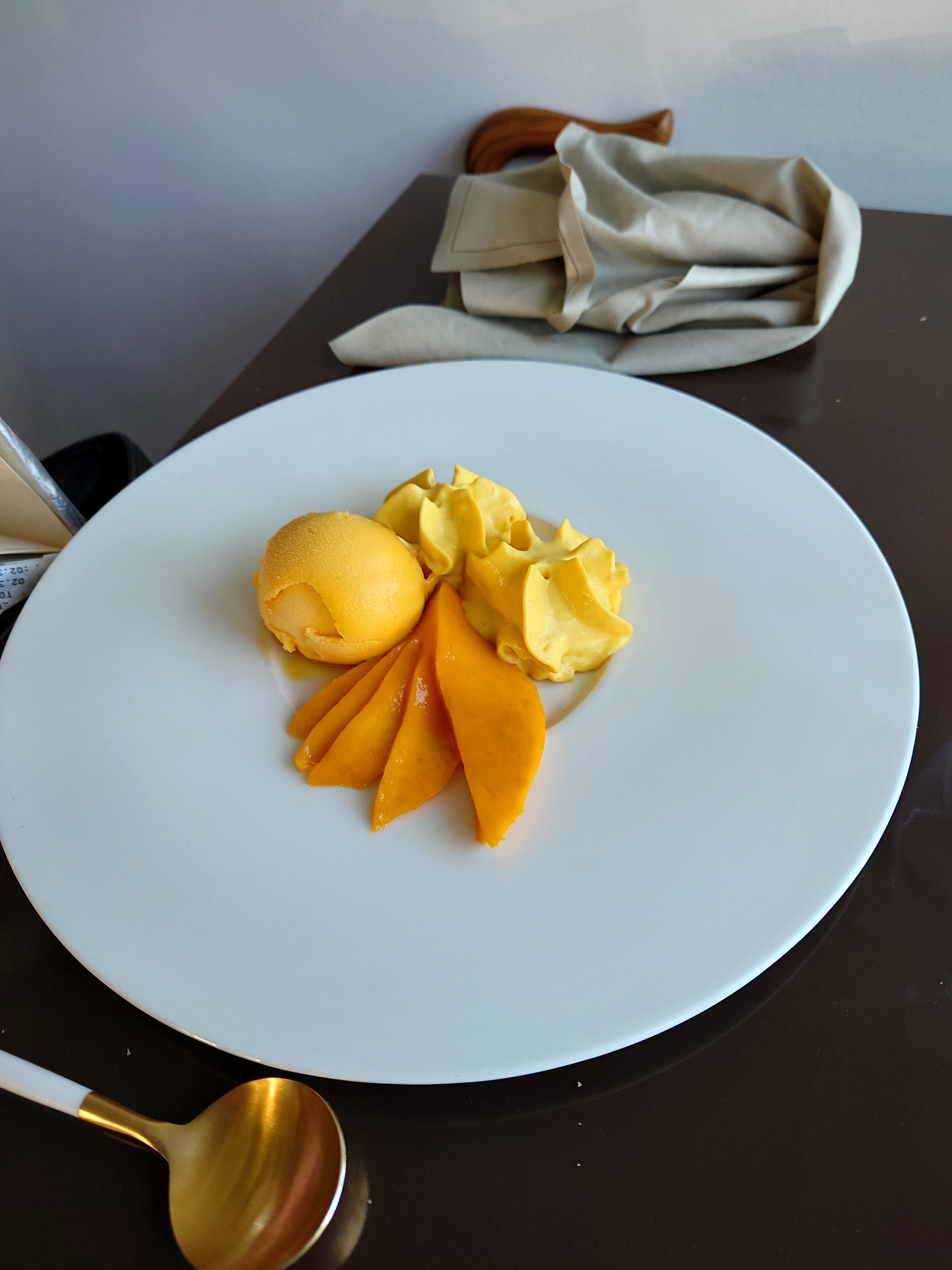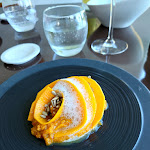Salle blanche la couleur n'existe pas Cuisto froid Légumes bons et frais Lotte sèche aucun goût Pas suffisamment d'huile et de caractère L épicé manque au plat Le dessert très bon Tranche de mangue glace mangue Et mousse mangue très parfumée Dommage que le l extérieur n'a pas de terrasse! Ns sommes au août il fait beau Geneviève