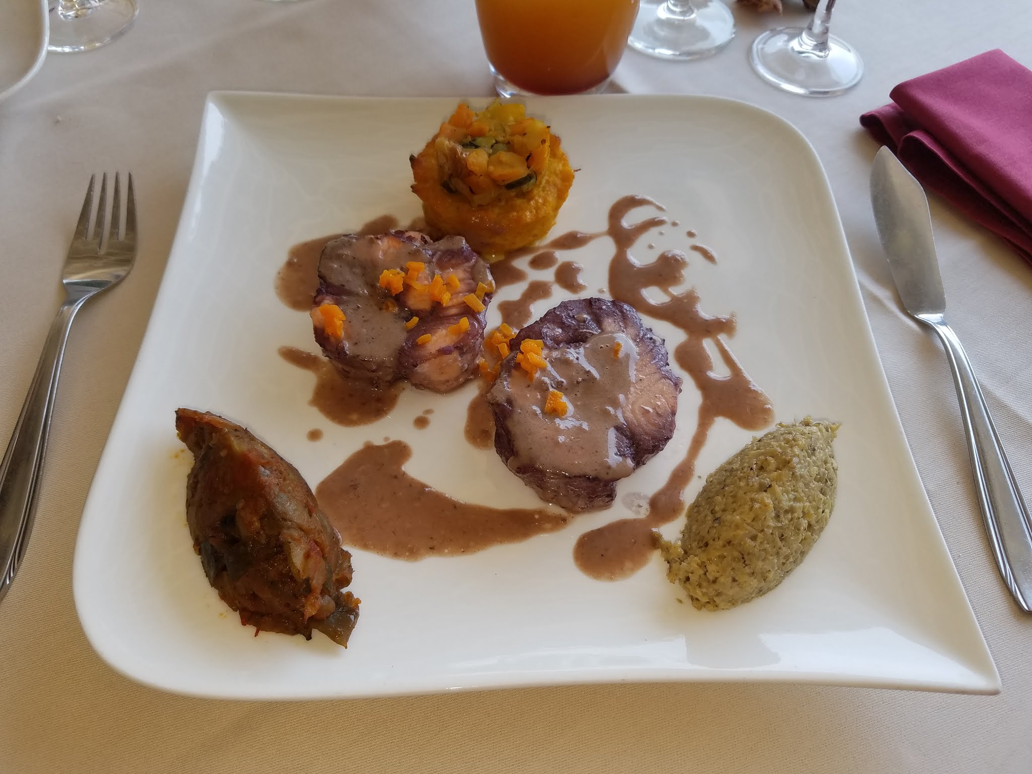Très bon repas, avec un délice à la poire merveilleux!