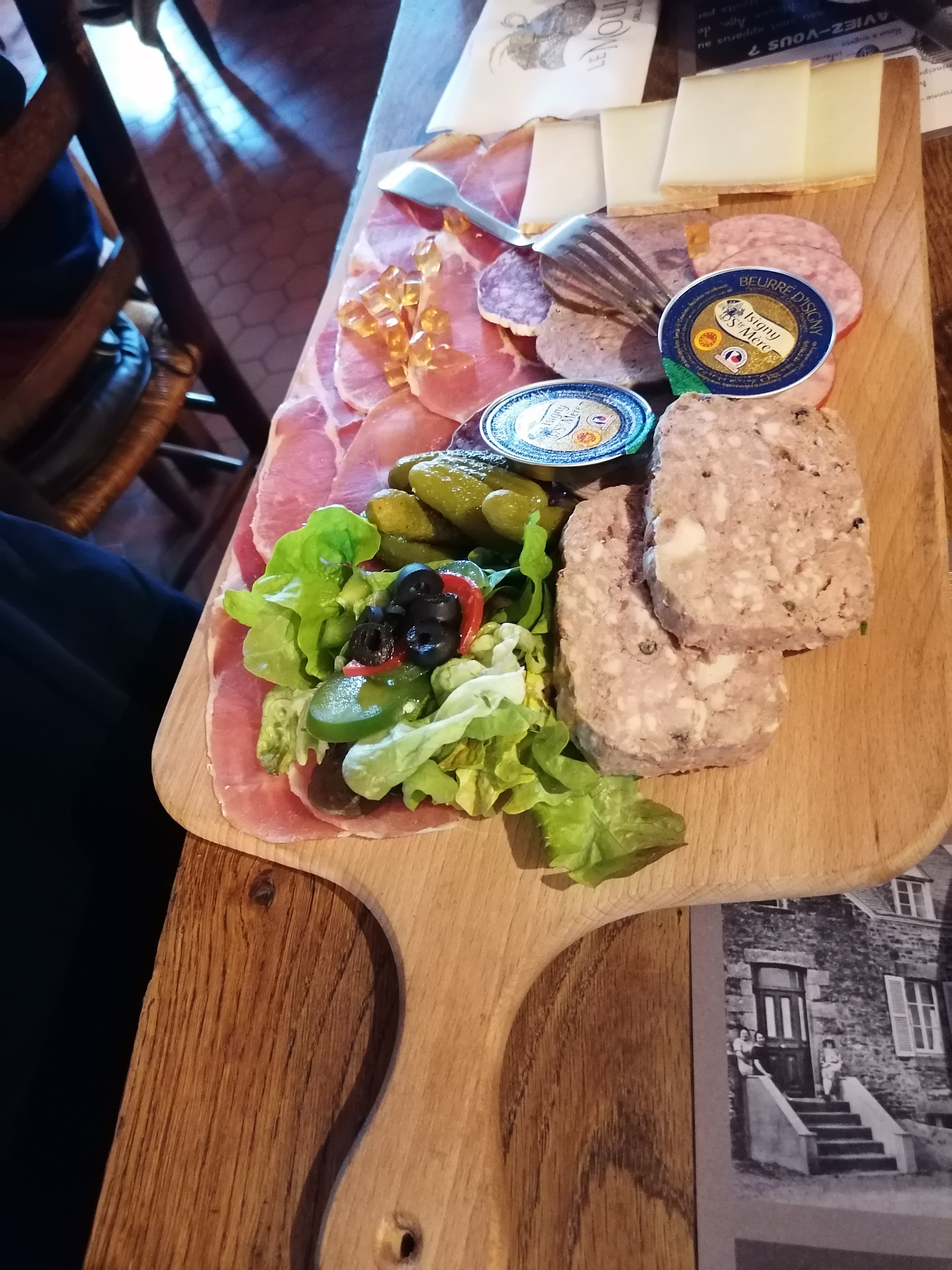 Une belle halte pour les amateurs de viande et charcuterie. Les produits sont de qualité : nous avons apprécié le pain grillé pour accompagner la planche 😊 ; le bœuf braisé dans la cheminée 😋. Le cadre est agréable et chaleureux et le service efficace.(l ambiance musicale en fond mériterait d être plus en adéquation avec le lieu). Nous sommes répartis repus et satisfaits.