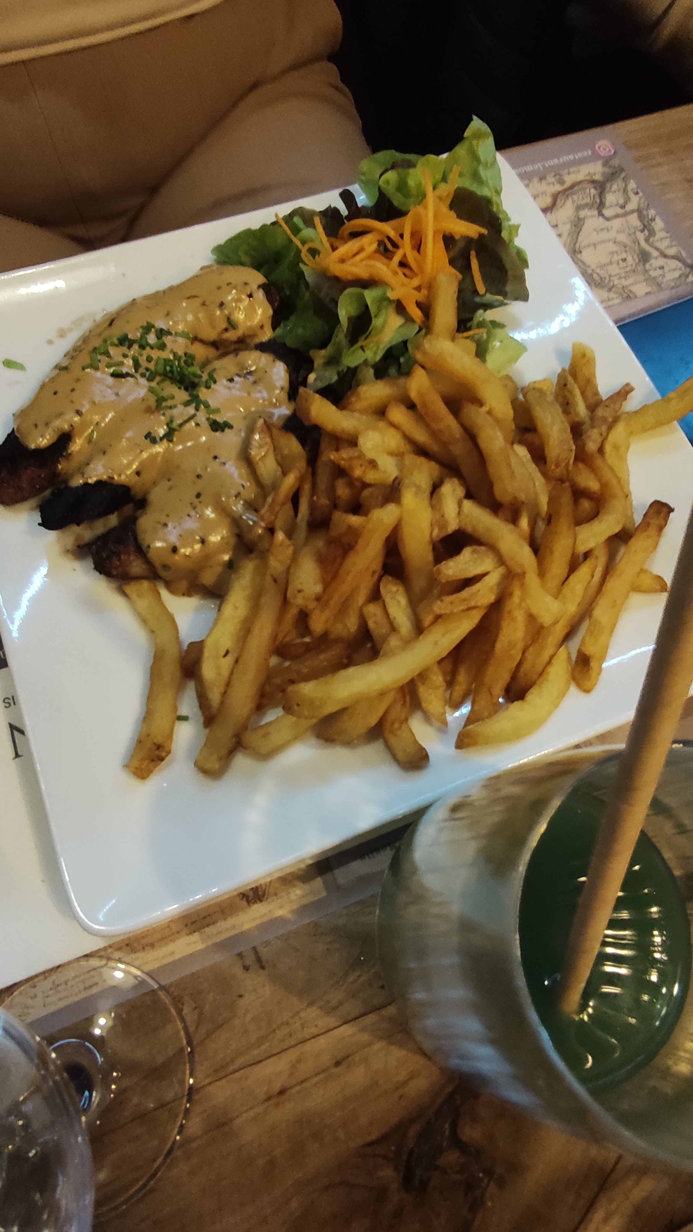 Réservation le jour même pour 2 personne, accueil parfait et parking sur place. Viande sauce poivre et salade tres bien, les BOUTS de frites à revoir.... Restaurant complet, plusieurs brasserades en fonctions plus la cheminée créé une chaleur assez présente disons que l on a pas froid. Service attentif mais trop long du fait du nombre de personnes. Le verre de vin de Bordeaux et surtout le bourgogne un peu cher c est mon avis. 2 apéritifs, 2 plats, 2 desserts et 1 verre de Bordeaux 68€ Bon appétit à tous.
