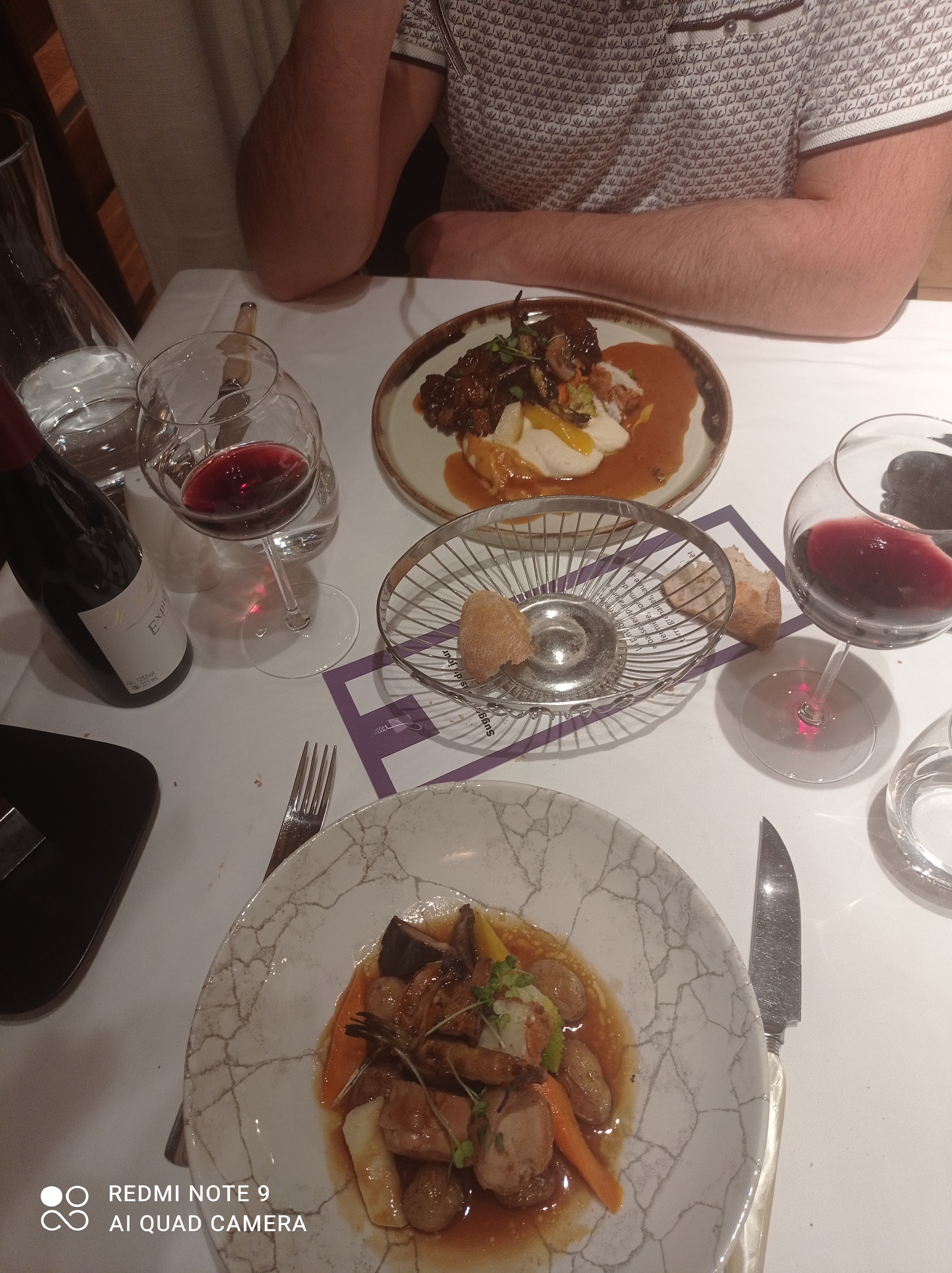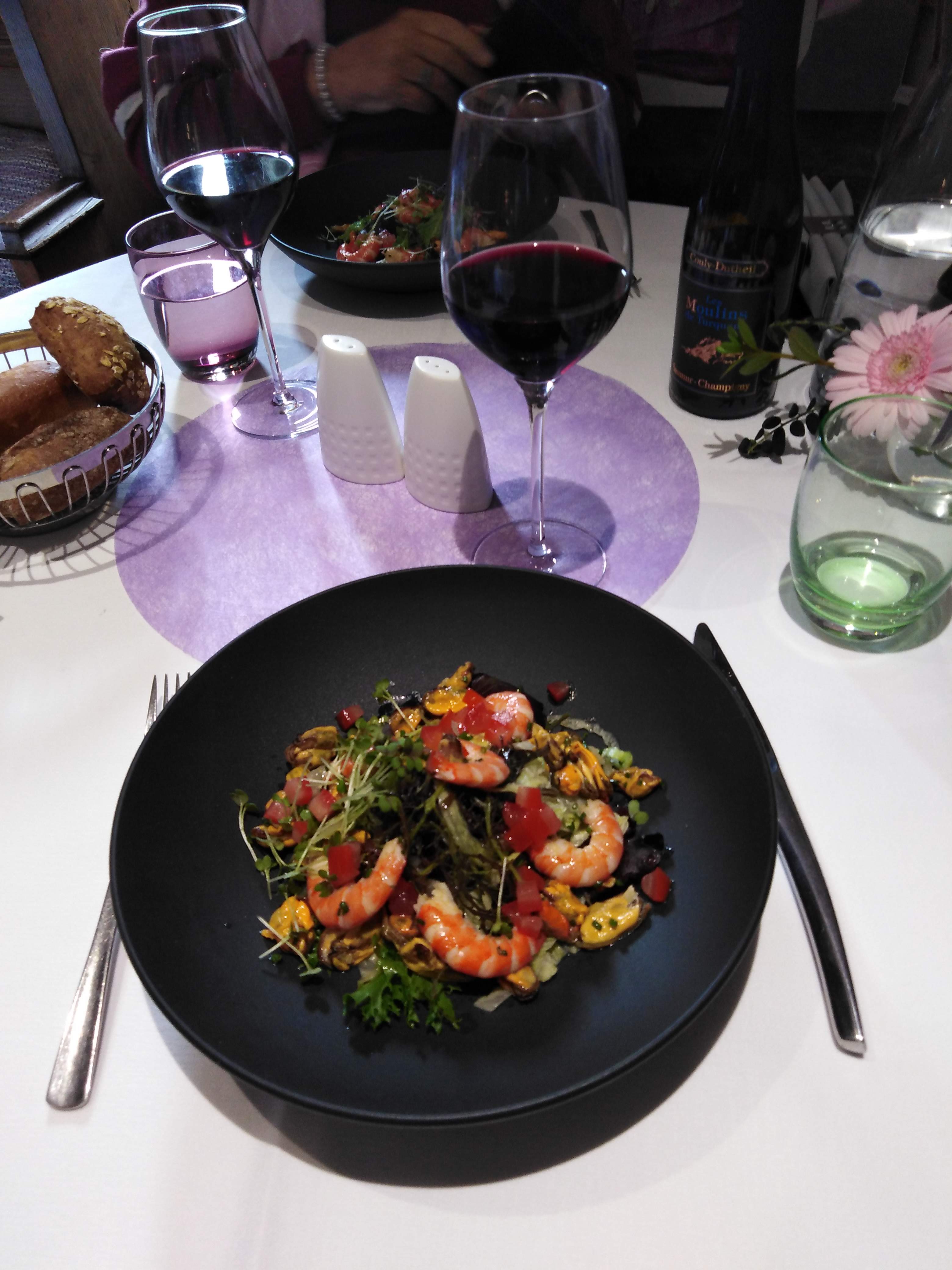 Apéritif suggestion du jour non apprécié, un jus de fruits ni plus ni moins, je n'ai pas senti le goût d'alcool.Vin sorti de cave donc très froid, dessert annoncé a la banane mais il était plus a la mangue et je déteste... entrée très bonne, plat aussi.mon mari déçu par le pied de cochon au boudin noir qu'il a trouvé écoeurant