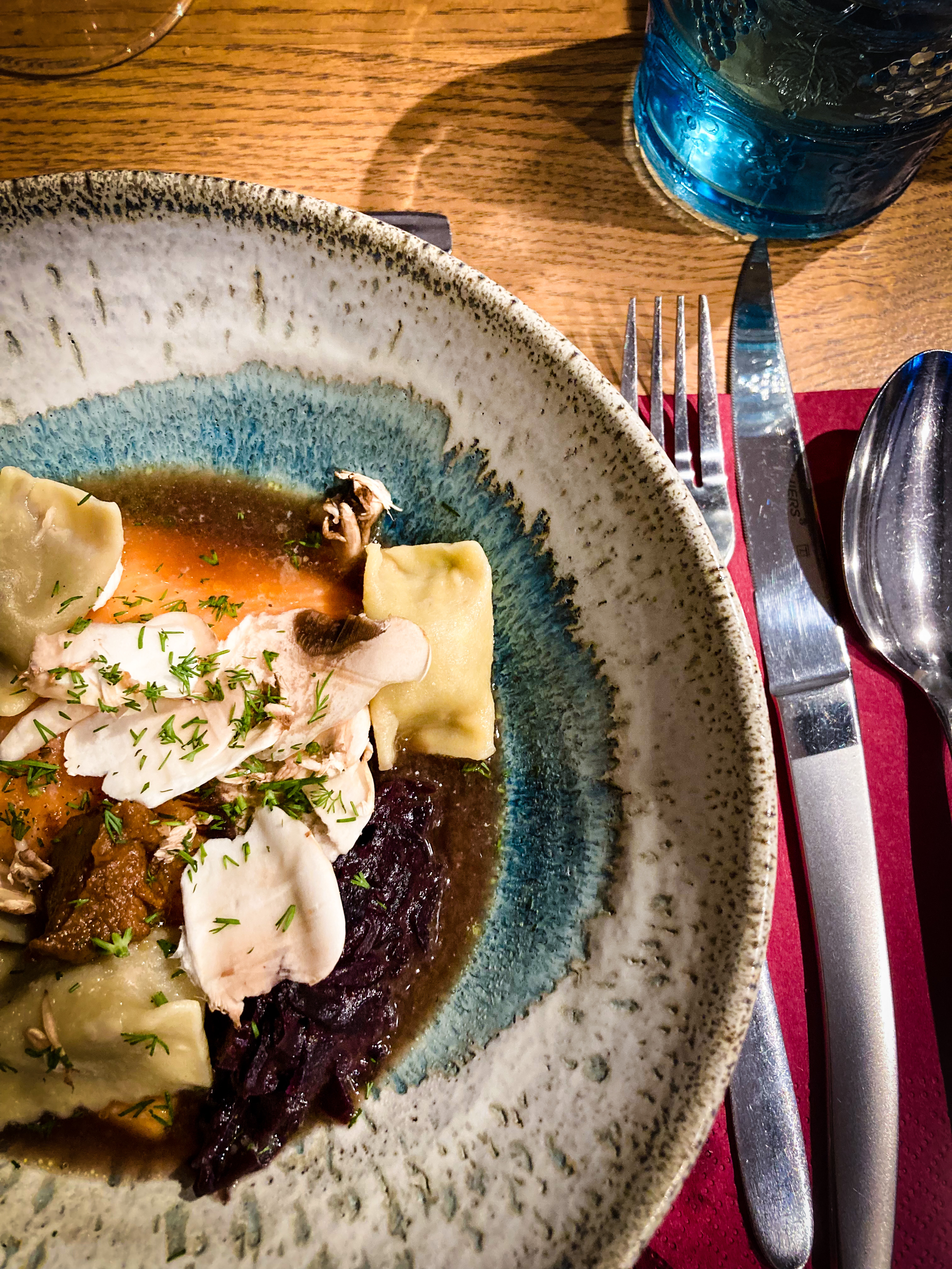 Restaurant, en bord d’étang , dans son écrin de verdure, entouré de belles montagnes. Un vrai p’tit coin de paradis au calme où il est bon laisser filer le temps. Une fois dit cela, on est déjà très bien mais c’est sans compter le chaleureux et souriant accueil de Maredsou et les excellentes assiettes de Jocelyn, tous deux enfants du pays. Côté Salle, une vaisselle vintage dépareillée pour le charme et l’authenticité du « comme à la maison » (je me suis vu choisir ma place par rapport à un verre qui était identique à celui que j’avais à table chez mes parents gosse) Côté assiette, une cuisine du cœur, régressive à souhait avec systématiquement un twist qui sublime le plat. Si les assiettes peuvent paraître simples de prime abord, elles cachent pas mal de technicité. Les cuissons sont parfaites, les assaisonnements justes et l’équilibre des goûts simplement dingue. Au final, à l’image du Chef, les plats sont authentiques et percutants. . Côté vins, la carte fait la part belle à l’Auvergne et m’a fait revoir ma position sur mon beau terroir. . Bref, vous l’aurez compris cette table est une très grosse pépite en devenir qu’il va falloir suivre de très près.