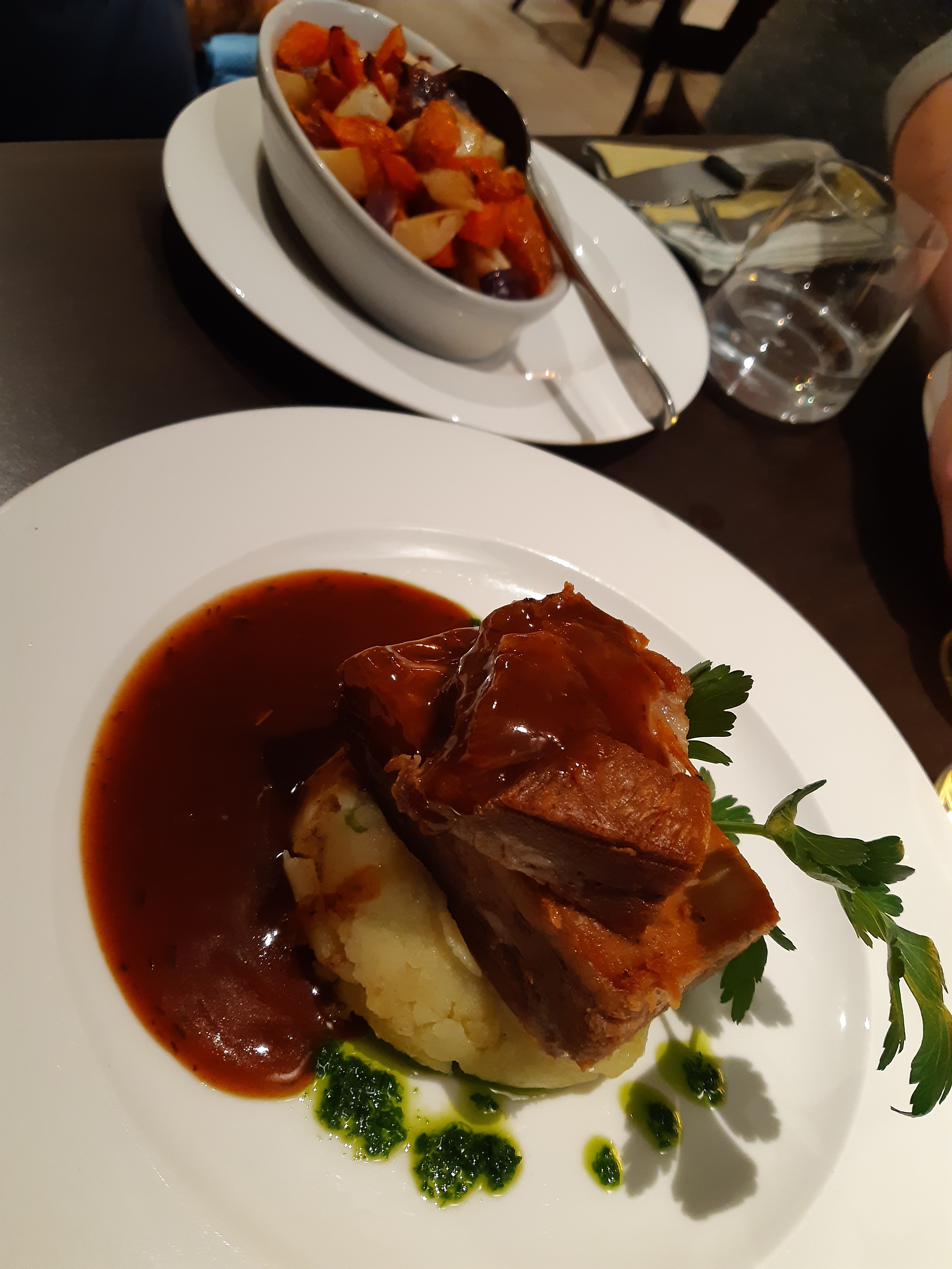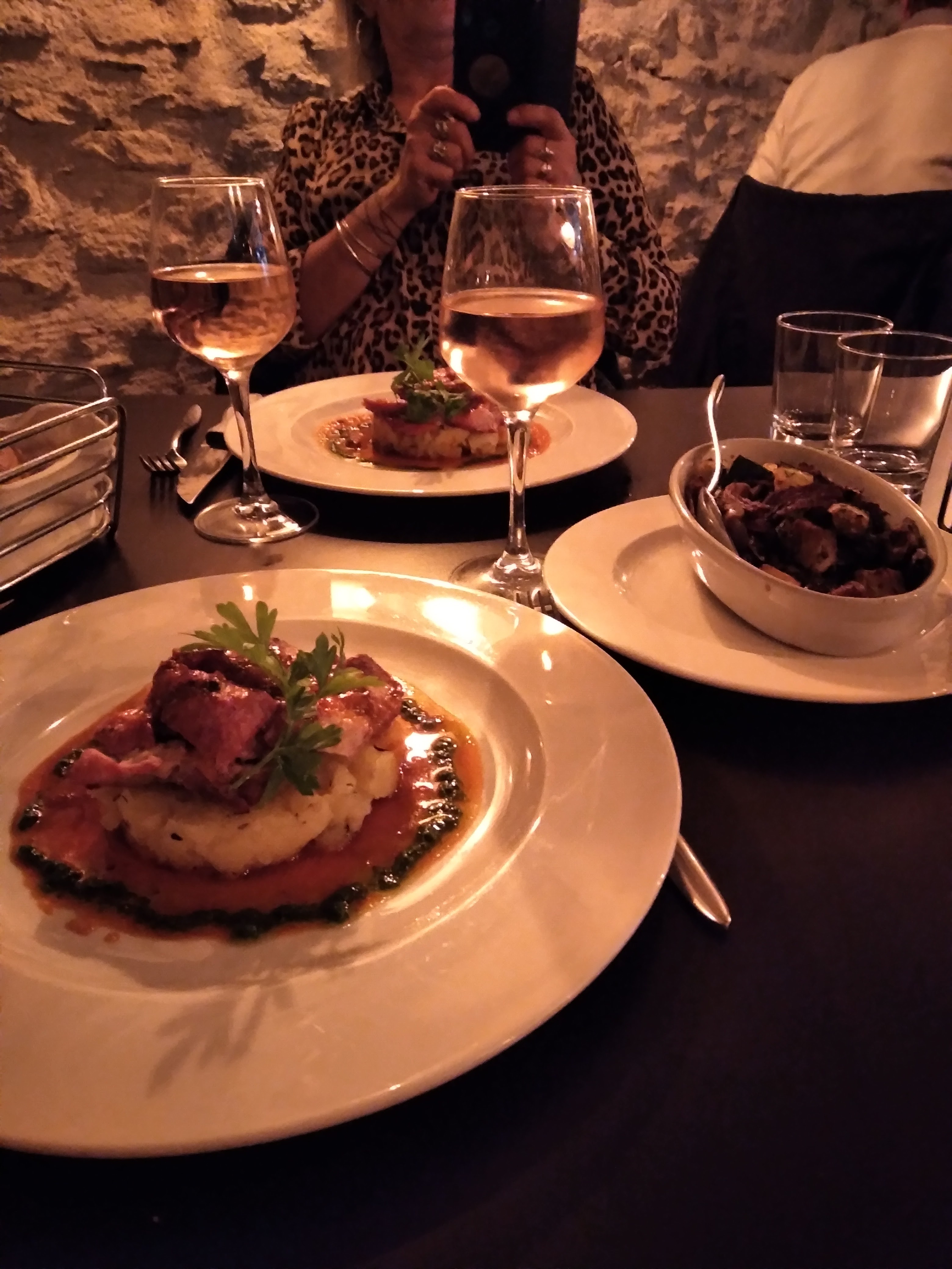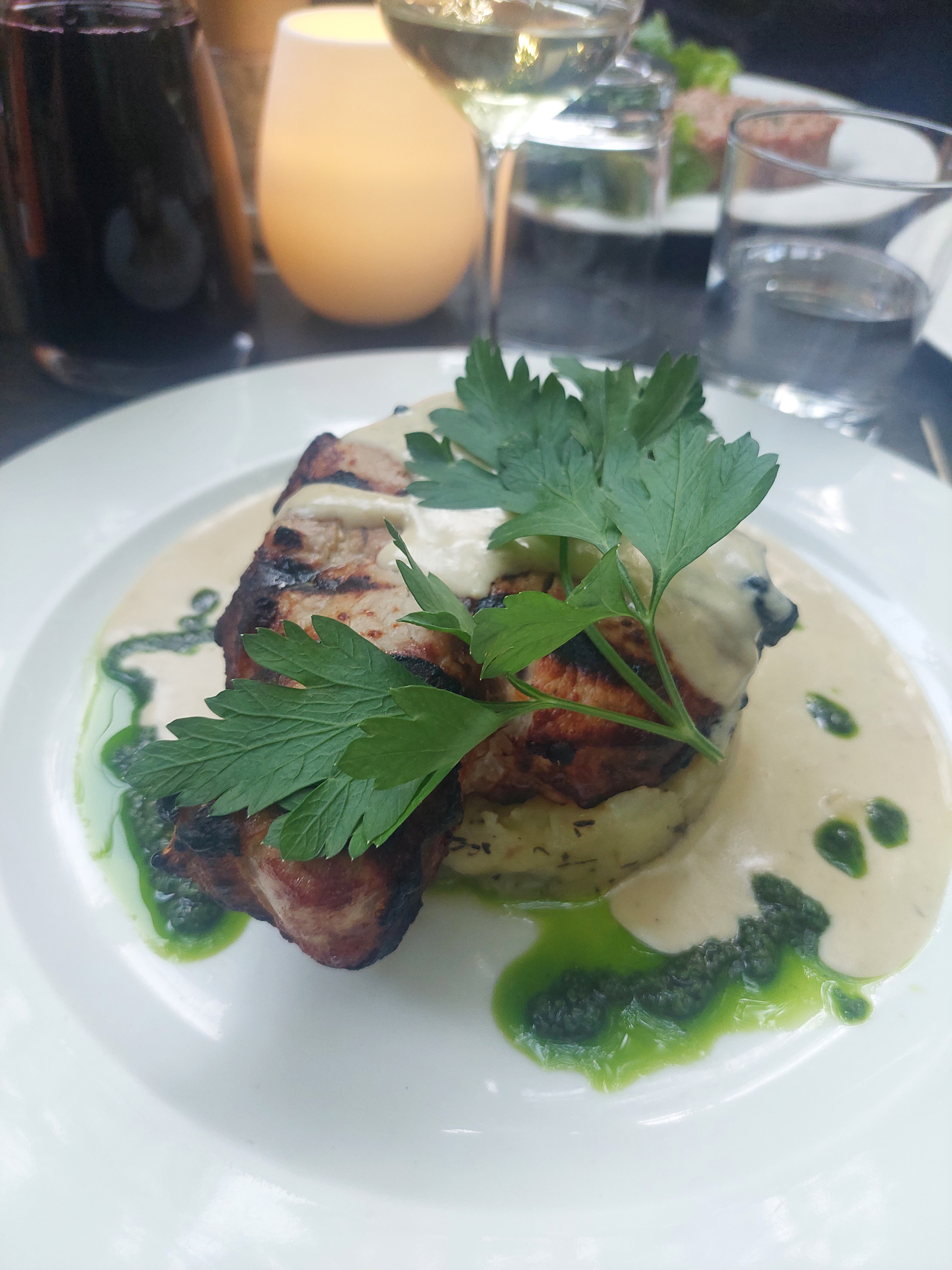 Repas incroyable ici! Nous avons tout aimé. J'ai eu la poitrine de porc avec des légumes rôtis et ma femme le poulet printanier rôti avec des frites. Tout cela est si savoureux. Réservation recommandée mais nous avons pu nous asseoir sans droit à l'ouverture