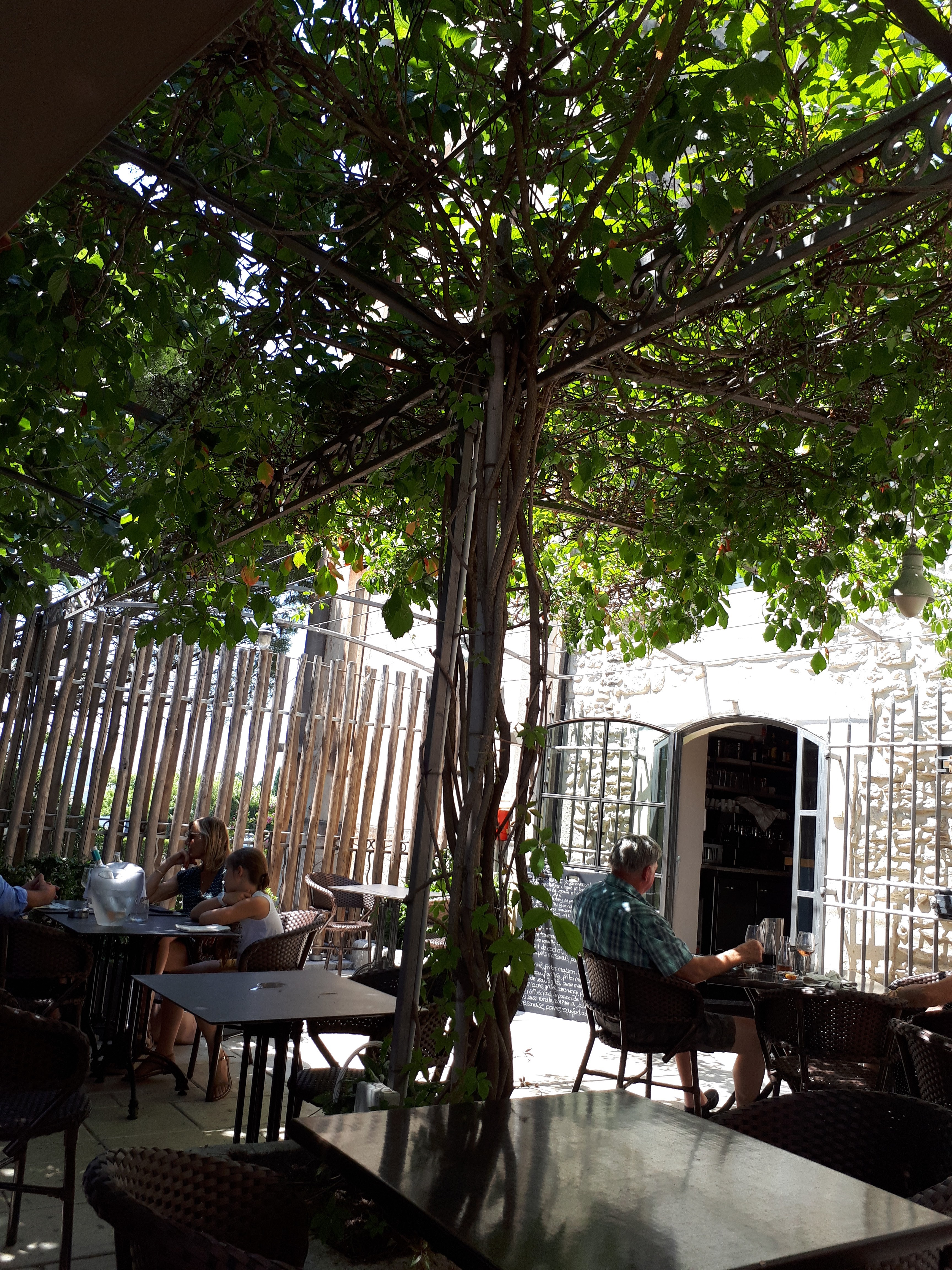 Une terrasse magnifique à l’ombre d’un figuier ! Ambiance très conviviale. La cuisine est toujours aussi excellente (depuis 6 ans a chacun de nos séjours à St Rémy)