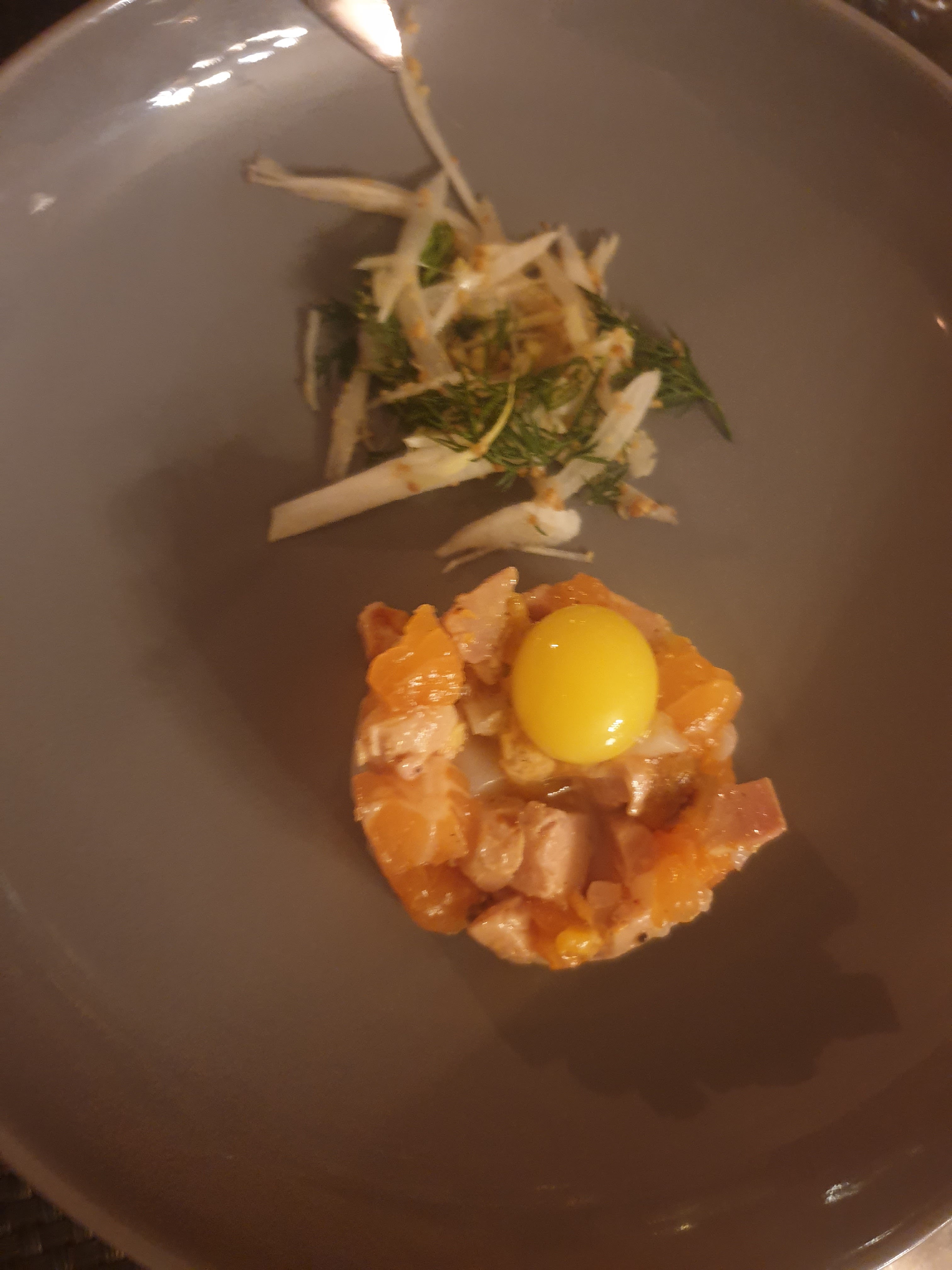 C'est Terrible, vivant d'une ancienne étoile Michelin, j'ai commandé du saumon Gravalax en entrée, il était mélangé avec des lanières de carottes et quelques cuillères de purée de tomates en boîte, qu'est-il arrivé à l'assaisonnement avec des cornicons ou des câpres, ou des marinés végétarien, ennuyeux et sans goût, mon mari avait les huîtres qui étaient délicieuses, mon corps principal de Saint-Pierre, était trop cuit et servi avec une purée de carottes et de pommes de terre et du CUMIN !!!!!, je dois dire que c'était horrible, mon mon mari avait du Turbot et c'était juste ok. J'ai rendu mes deux plats à moitié mangés et on ne m'a jamais demandé si tout allait bien ! C'est le pire type de restaurant, seulement quatre tables occupées, le chef ou le patron ne se souciant pas de savoir si les convives ont apprécié leur repas ou non, prennent l'argent et s'enfuient. Les serveuses étaient très agréables et je leur ai laissé un pourboire, elles ne cuisinent pas et ne sont pas propriétaires du restaurant. Un si beau cadre, une nourriture vraiment horrible, je cuisine tout le temps, je ne suis pas un chef, mais je présenterais une meilleure nourriture que celle-ci. A éviter à tout prix !