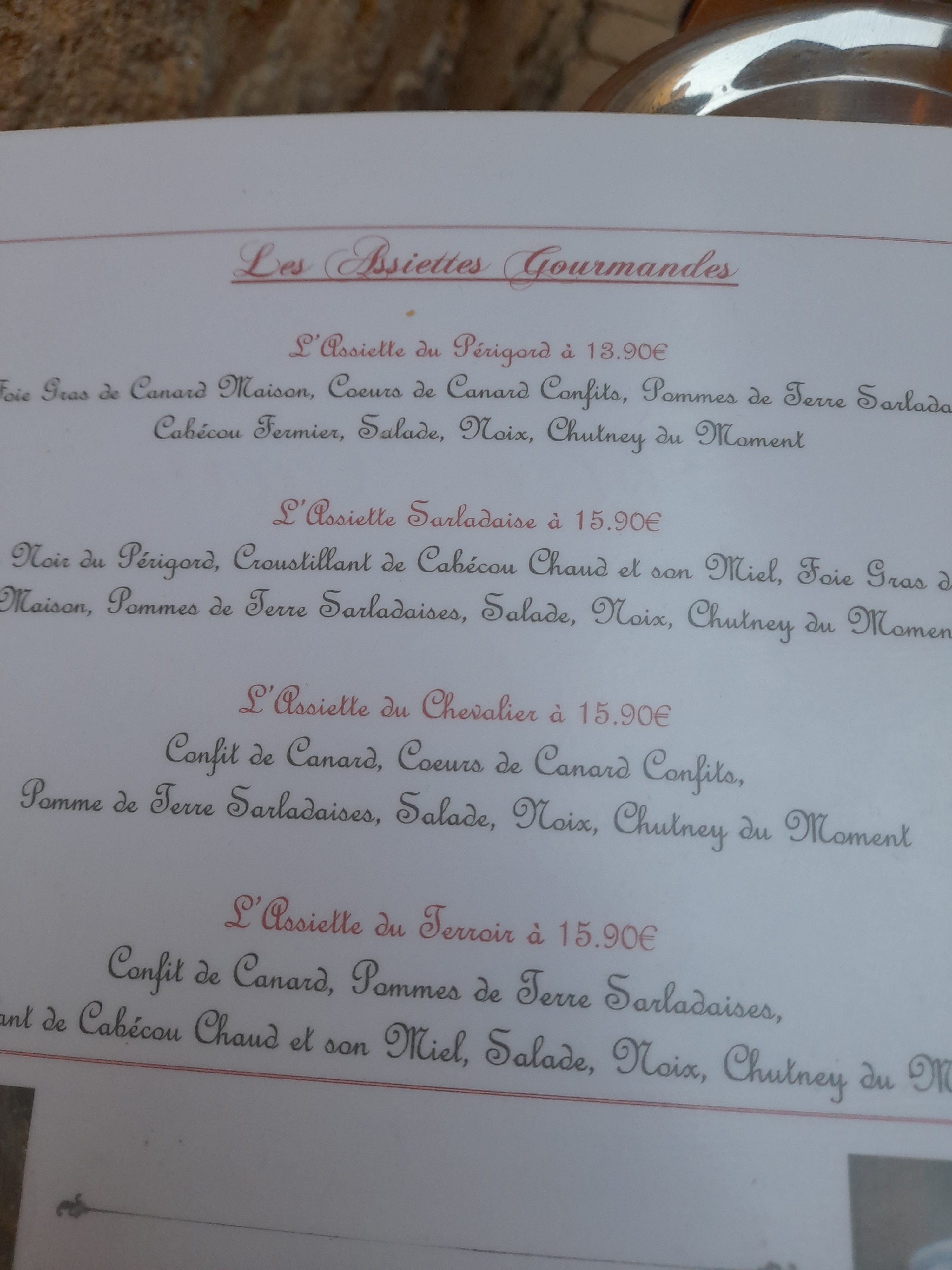 Le restaurant est situé dans une jolie ruelle typique, sans passage. Nous avons pris l'assiette sarladaise et une assiette du Périgord, c'était copieux et très bon, à des prix abordables. Nous avons pu manger à l'extérieur c'était très agréable. Service agréable.