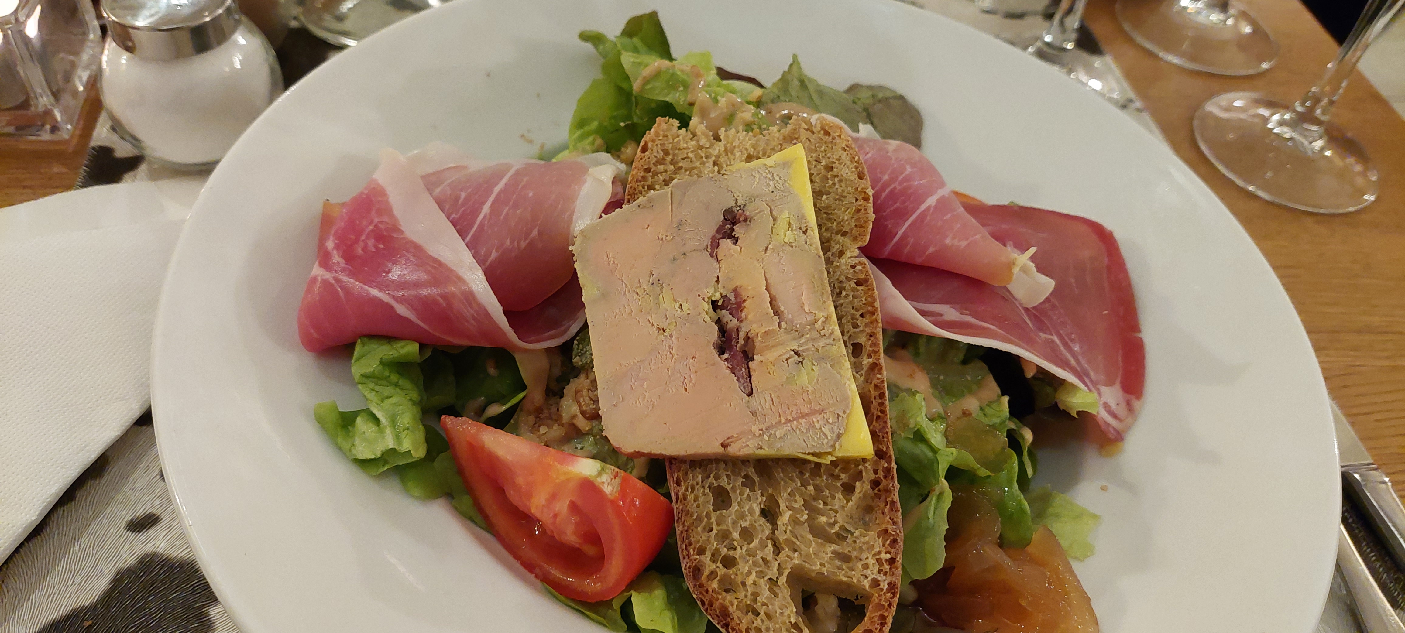 On reste sur ça faim, pour la ville soi-disant gastronomique... La salade de cantine avec sa tomate... le foie gras juste la tranche avec du pain... la tourtre, un feuilleté trop cuit... le dessert hypersucré... c'est pas cher sur la carte mais enfin de compte si.... Je fais mieux chez moi, c'est le restaurant rapide du coin j'espère car sinon Sarlat... bah y a mieux ailleurs... je pense au Berry et à l'Auvergne. Par contre service et cadre très bien.