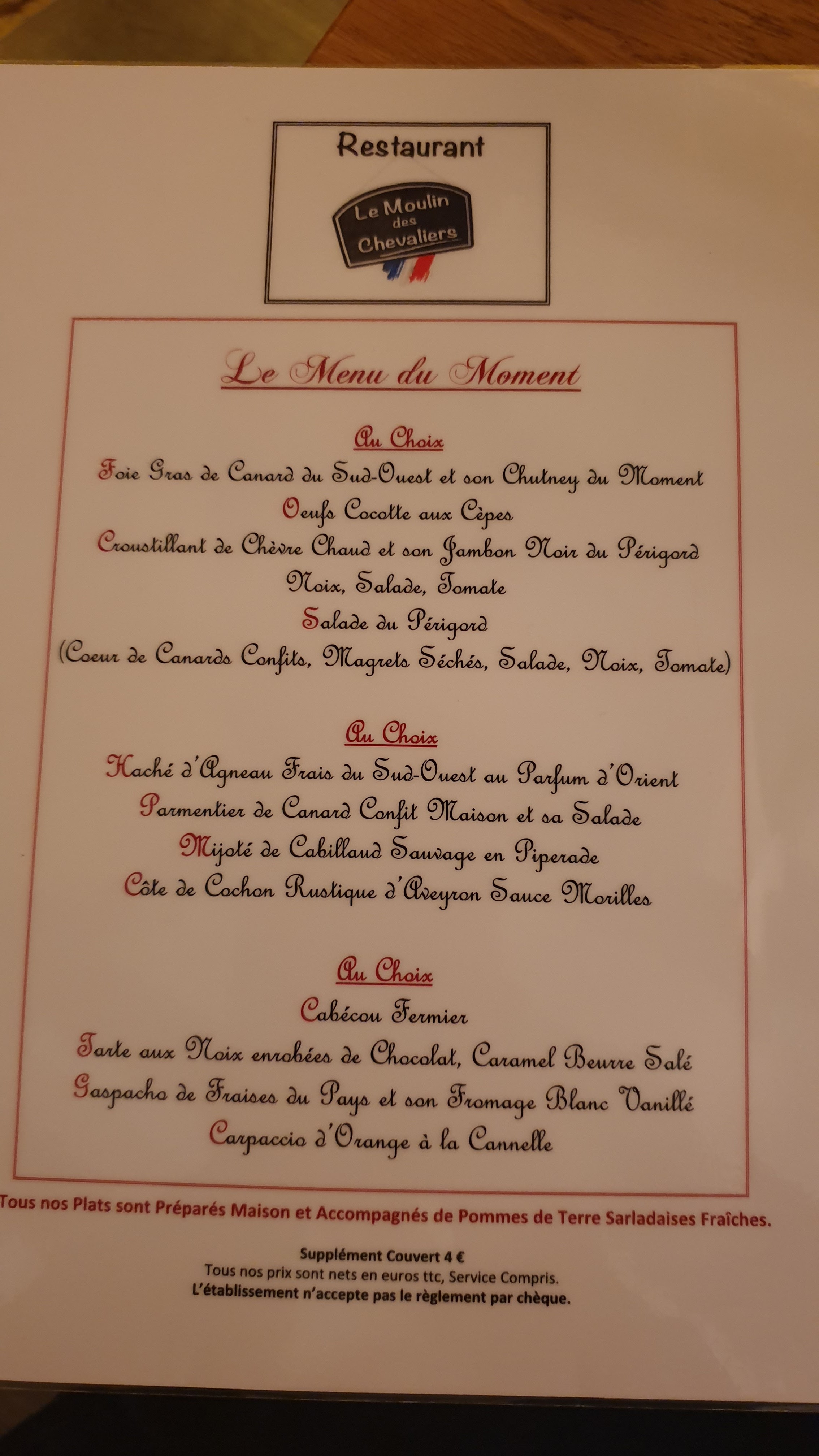 Lorsque l'on va à Sarlat, on ne peut pas louper la tripautée de restaurants attrape-touristes dont les menus et les prix sont bien alignés les uns avec les autres. Nous avons tenté Le Moulin des Chevaliers d'après les notes sur internet. Pour être honnête ce ne fut pas un repas transcendant. Cependant nous avons été surpris par la rapidité du service, la présentation et les goûts classiques mais maitrisées. Le menu à 20€ avec vin respecte les classiques de la région. Le service était efficace et le personnel agréable. Bonne expérience dans ce restaurant malgrè les appréhensions.