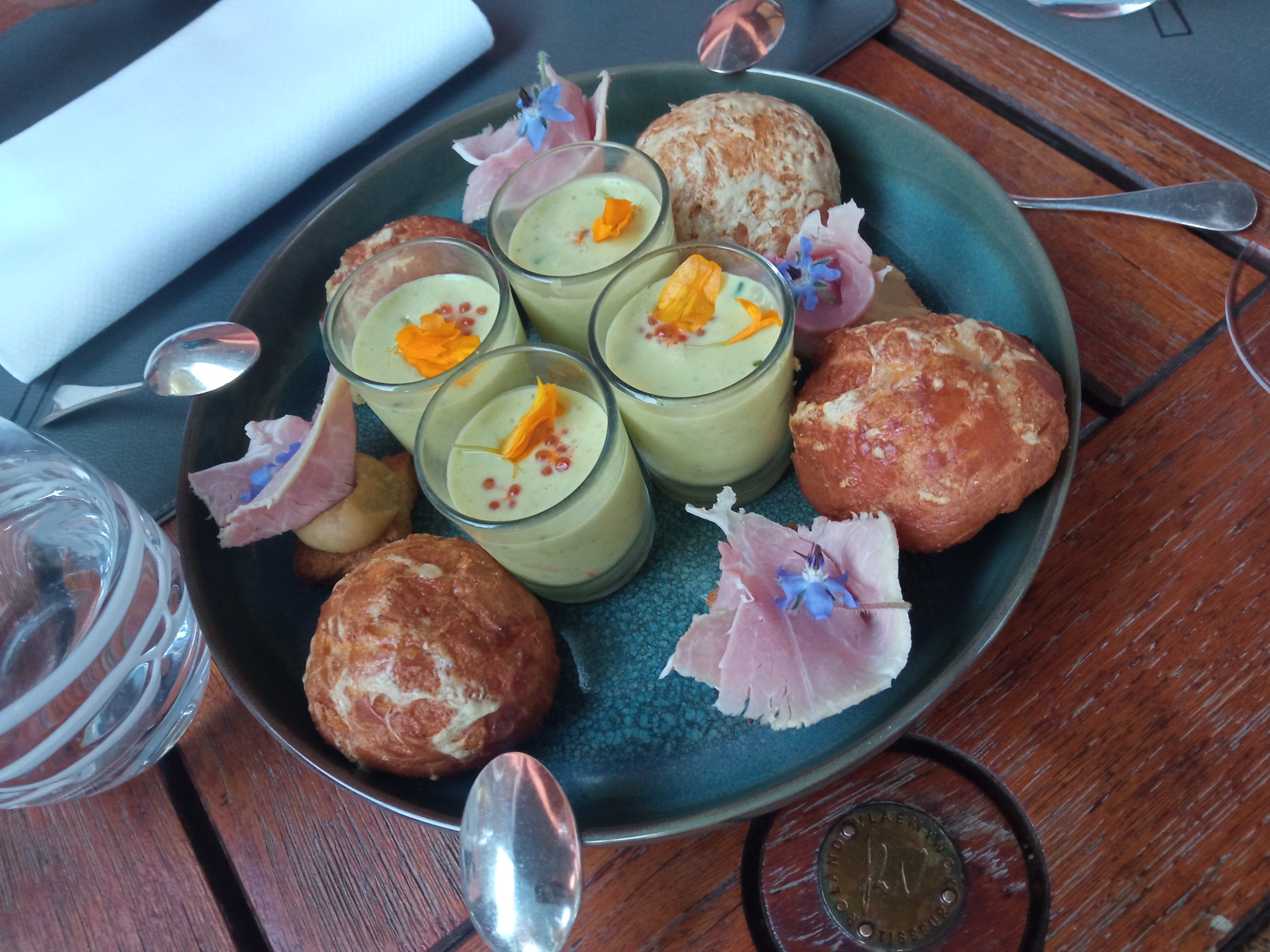 Restaurant à 2 un samedi soir de week end de vacances. Beaucoup de gens étaient à l hôtel. Salle de restaurant : trop blanche, trop lisse à mon goût. Il manque de la couleur, de la personnalité, de la chaleur. Service : efficace, aimable. Mention spéciale pour le serveur. Cuisine : un seul menu avec 2 choix en entrée, 2 plats et 1 seul dessert. Menu qui change tous les 15j, signe de qualité. Quelques petites bouchées pour l apéritif : très bien Mise en bouche salade d endives recouverte d un espuma de jus de moules: espuma trop épais, pas aerien, en trop grand quantité et qui a peu le goût de moules. Repas : C est coloré, très bien présenté mais qqes bémols en ce qui me concerne . Entrée avec de la truffe qui n apporte rien puisque elle n a aucun goût. Sinon entrée goûteuse avec des saints Jacques cuites comme il faut . Poisson : omble et sa garniture qui manque de peps. 3 minuscules écrevisses et sauce pas assez relevée Dessert qui était très bon. Mais dommage qu il n y ait pas le choix de desserts. Pain sûrement coupé à l avance parce que un peu sec. 50 euros le menu...j attends un peu plus : plus d'originalité, de découverte et de goût [ pour le plat principal].