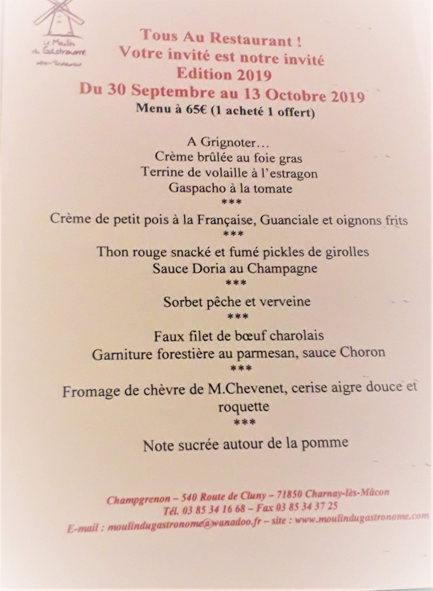 Accompagnées de nos maris, mon amie et moi avions décidé de fêter nos anniversaires au Moulin du gastronome à Charnay les Mâcon et de bénéficier ainsi de l’opération « Tous au restaurant, 1 repas payé, 1 repas offert » Le menu (choisi par le chef) est à 65€. La carte des vins nous est proposée ou un forfait pour 17€/personne. Il comprend un apéritif maison (crémant+crème de griotte), un verre de Mâcon blanc, un verre de Mâcon rouge, un verre de crème de framboise servi avec le dessert et un café. Le menu est copieux, les assiettes sont magnifiques et les mets délicieux ( cf. photo du menu). Nous avons eu le plaisir de rencontrer le chef et son second quelques minutes en fin de service et ainsi de pouvoir les féliciter et les remercier pour leur prestation. En outre, une délicate attention nous avait été réservée en fin de repas pour célébrer nos anniversaires : une ravissante sculpture en sucre teinté que nous avons grignotée avec délice. Seul petit bémol très surprenant car c’est vraiment le seul point qui dénote et qui nous a choqué mon amie et moi : Dans des sanitaires pourtant très propres, ravissants et très bien agencés : Un radiateur en grande décrépitude dont la peinture est écaillée et constellée de taches de rouille ! C’est dommage car tout était parfait ! Néanmoins, nous avons passé une excellente soirée et nous avons déjà prévu de revenir. Je recommande cet établissement