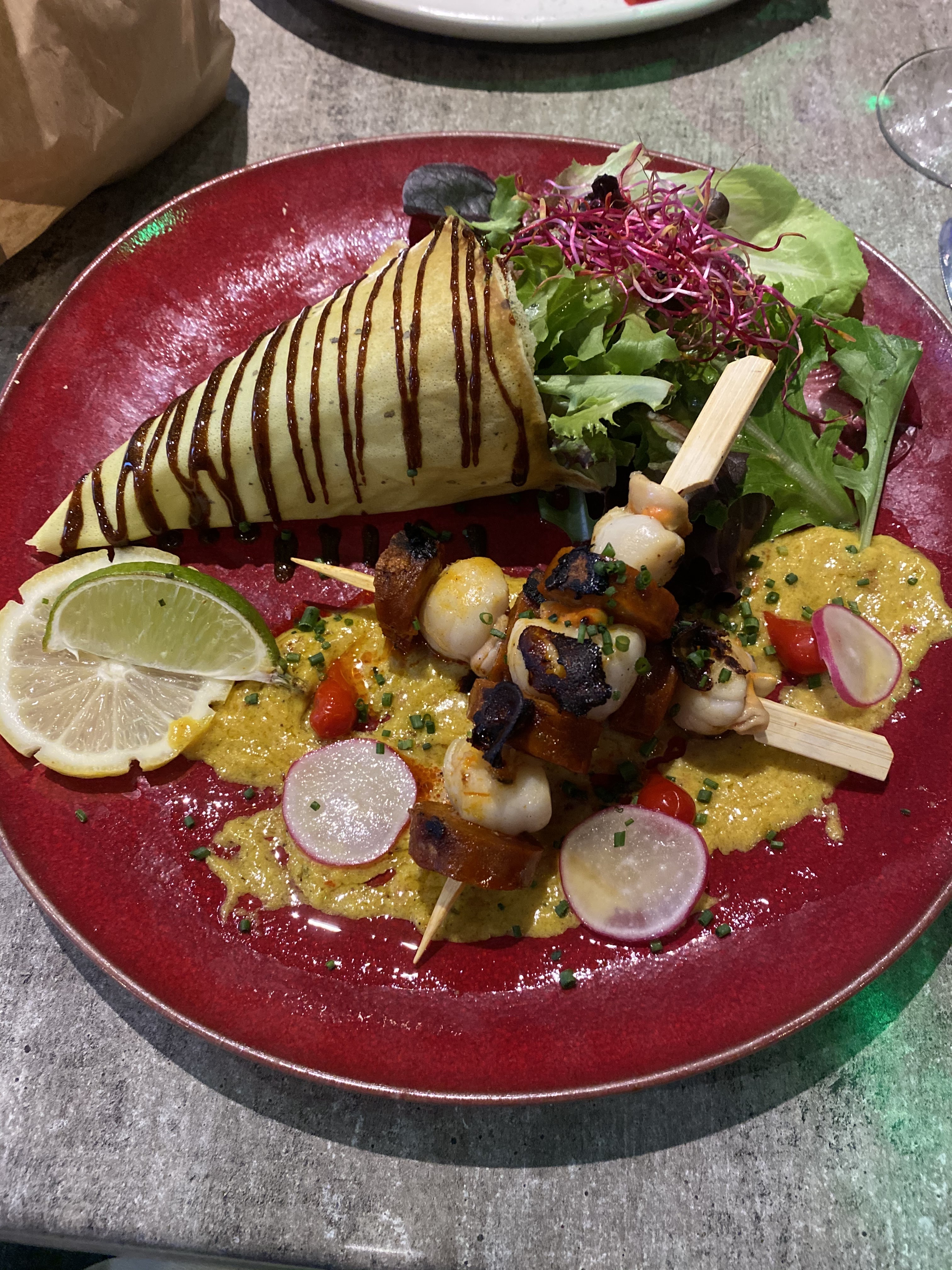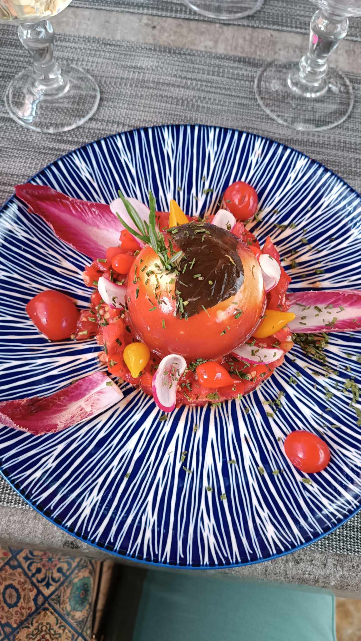 Déçu . La brochette de noix de st Jacques au chorizo n a que le nom .. ils doivent pas savoir ce que c est une noix de st Jacques ( suis breton ) ils nous ont servis des vulgaires noix de pétoncles La sauce de la cote de veau très fade J ai demandé un verre de rouge de Provence, infect... ..enfin bref ce n est plus ce que c était ... Dommage car cette endroit est splendide