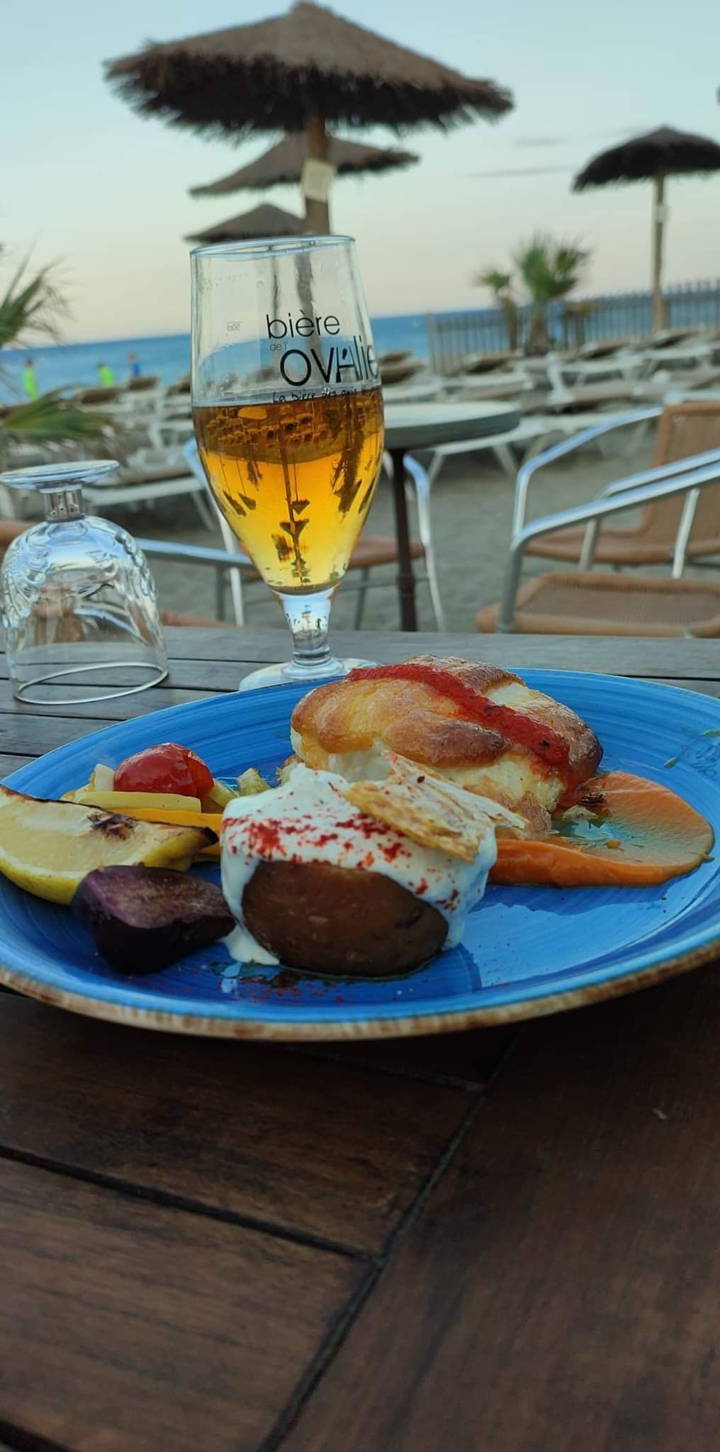 Côté restaurant : Rien à dire, les plats sont bien préparés et la qualité correcte, les tarifs légèrement plus élevés que dans d'autres resto de plage à valeur égale.(+-10%). Côte plage, transats, c'est un peu plus le fouillis. La plage n'a pas été passé au râteau, les transats alignés un peu à l'emporte pièces, pas de service de plage et les clients ne correspondent pas à nos critères(manque de discrétion et de respect). En bref, bien pour manger et boire un coup.