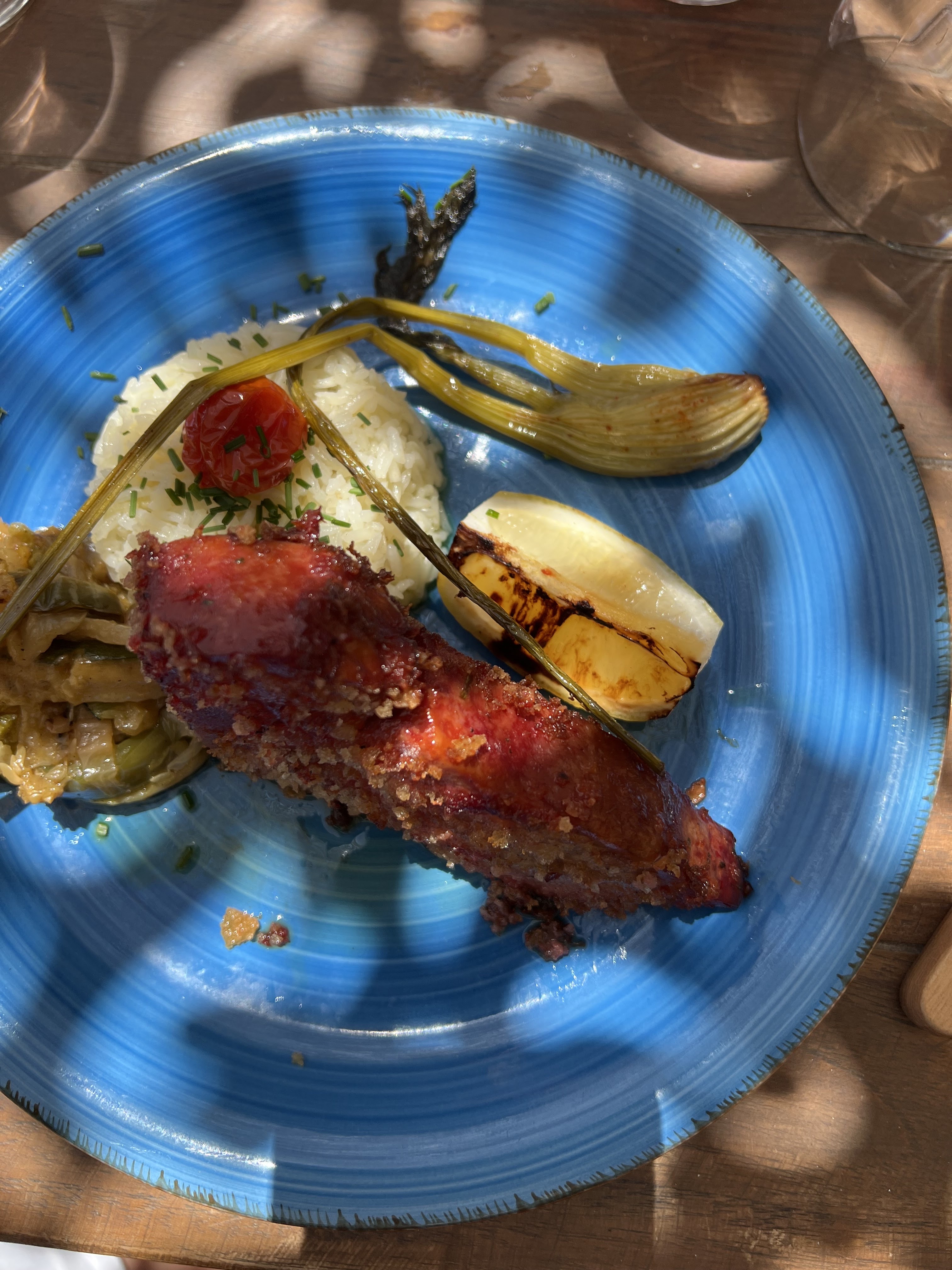 Étant habitué à venir plusieurs fois chaque année au mouton bleu, nous attendions avec impatience l'ouverture. C'était le 1er jour, nous nous attentions donc à la longue attente et aux petits oublis (pain, siège pour enfant...). Des nouveautés étaient annoncées, mais elles étaient très décevantes. La nouvelle carte des tapas est plutôt bonne, mais nous fait regretter un peu l'ancienne, plus copieuse et moins cher. Ce qui nous a choqué est l'arrivée de de nos 2 salades de chèvres : 17€ pour un petit tas de salade et 3 rondelles de chèvre, rien d'autre (photo). Nous nous sommes sentis un peu bêtes et arnaqué. Le plat seiche au chorizo, qui était, les années précédentes, très bon, s'est transformé en une salade dd riz froide également décevante. Salade césar et glaces étaient plutôt bons. Mais dans l'ensemble, très déçu de la nouvelle cuisine, quel dommage, nous venions souvent pour le bon rapport qualité prix du restaurant, cela ne sera plus le cas. Nous nous contenterons de boire un verre et prendre le soleil.