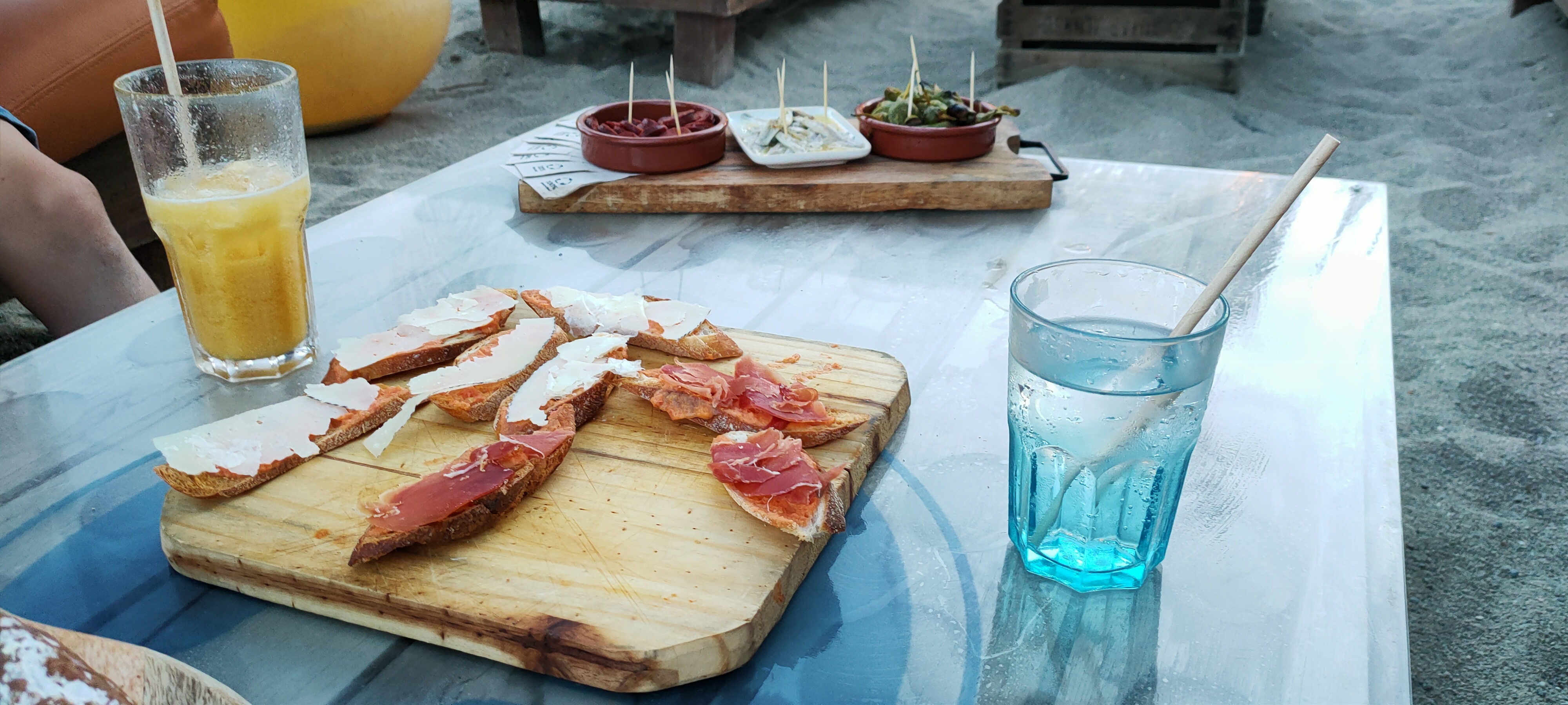 Le côté bar tapas est vraiment Top. Les pieds dans le sable dans des banquettes avec vue sur la mer et accès direct. Tapas excellents Fuet et melon, pane con tomate avec Fromage Manchego ou jambon cru, anchois marinées, poivrons préparés et grillés, Chorizo chaud. Très bonne sangria. Ambiance au top avec concert de musique. (Écouté Caramelo) Le seul bémol : pas possible de prendre un coupe glacée côté bar tapas car vendues seulement côté du restaurant. Dommage et on n'a pas vraiment compris pourquoi.