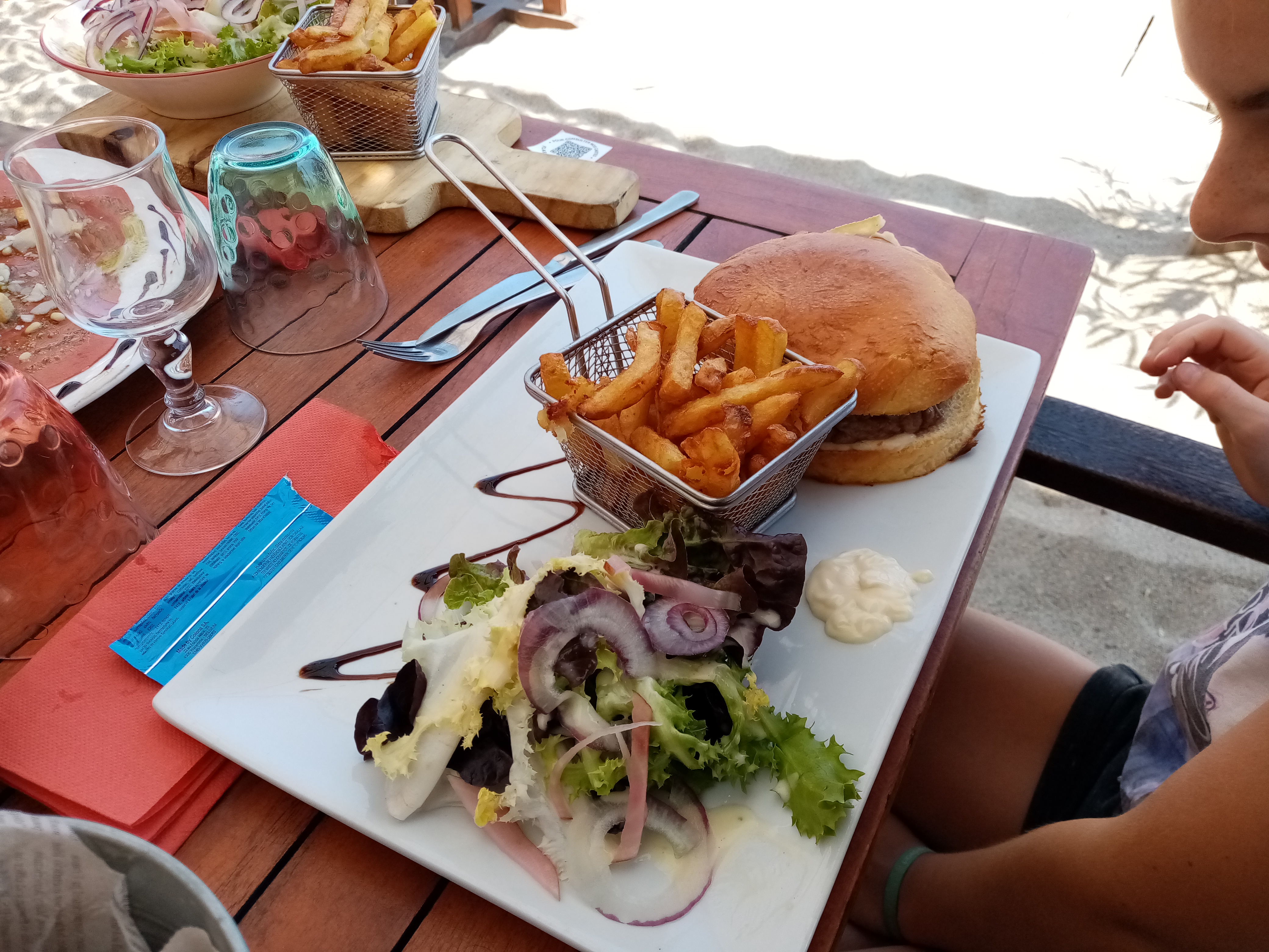 Cadre sympa Mais attente 30 minutes avant apero et une heure avant le plat . Et hamburger etouffe chrétien.. Je devais boire de l'eau pour faire passer la bouchée. Peu de restaurant dans le coin et casi le seul sur la plage donc énorme attrape toursite.