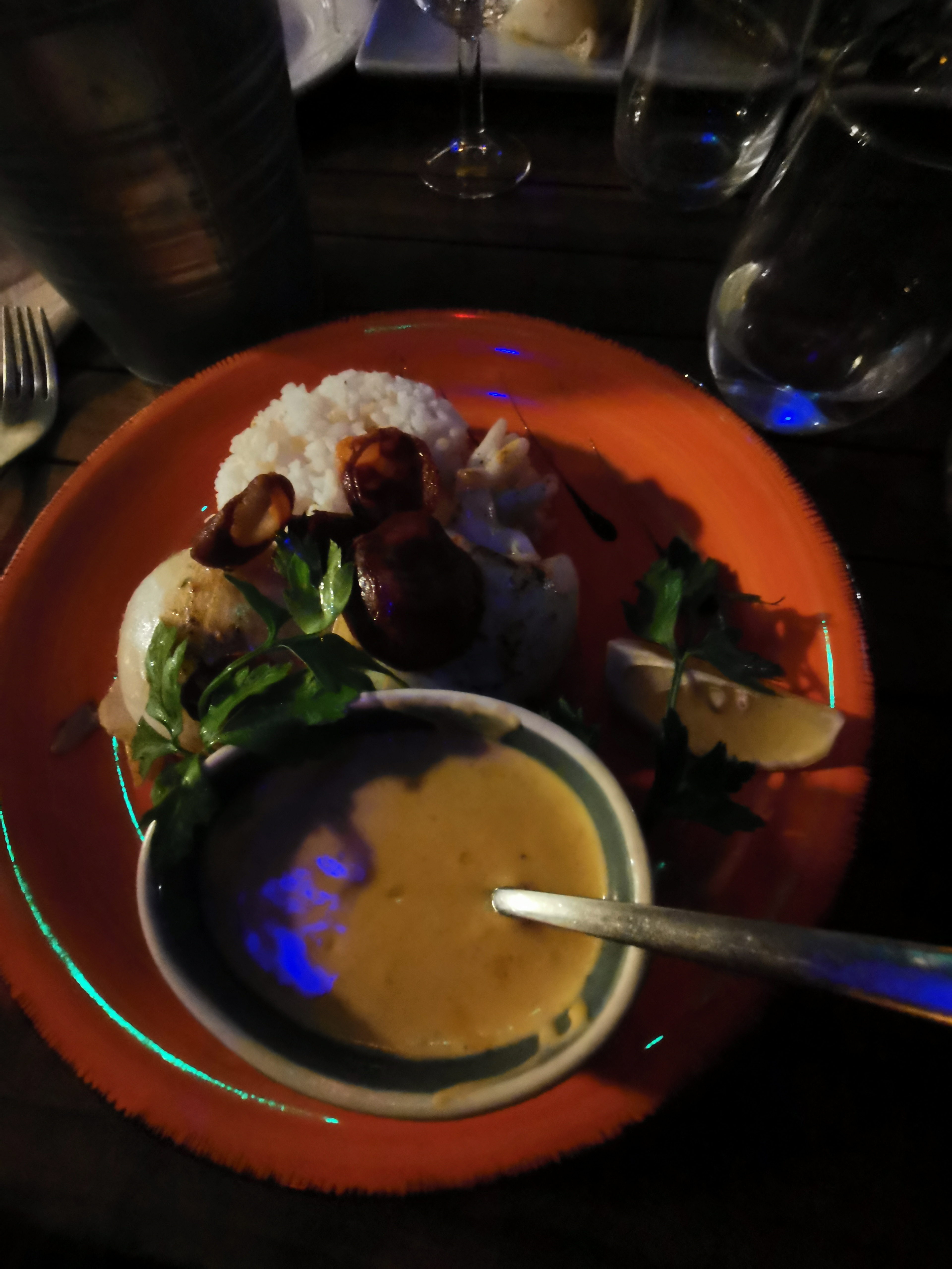 Bons cocktails avec ou sans alcool, Bonnes cuissons, quantités copieuse, Nous avons vidé nos assiettes, la sauce Morilles avec l'entrecôte avec de vrais frites maison vaut le détour ! Les Chipirons étaient parfaits. Mon épouse a pris de la seiche elle a apprécié. Nous avons été bien servi. Merci.