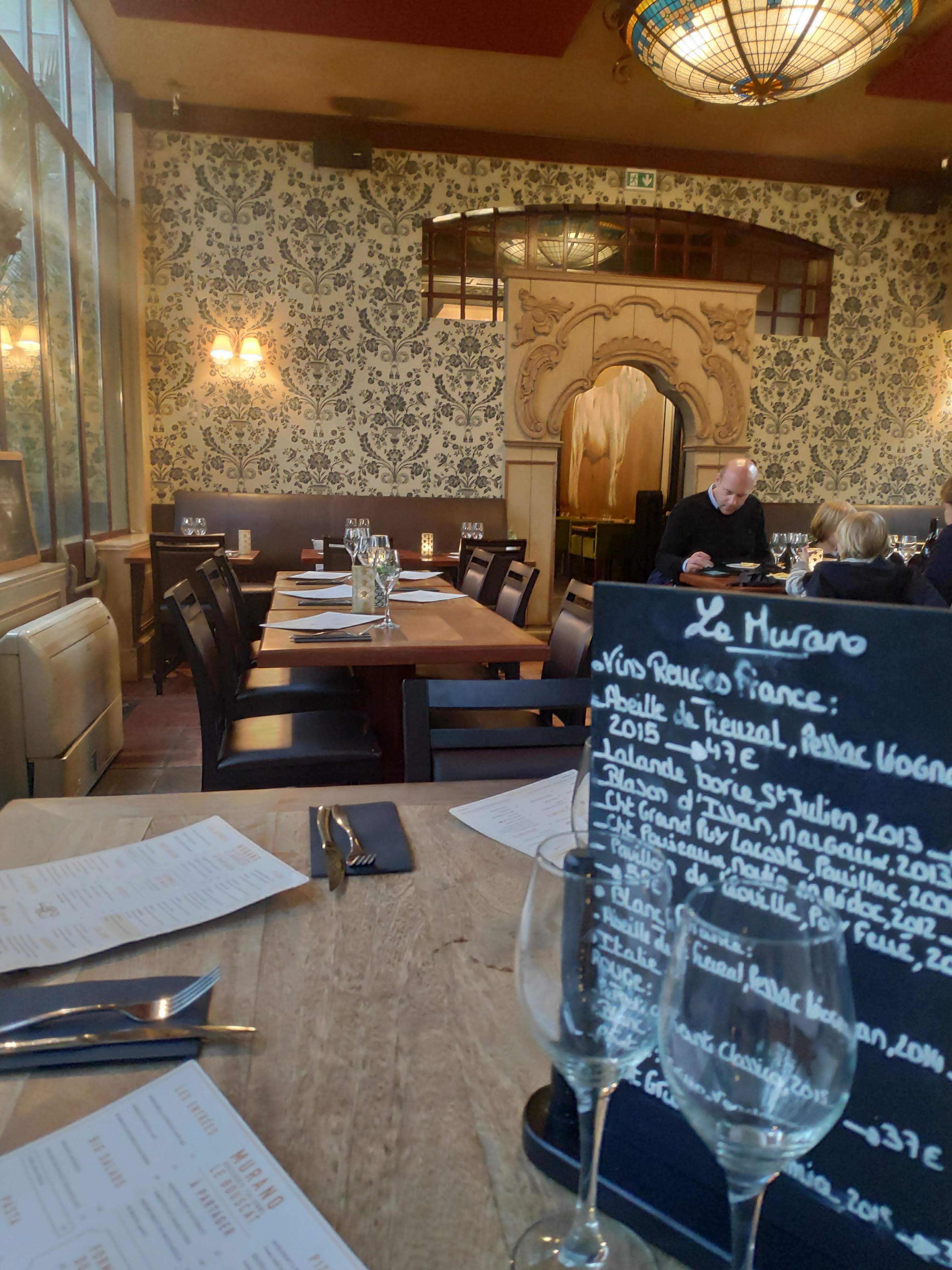 Depuis que je suis arrivé à Bordeaux j'entends parler du Murano et j'ai enfin trouvé l'occasion de découvrir ce restaurant. Forcément j'en attendais beaucoup en passant les magnifique grilles. L'endroit est tout juste sublime et hyper chaleureux. Les serveurs très pro et souriants. Malheureusement mon expérience a été un peu détériorée par des petits détails. Trop de petits détails : carafe ebrechée, banquette qui tient pas, bar abîmé ou salade terreuse, j' ai un peu déchanté. J'ai pris une escalope à la truffe qui était très bien cuite avec des vraies truffes. C'était excellent. Le dessert m'a un peu moins marqué. J'ai trouvé le rapport qualité/prix un peu élevé. Mon avis est évidemment subjectif et biaisé de par les fortes attentes que j'avais. Le Murano est par exemple dans le top 3 des restaurants Bordelais préférés de ma compagne.